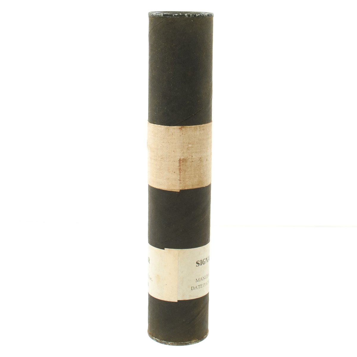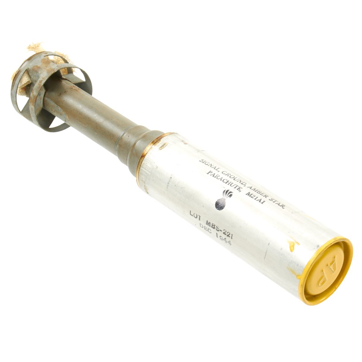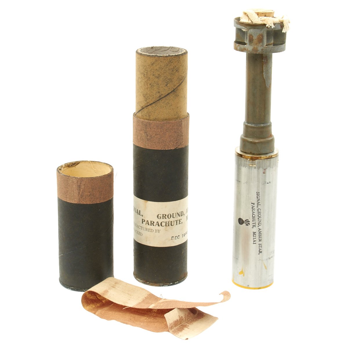 Original Items: Very Few Available. Genuine unissued 1944 dated M21A1 Amber Signal Flares still sealed in their original cardboard transit tubes. These are designed to be fired from a M1 rifle, to a height of 200 to 300 meters. The flare will then hang from a small parachute and float to the ground while illuminating a large area. Measures approximately 1" long and 2" in diameter.