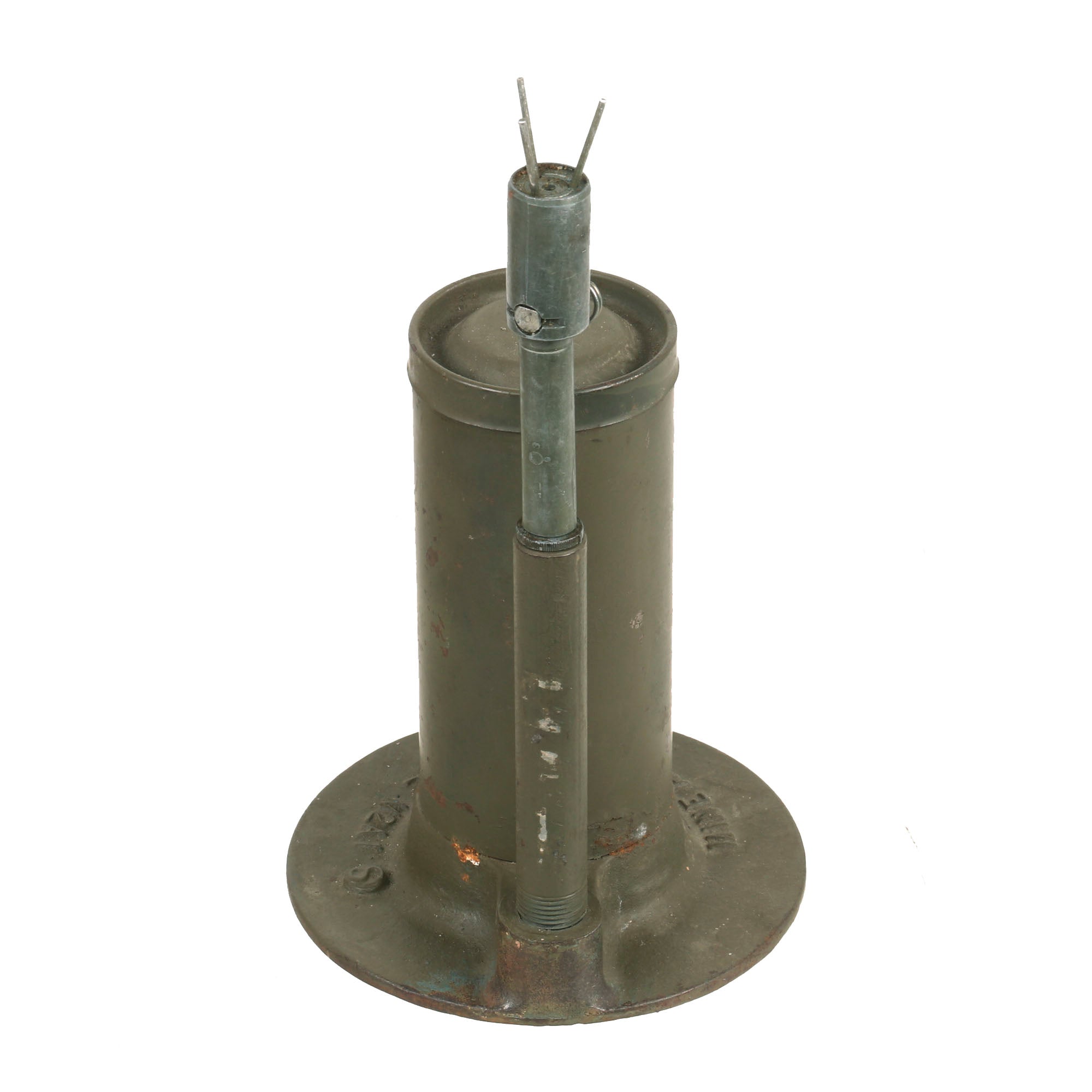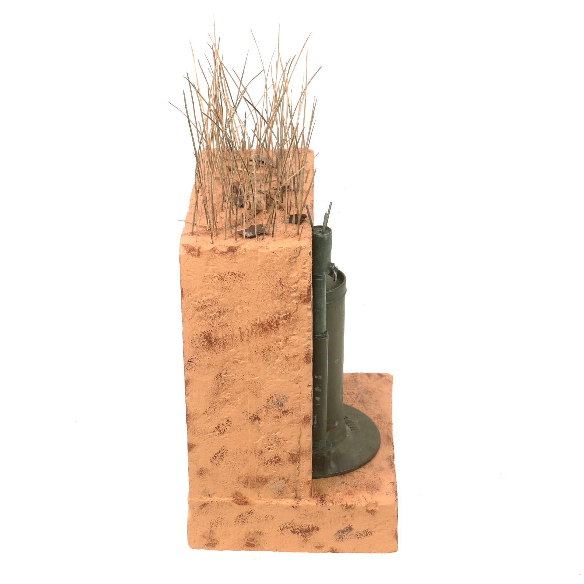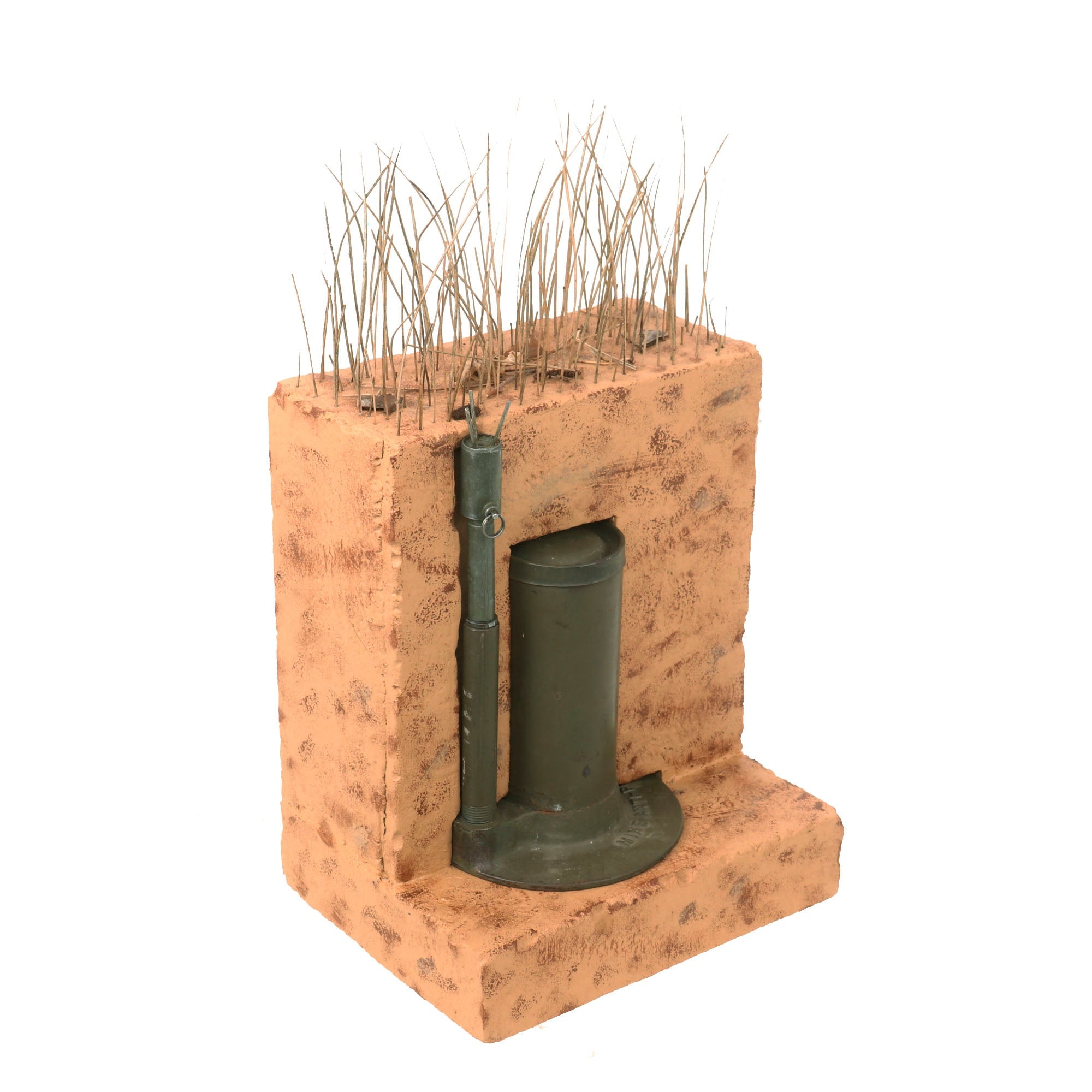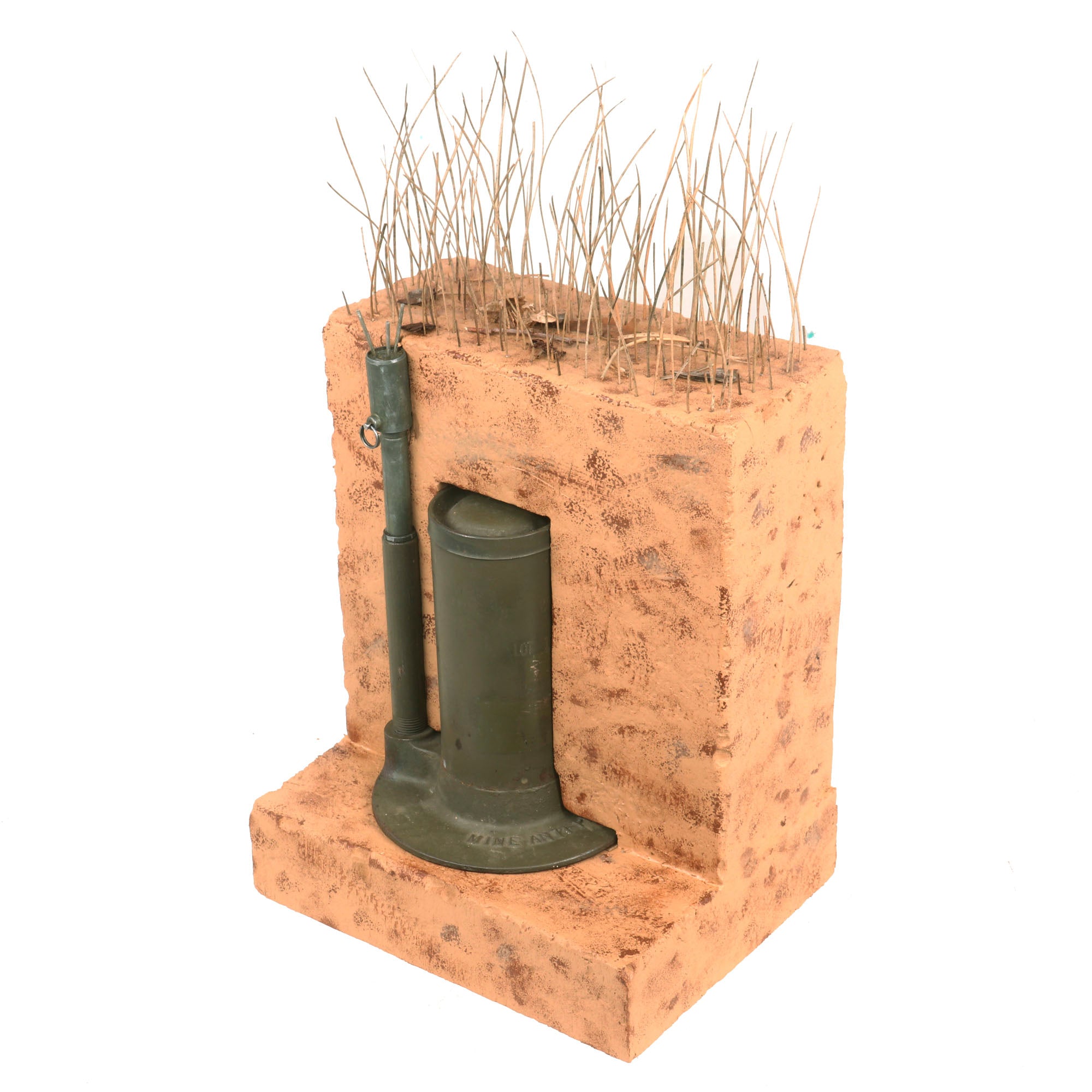 Original Item: Only One Available. This M2A4 Bounding AP Mine with M6A1 Fuse is completely inert in compliance to the BATF guidelines on inert firearms and explosives and is NOT AVAILABLE FOR EXPORT. This is a visual training aid and cannot be rendered “live” again. The entire set measures 9" x 7" x 16” including the faux grass at the top. Please remember to ALWAYS handle by the bottom as the top has become disconnected.
