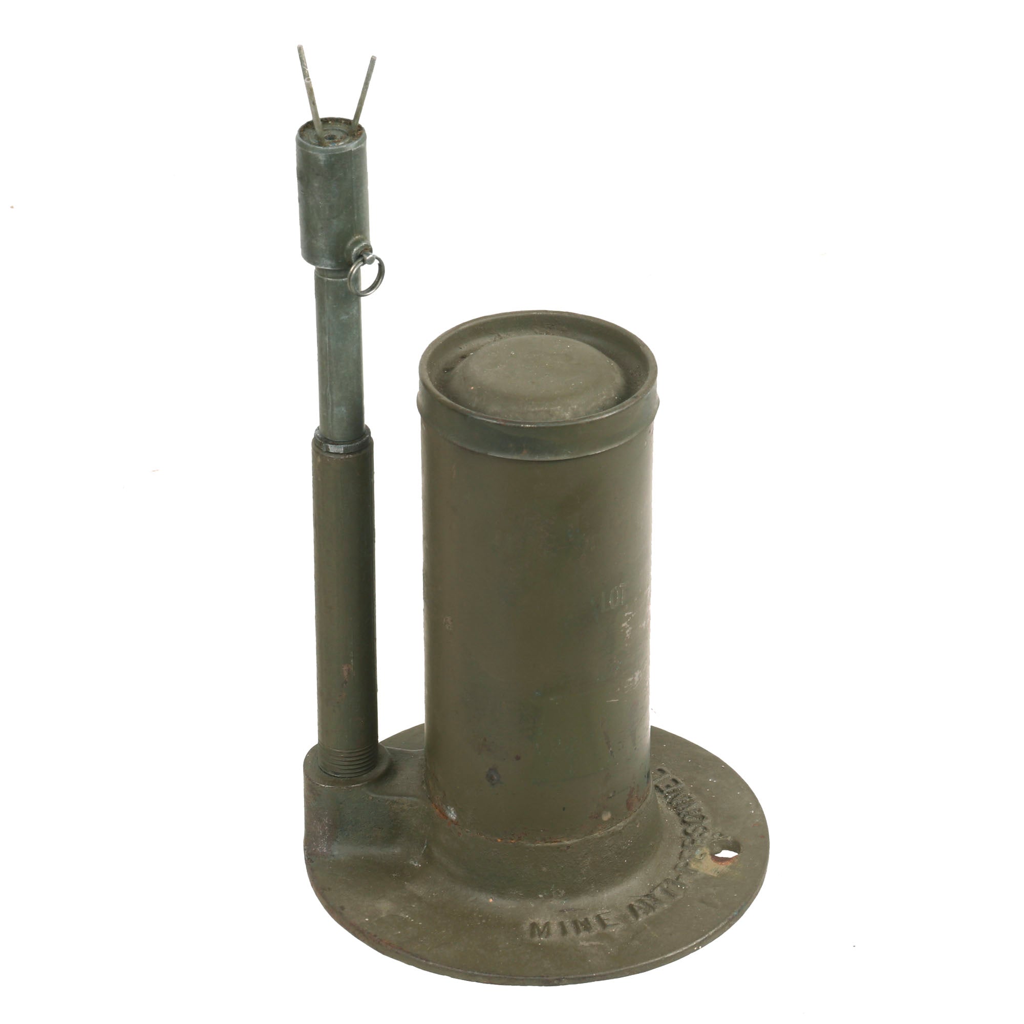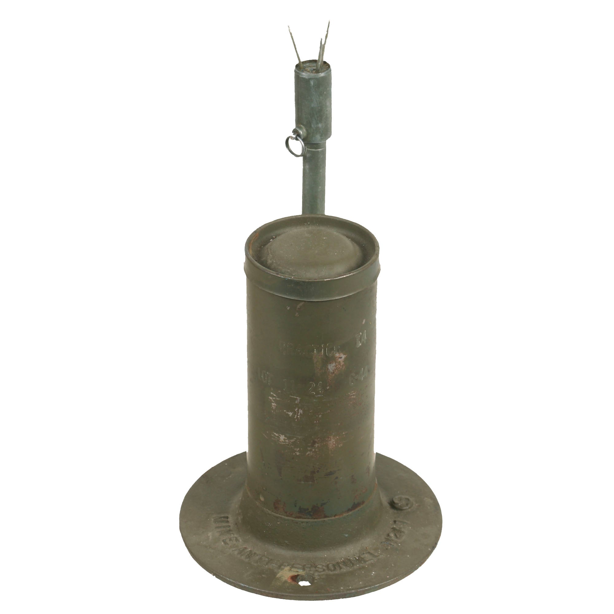 The mine consists of a cylindrical steel main body containing a 60 millimeter mortar shell body (originally the M49A2), linked to a tall thin fuze stand.