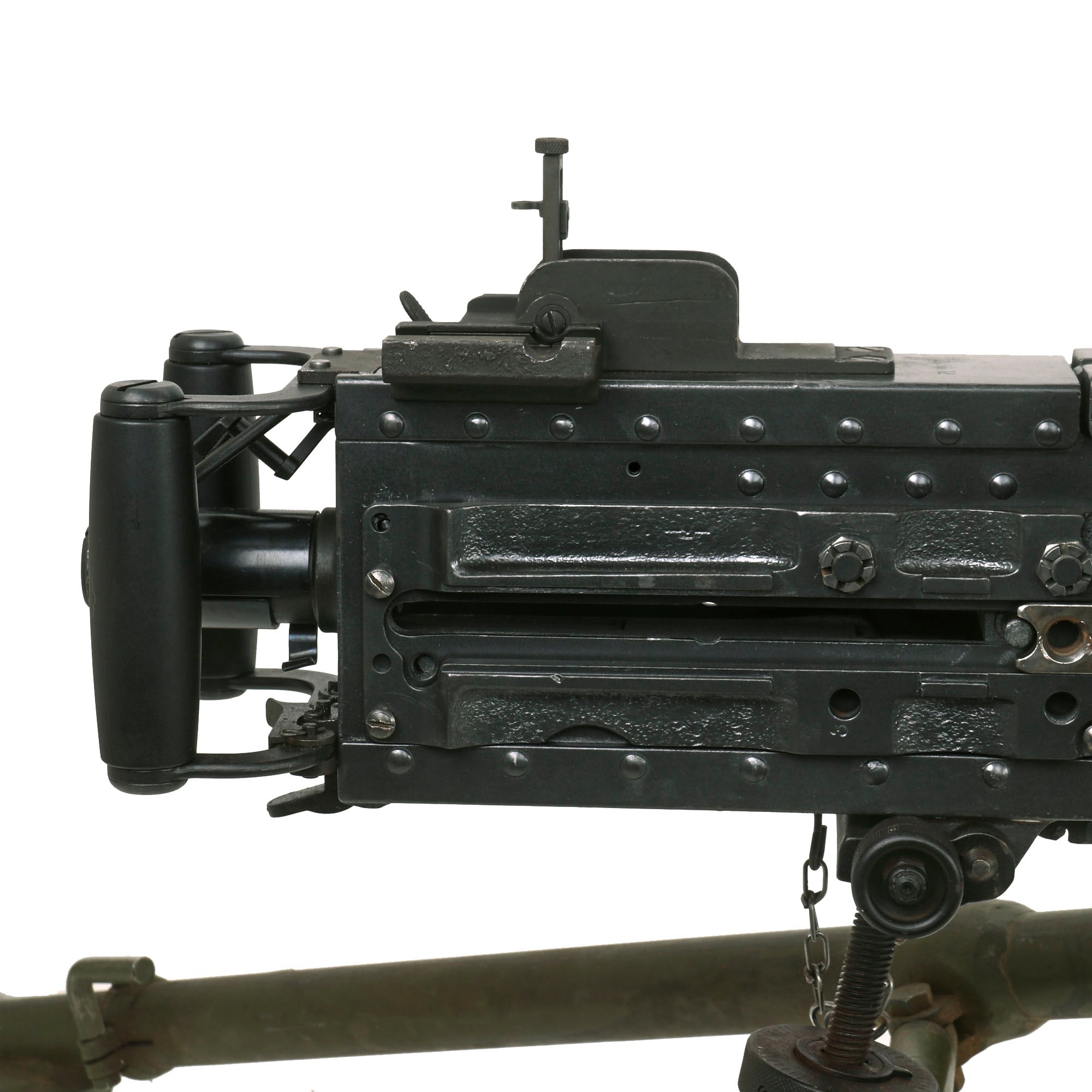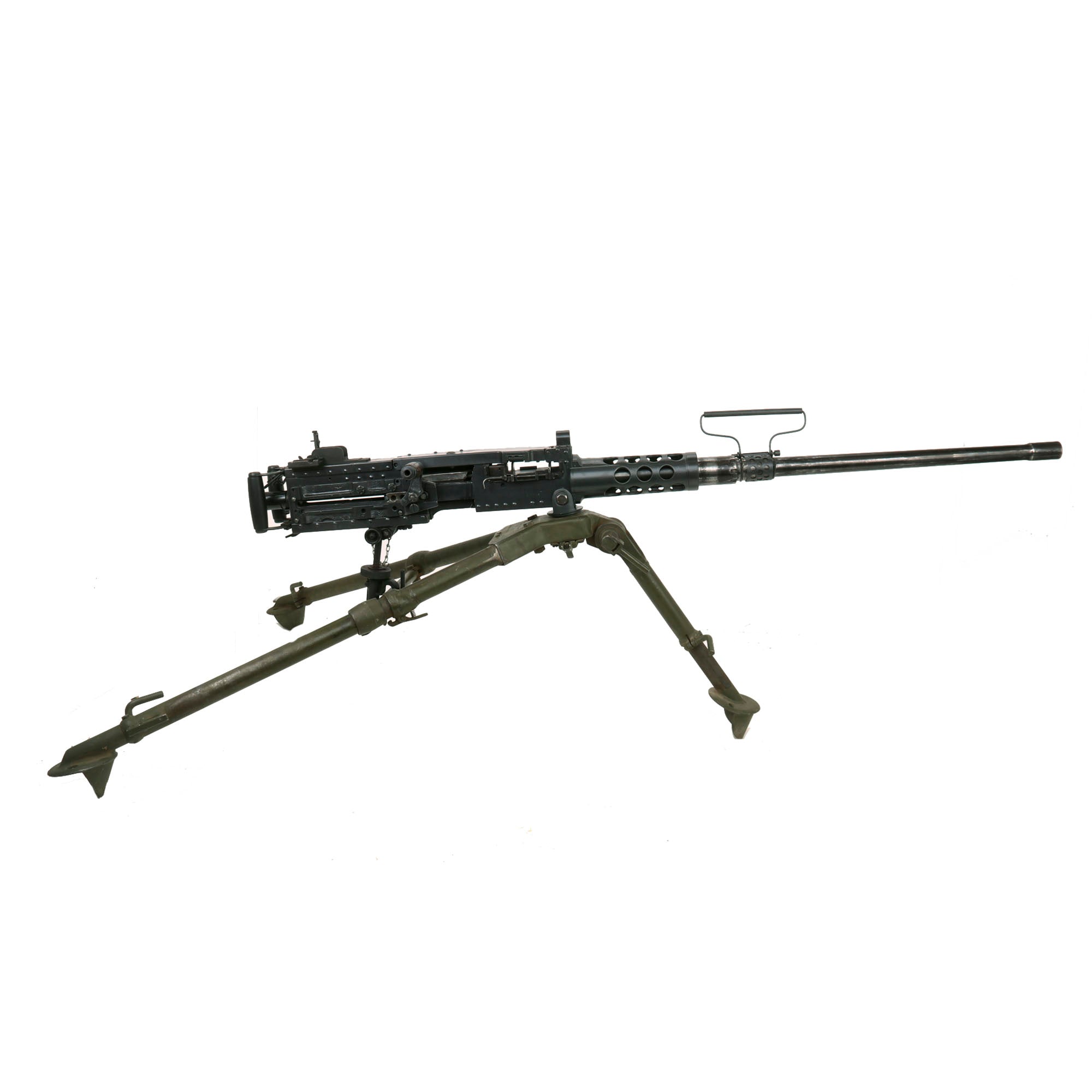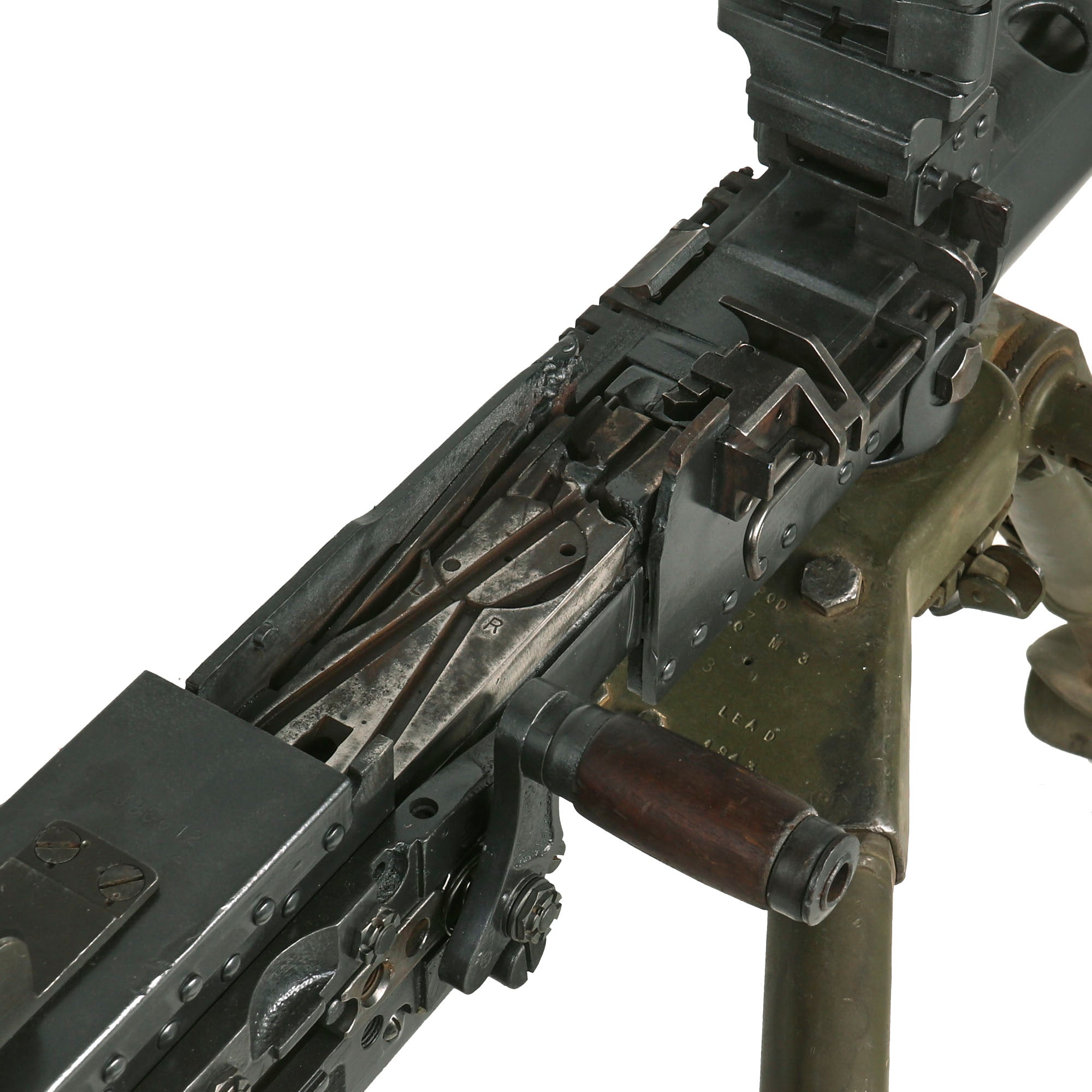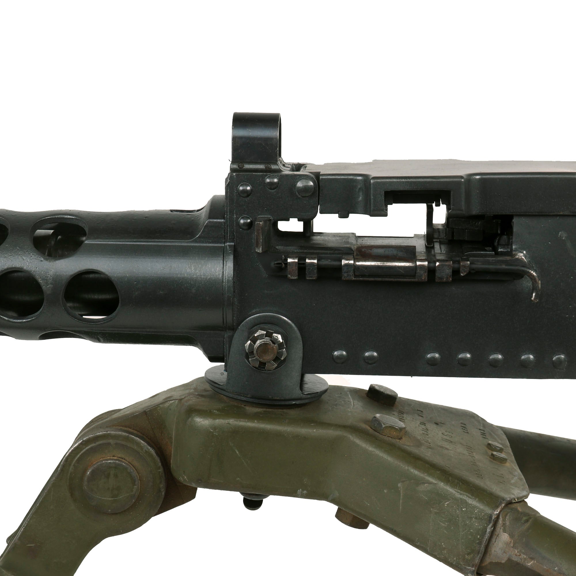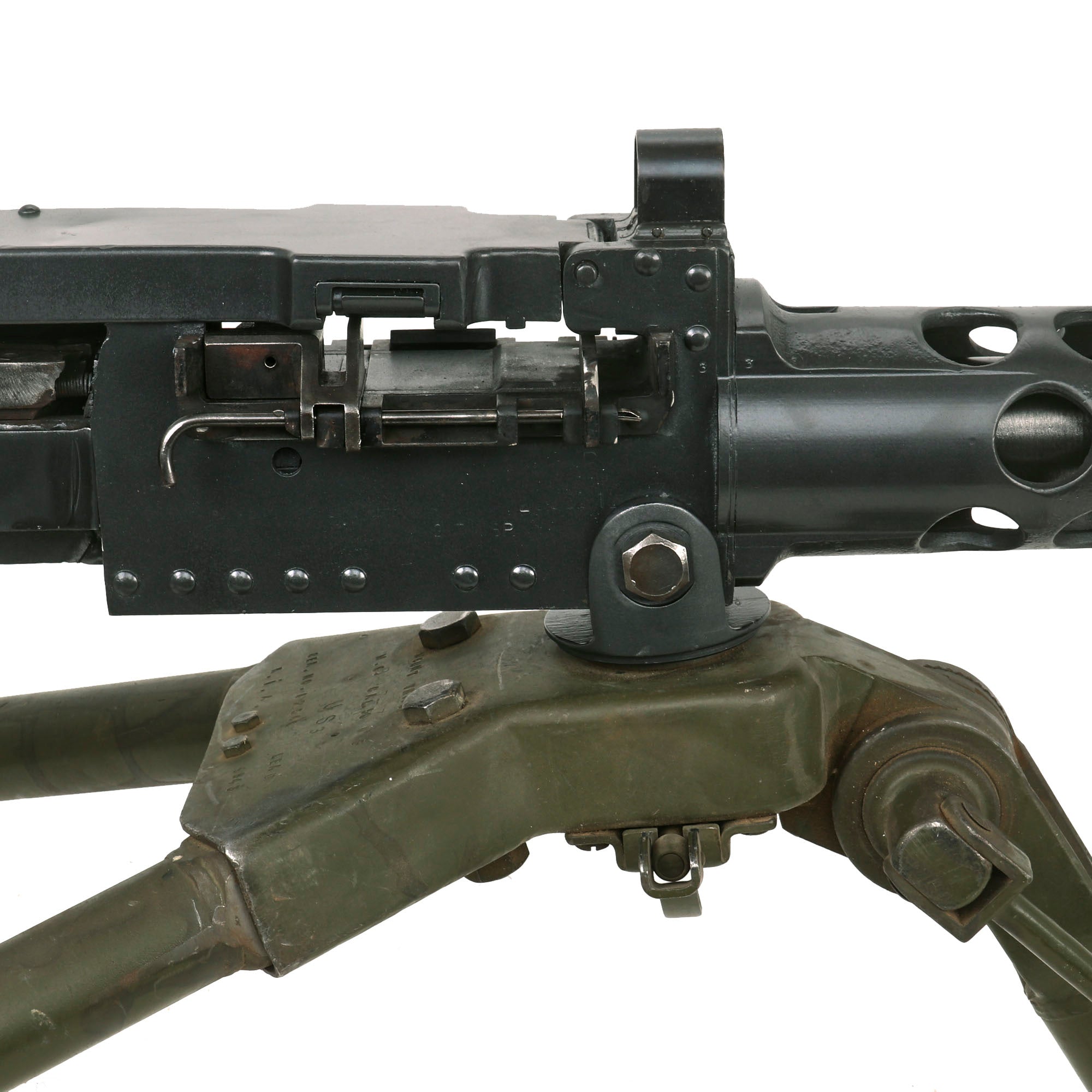 This "Ma Deuce" comes complete with an original 1943 dated WWII M3 Tripod, which is also marked R. I. A. on the central hub for Rock Island Arsenal, the "Arsenal of Democracy in Illinois. It has a correct USGI issue pintle, however the T&E is USGI but for an M1919 browning, which is why it is fully extended. The tripod has a lovely OD green finish on it, which could be the original WWII finish, or it may have been repainted at some point. We checked the functionality, and all three legs extend correctly and have intact locking levers, and the central bar still locks in place. The pintle catch is also fully functional, making this really a great example. The M2HB is STILL the heavy machine gun of choice for the U.S. military, as well as many other militaries around the world, so these tripods are still in service, which is one of the reasons they are so hard to find.