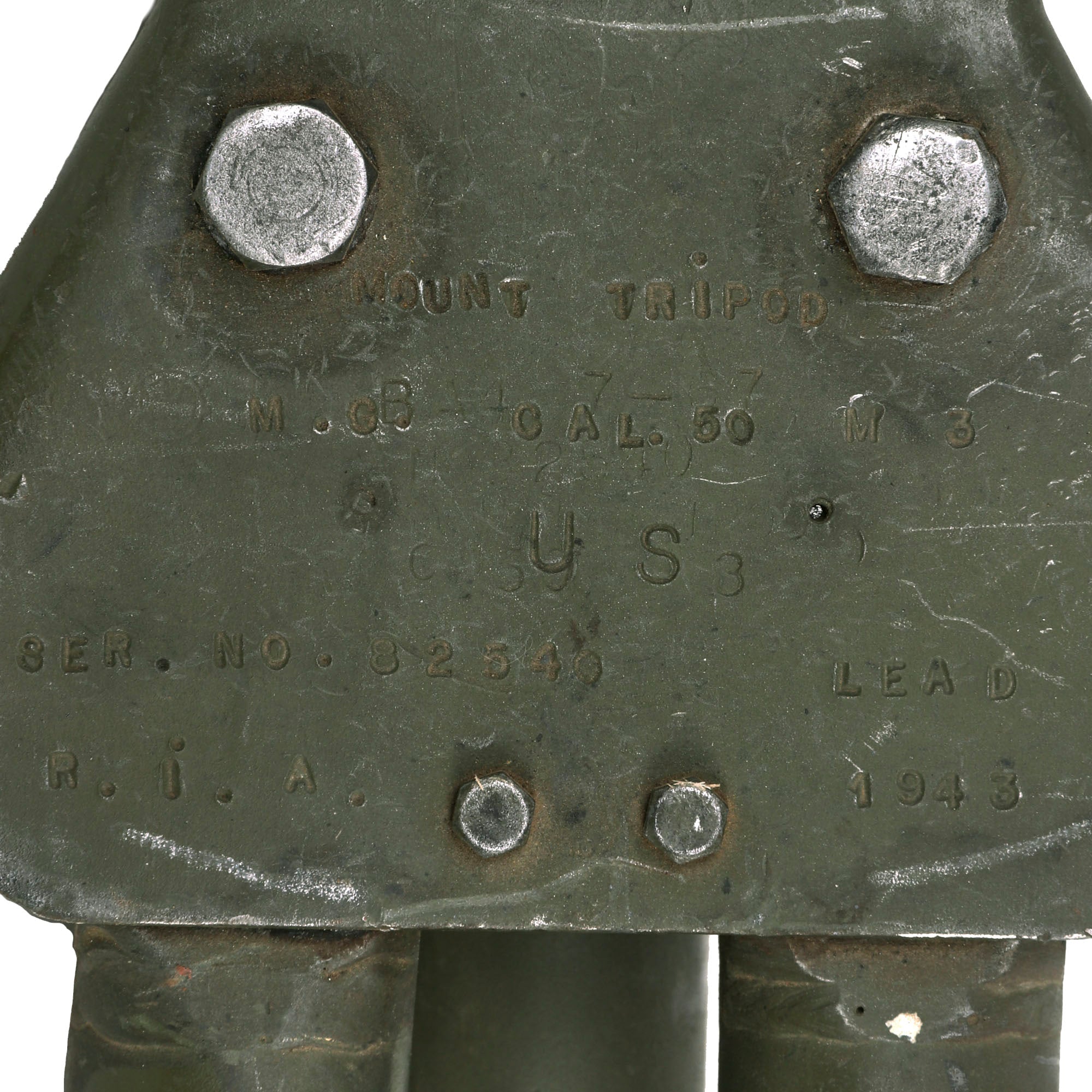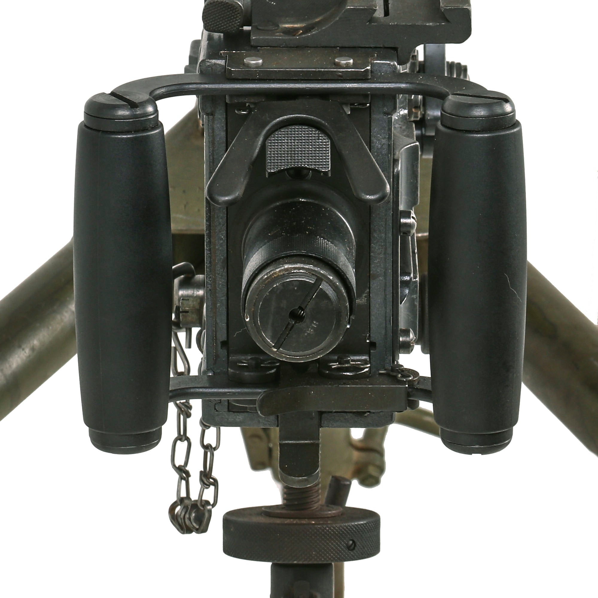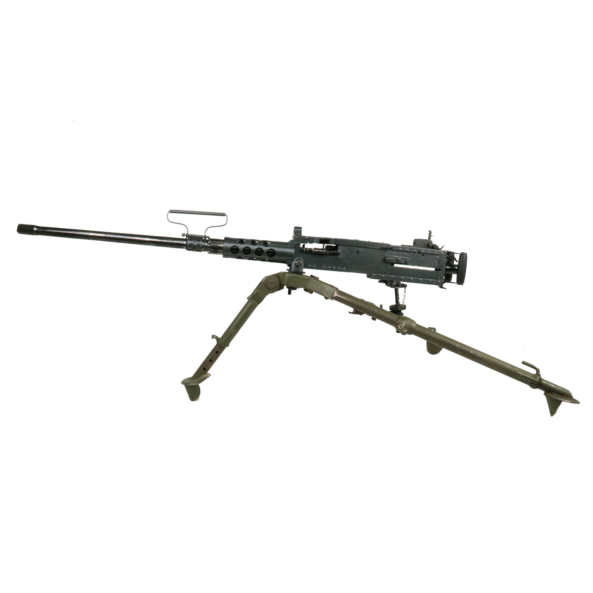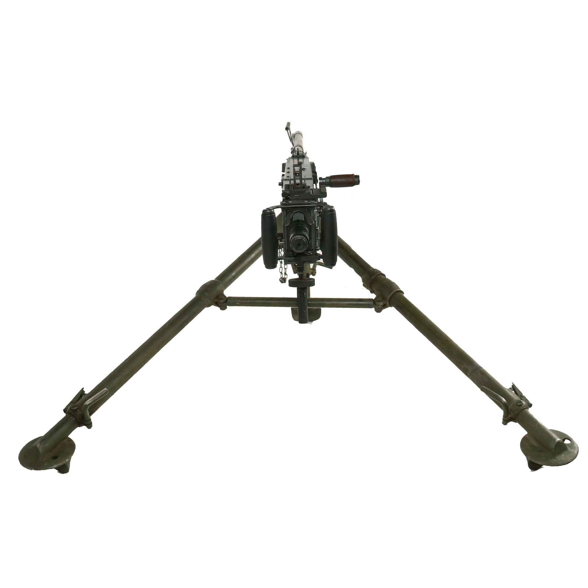 This "Ma Deuce" comes complete with an original 1943 dated WWII M3 Tripod, which is also marked R. I. A. on the central hub for Rock Island Arsenal, the "Arsenal of Democracy in Illinois. It has a correct USGI issue pintle, however the T&E is USGI but for an M1919 browning, which is why it is fully extended. The tripod has a lovely OD green finish on it, which could be the original WWII finish, or it may have been repainted at some point. We checked the functionality, and all three legs extend correctly and have intact locking levers, and the central bar still locks in place. The pintle catch is also fully functional, making this really a great example. The M2HB is STILL the heavy machine gun of choice for the U.S. military, as well as many other militaries around the world, so these tripods are still in service, which is one of the reasons they are so hard to find.