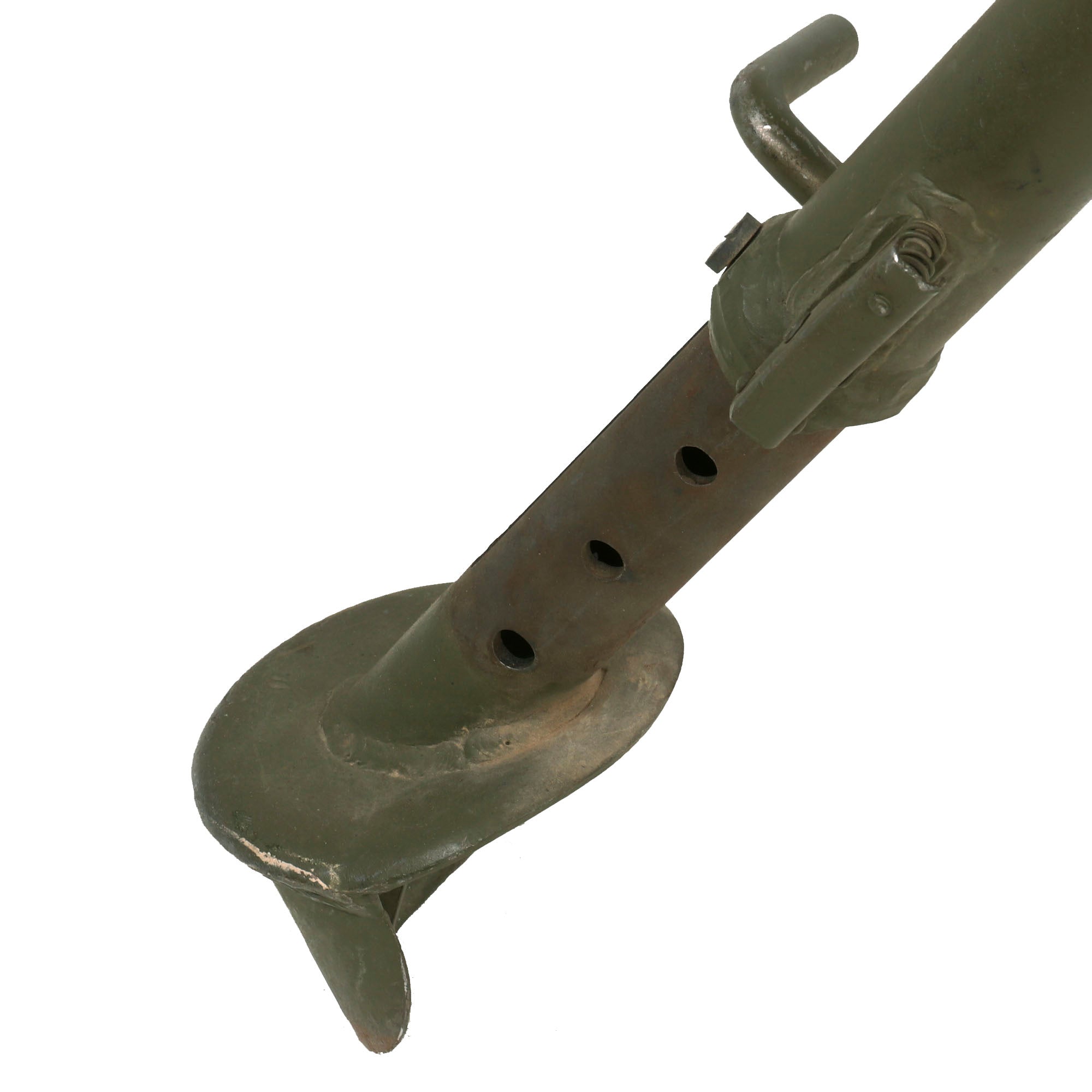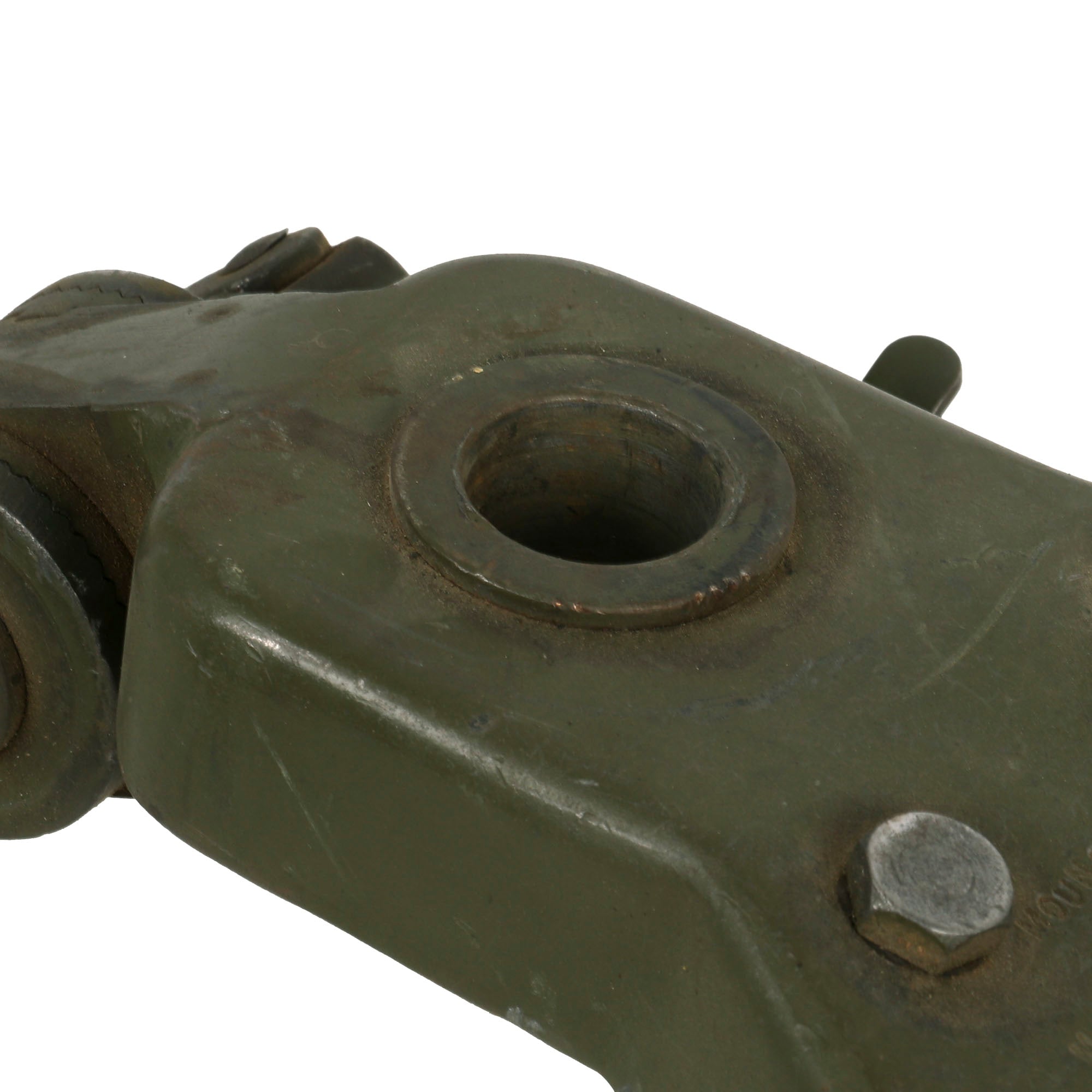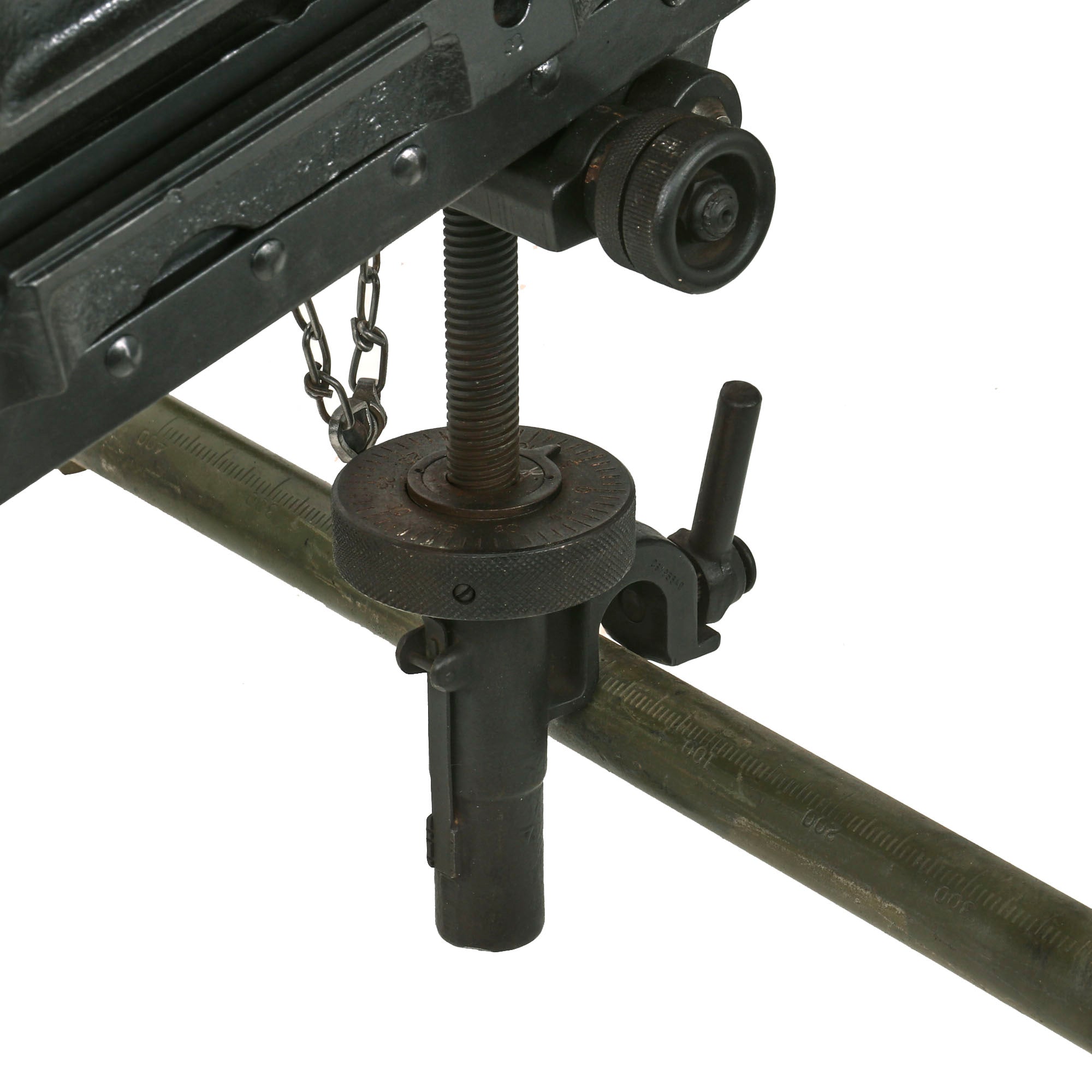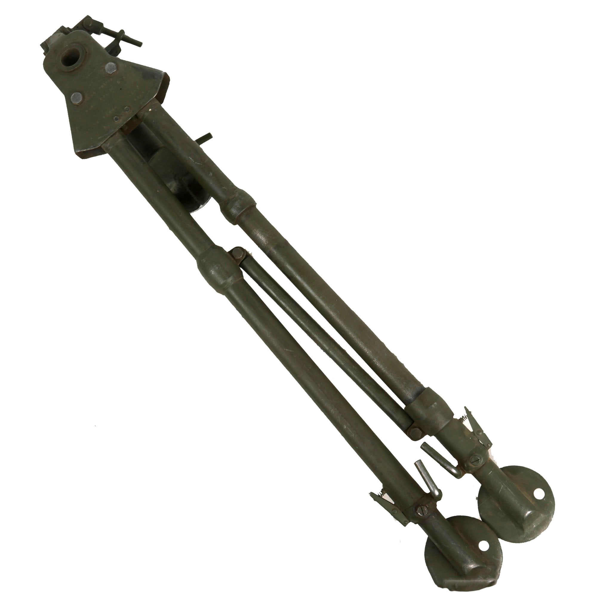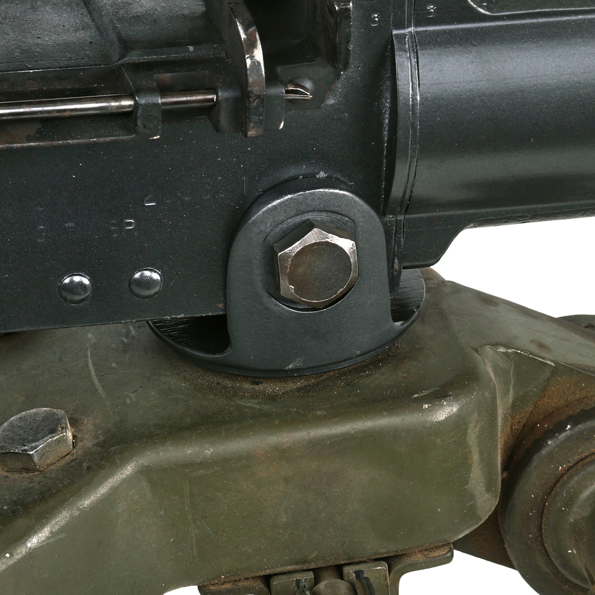 This "Ma Deuce" comes complete with an original 1943 dated WWII M3 Tripod, which is also marked R. I. A. on the central hub for Rock Island Arsenal, the "Arsenal of Democracy in Illinois. It has a correct USGI issue pintle, however the T&E is USGI but for an M1919 browning, which is why it is fully extended. The tripod has a lovely OD green finish on it, which could be the original WWII finish, or it may have been repainted at some point. We checked the functionality, and all three legs extend correctly and have intact locking levers, and the central bar still locks in place. The pintle catch is also fully functional, making this really a great example. The M2HB is STILL the heavy machine gun of choice for the U.S. military, as well as many other militaries around the world, so these tripods are still in service, which is one of the reasons they are so hard to find.