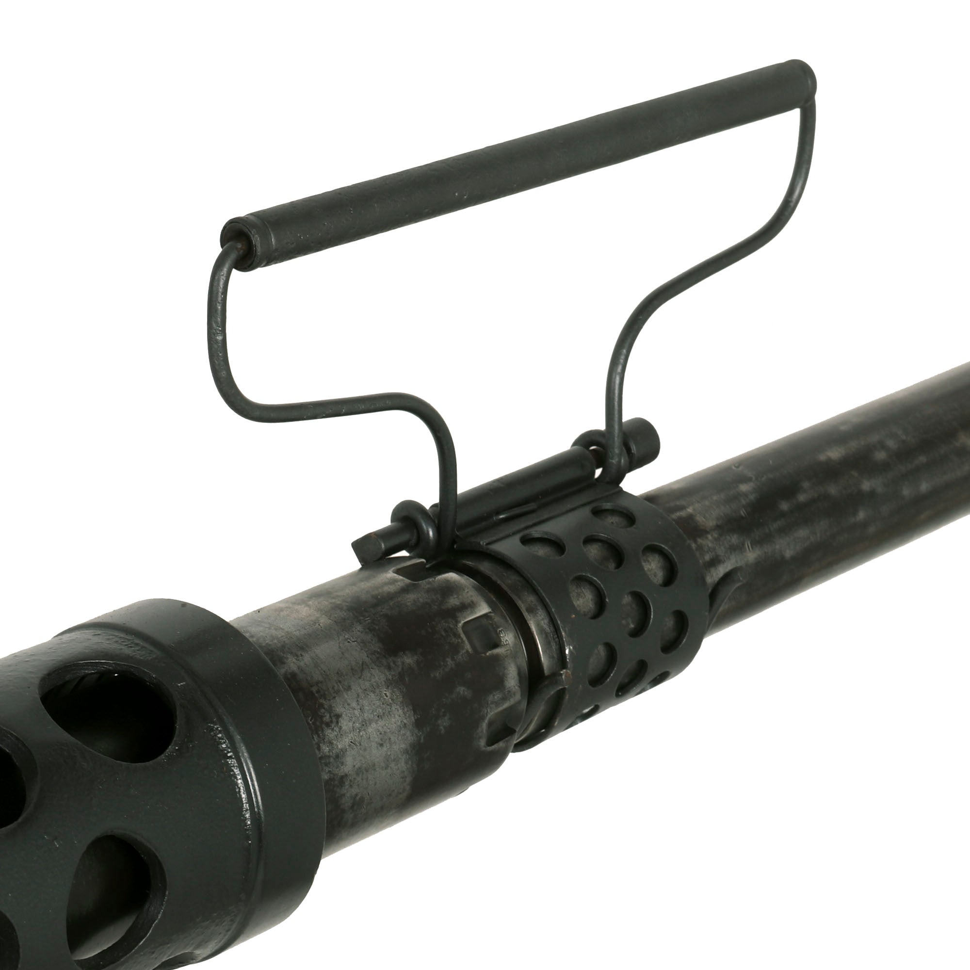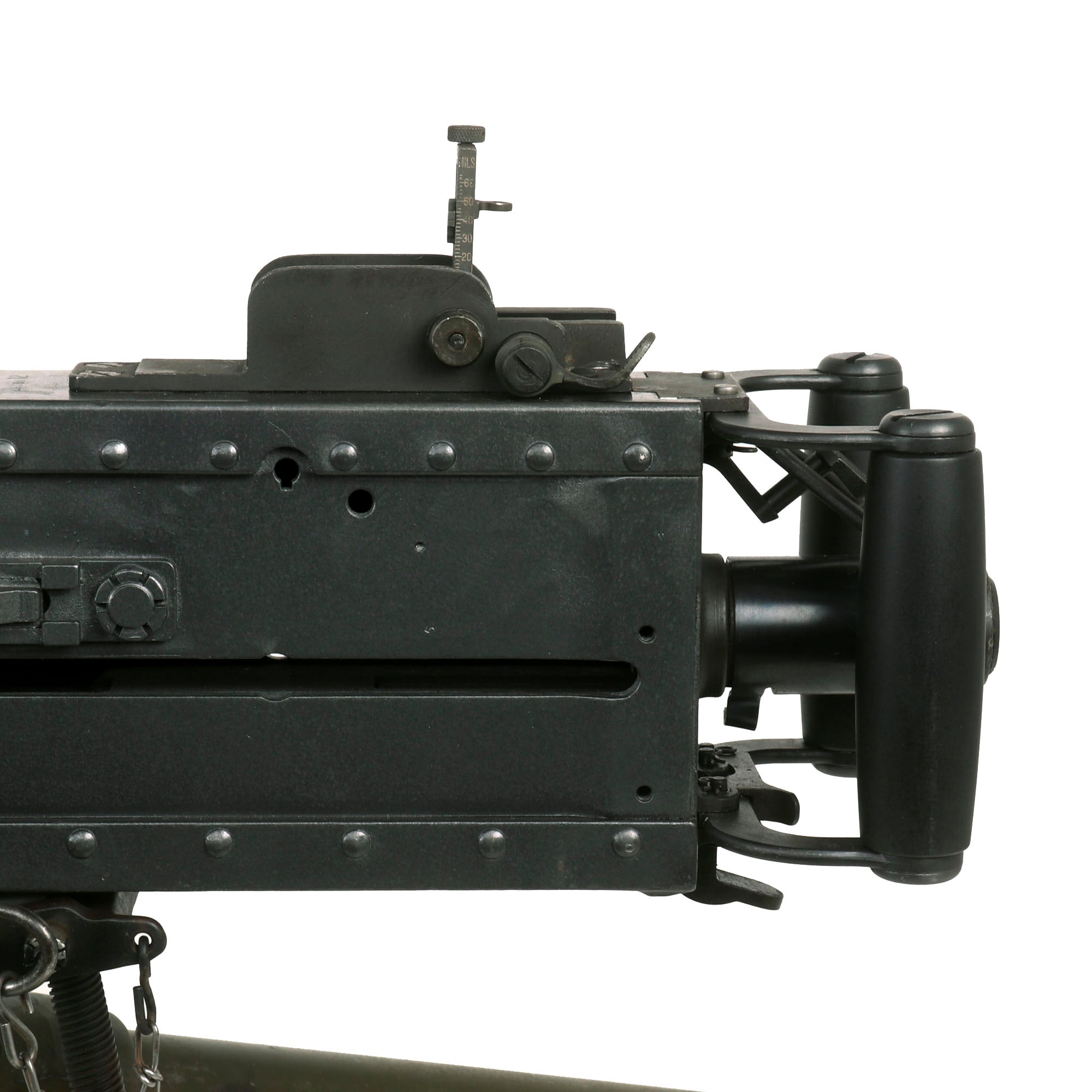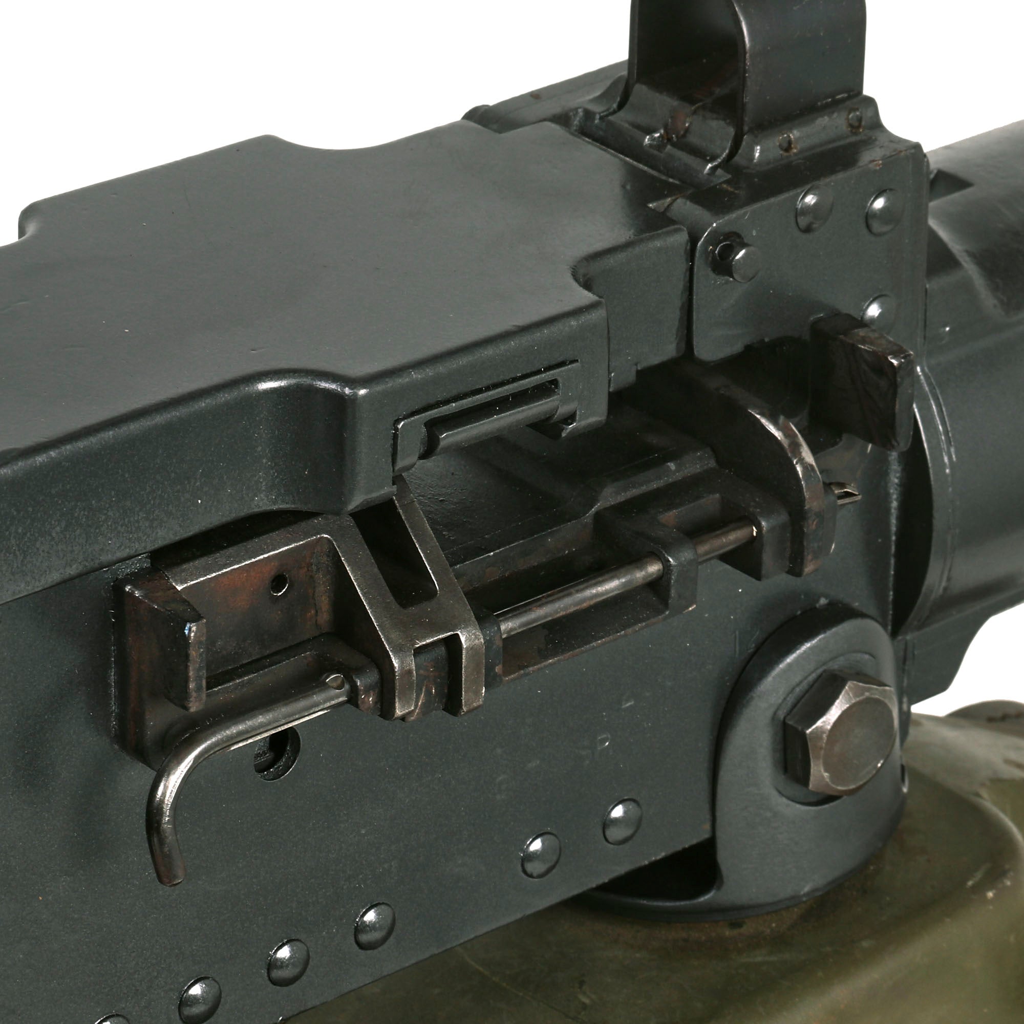 All of the parts are USGI issue, though it is very likely that many have been replaced over the years, as these were in service for decades. We have read many stories of service members talking about how the most reliable "Ma Deuce" they have is WWII production. This is one reason that they are available so seldom on the market: they are still perfectly fit for service. The barrel on this display gun is 100% original and live, and can also be removed from the display receiver easily. It is fitted with the correct carry handle as well. The top cover still opens, the trigger still moves, and the sights do as well.