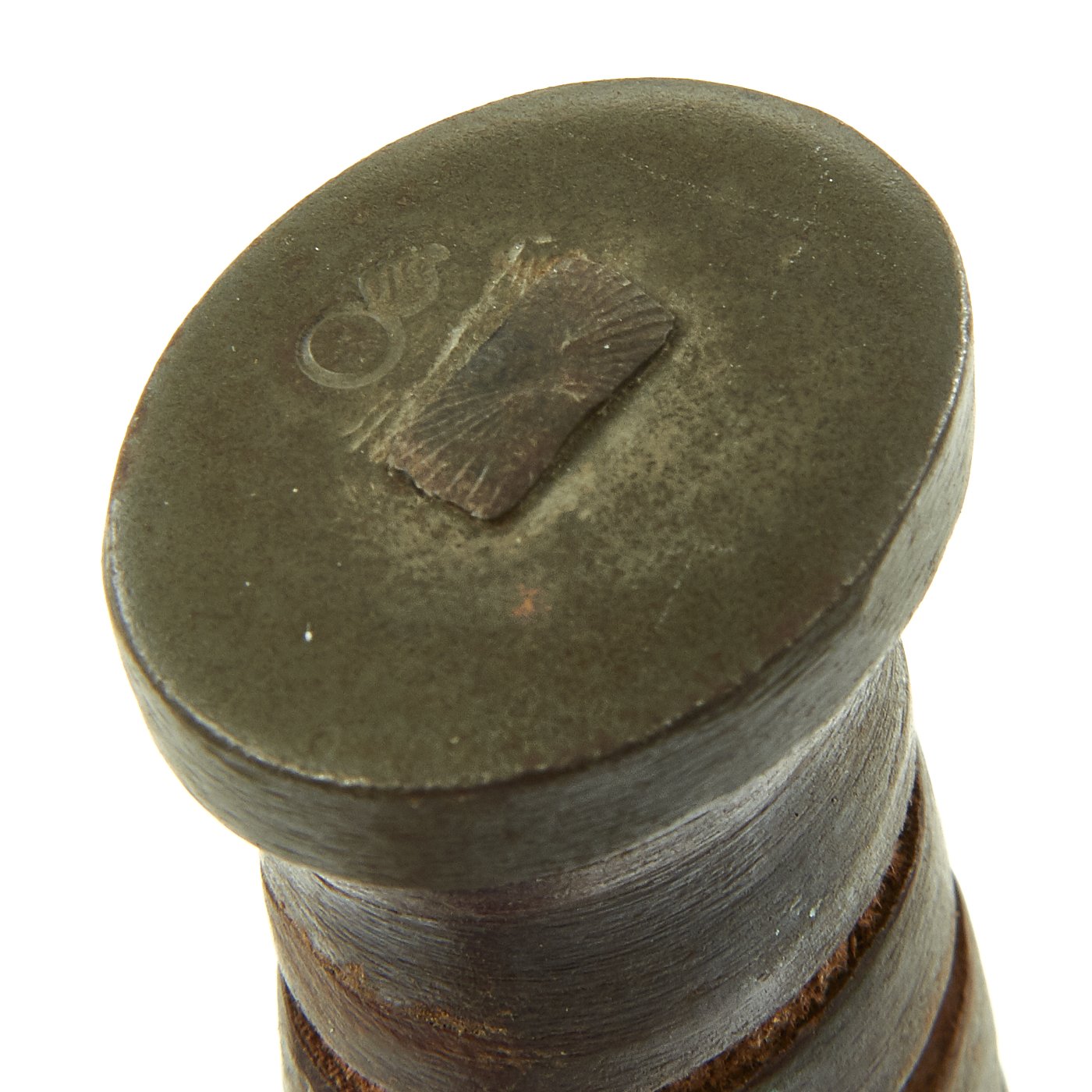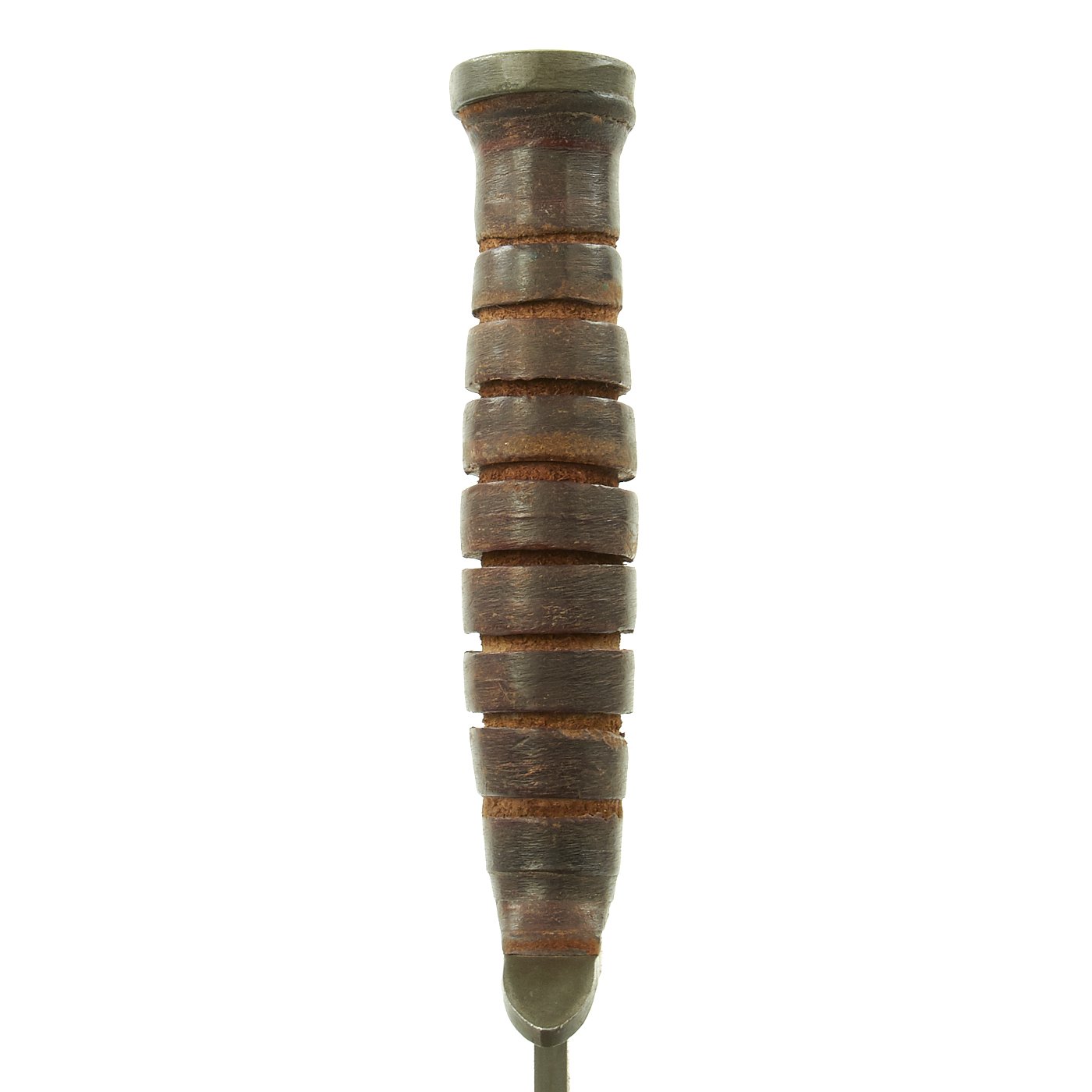 This knife is early production, indicated by the maker information being stamped directly on the blade: U S M3 IMPERIAL. This is the second version of the knife, as the first all had the date "1943" after the maker. The later version moved the markings to the cross guard. The 6 1/2 inch spear point blade is in very good used condition, with a good amount of the original finish, except towards the tip, which is more worn. The blade is somewhat dull, but could easily be sharpened. It does not have any major issues or damage, though there has been post production sharpening, particularly on the false edge. The handle and stacked leather grip are in great shape, with a lovely color, no cracking, and a nice shined slightly rounded look. There are no major cracks, and the leather is still soft. The bottom of the pommel shows the U.S. "Flaming Bomb" proof mark, next to the "sunburst" pattern peened tang.
