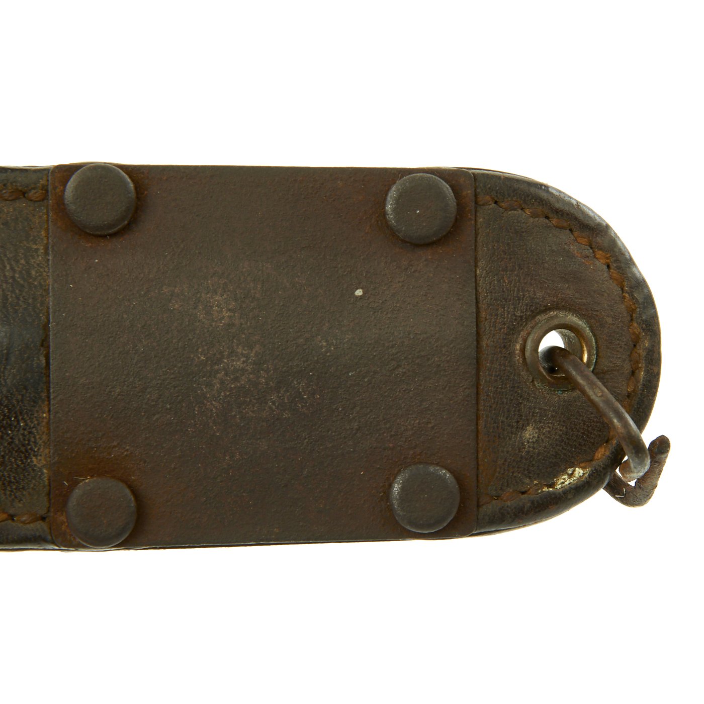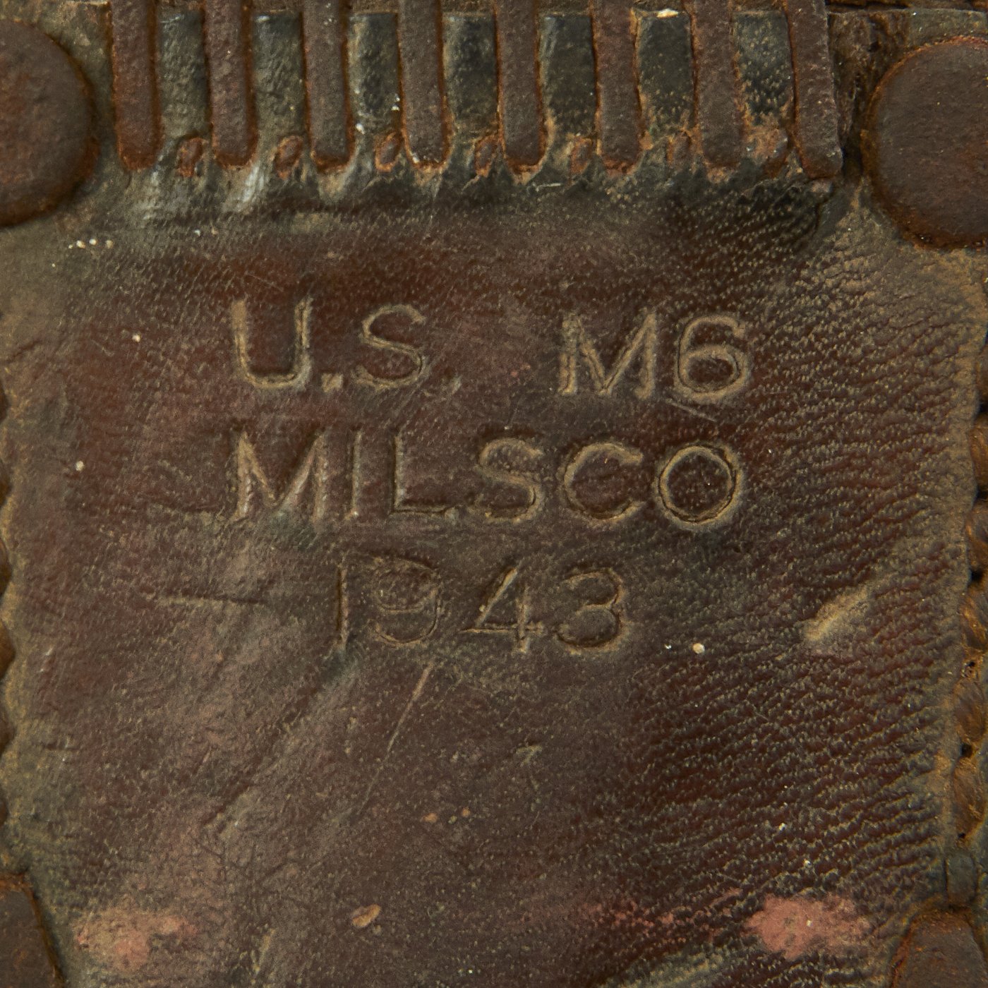 The original scabbard is marked, U.S. M6 / MILSCO / 1943, and is in good condition, though the top where the belt hooks were appears to have been removed. It has a lovely aged leather look, with a bit of cracking and dry rot in places. The securing strap is somewhat delicate, and there is cracking near the scabbard throat. This is the original scabbard designed for this knife, which was then replaced with the Fiberglass M8/M8A1 scabbards, which were also used with the M4 bayonet.