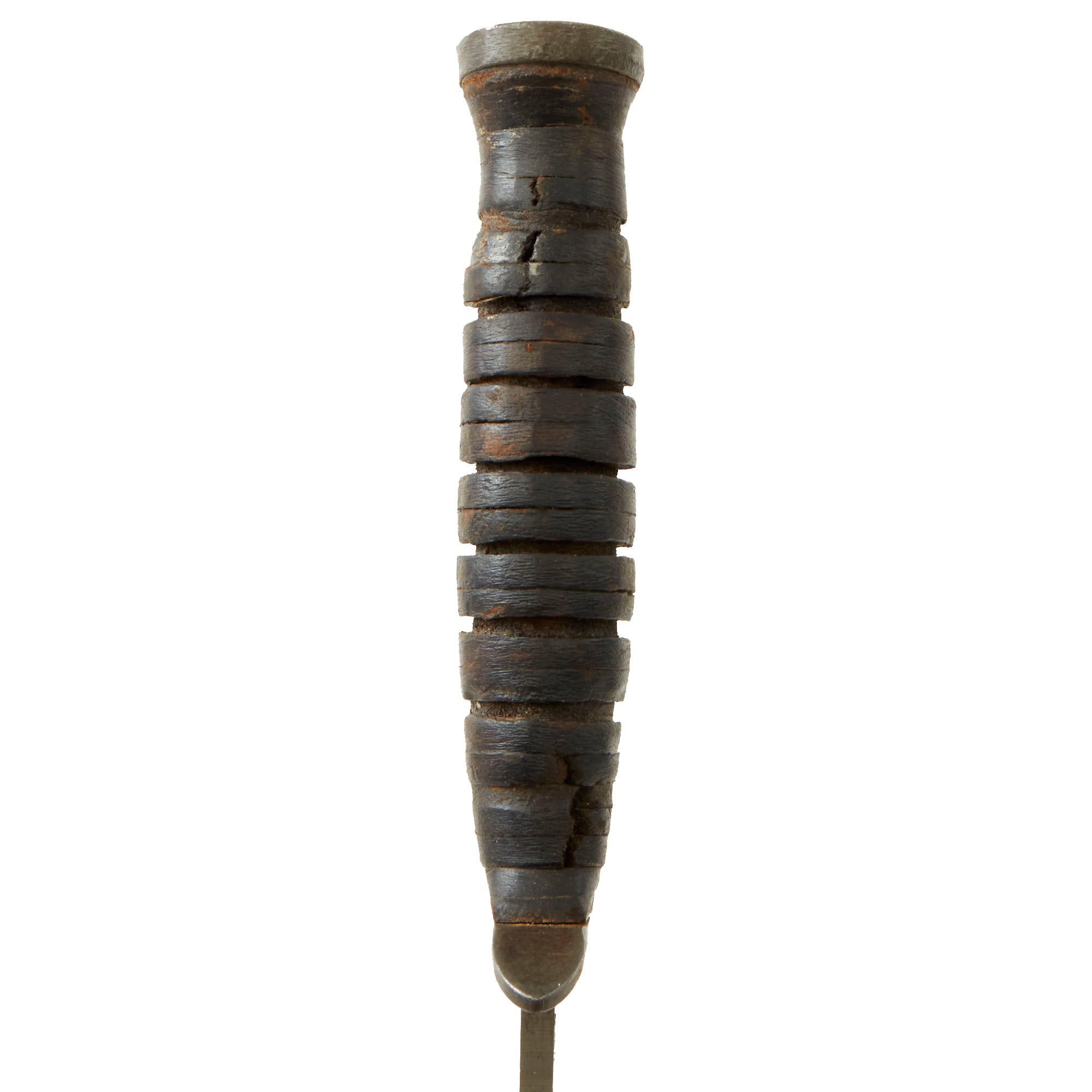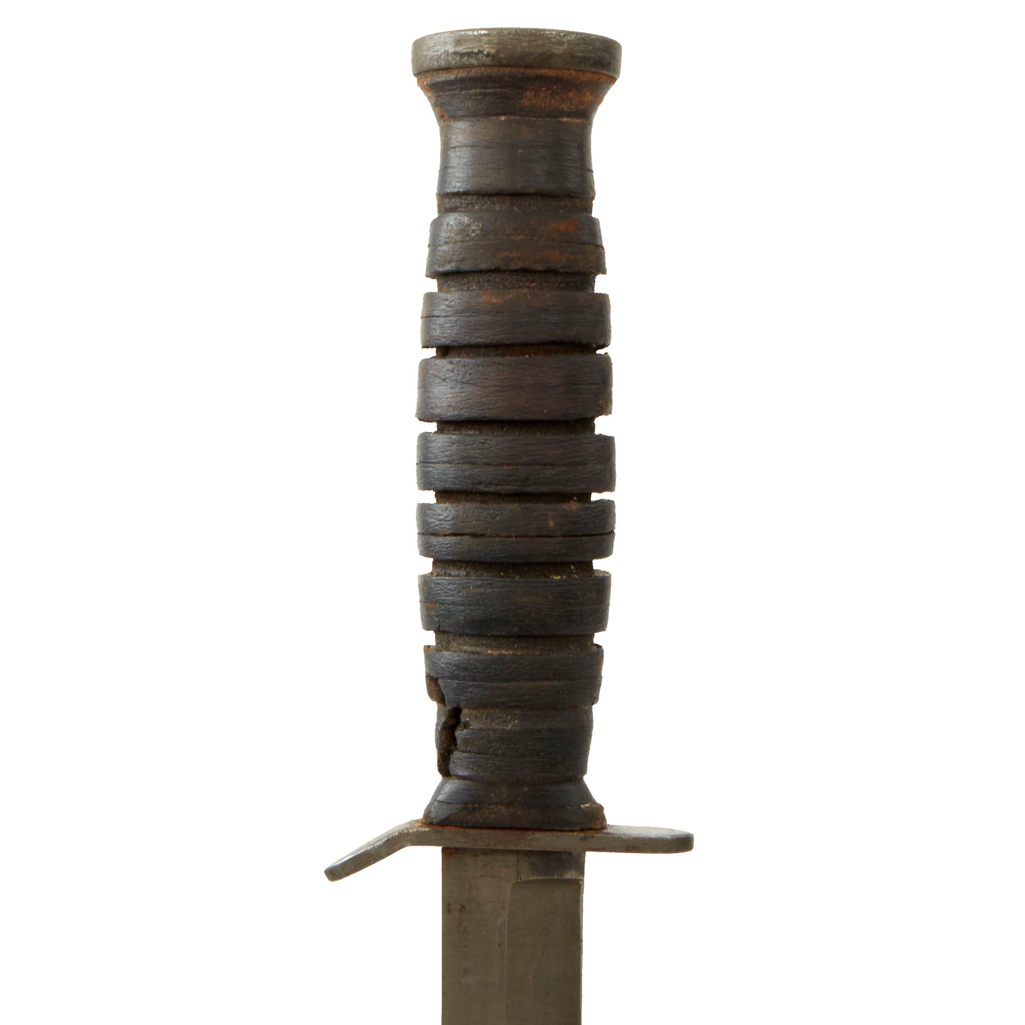 This knife is early production, indicated by the maker information being stamped directly on the blade: U S M3 IMPERIAL. This is the second version of the knife, as the first all had the date "1943" after the maker. The later version moved the markings to the cross guard. The 6 1/2 inch spear point blade is in very good used condition, with most of the original finish remaining. It does not have any major issues or damage, though there has been post production sharpening, particularly on the false edge. The handle and stacked leather grip are in great shape, with a lovely color, but there is a good bit of cracking in the pieces. The bottom of the pommel shows the U.S. "Flaming Bomb" proof mark.