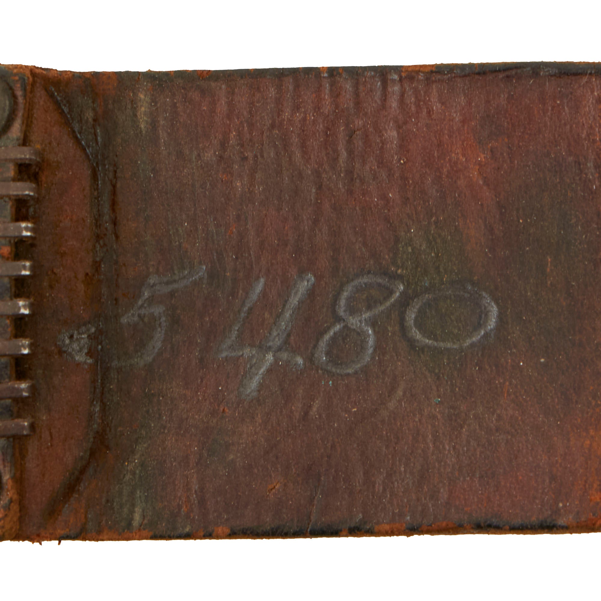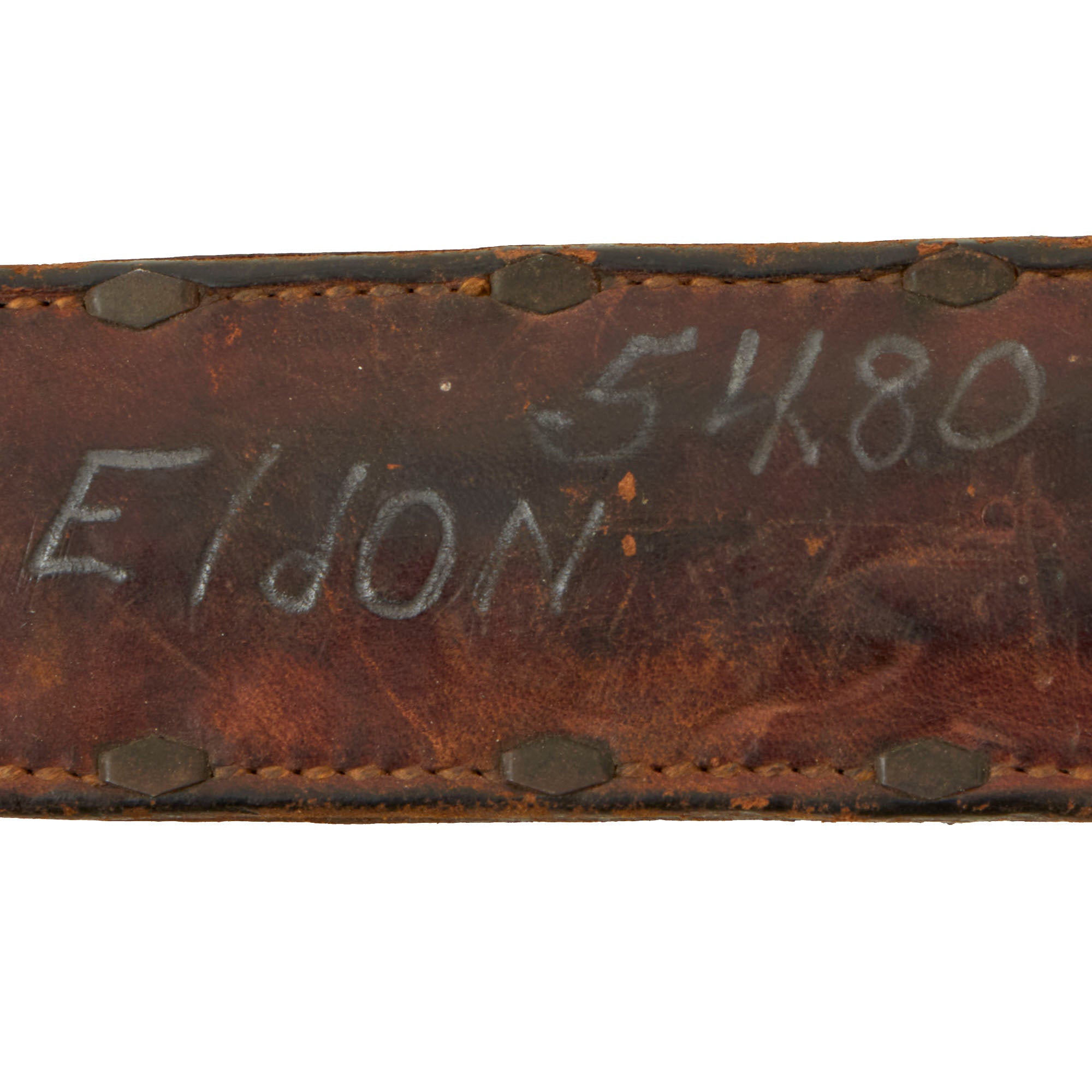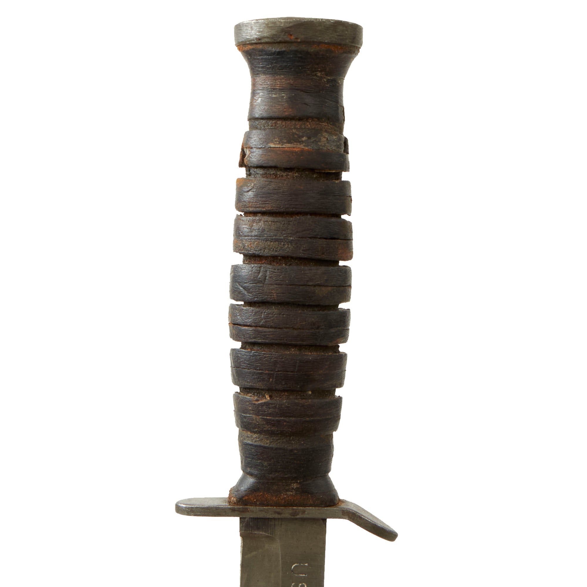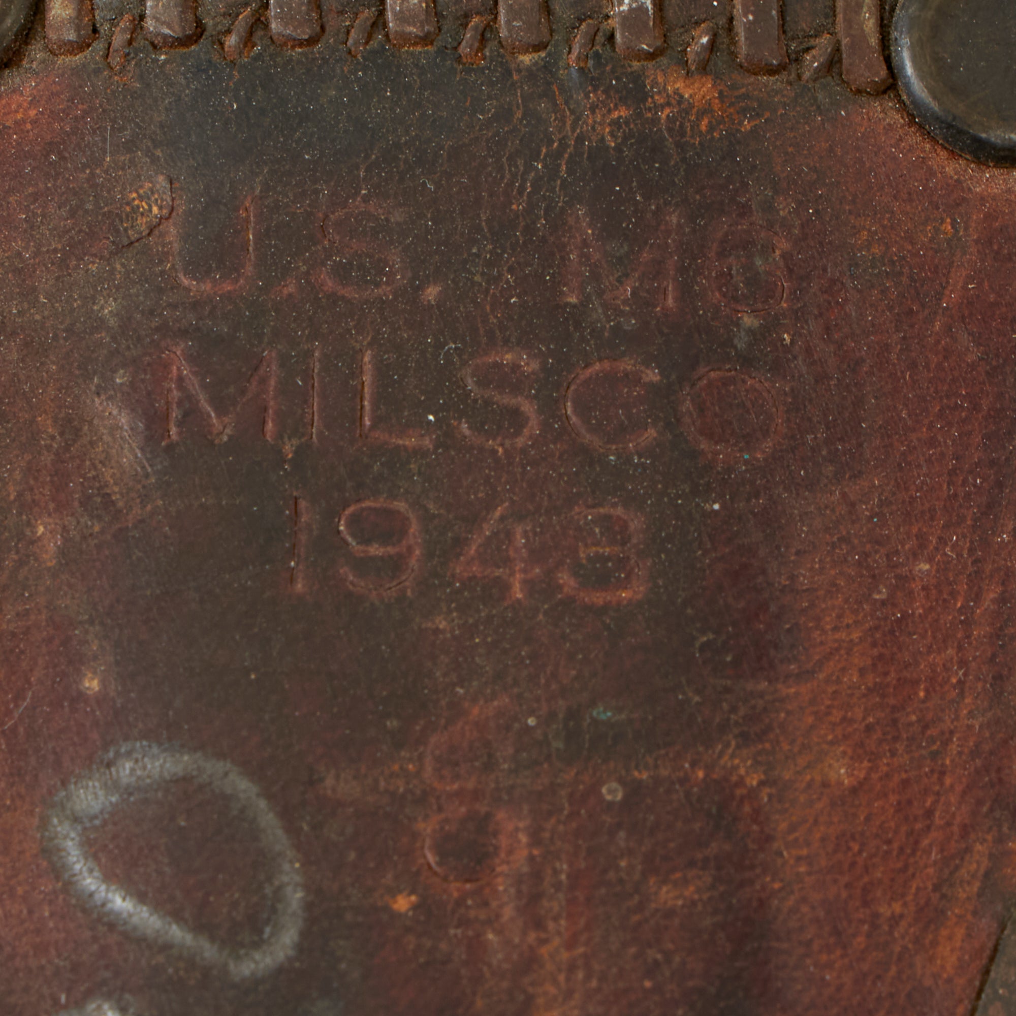The original scabbard is marked, U.S. M6 / MILSCO / 1943, and is in good condition, retaining its belt attachment. It has a lovely aged leather look, with a bit of cracking and dry rot in places. The securing strap is somewhat delicate, and there is cracking near the scabbard throat. This is the original scabbard designed for this knife, which was then replaced with the Fiberglass M8/M8A1 scabbards, which were also used with the M4 bayonet. This example has Eldon 5480 written on the body, with 5480 also written behind where the grip would sit. The origin of these markings are unknown, but they are likely a soldier’s name and partial serial number. 3 of the rivets holding the metal plate on the bottom have lost their end pieces on one side, but the plates are still firmly held in place.