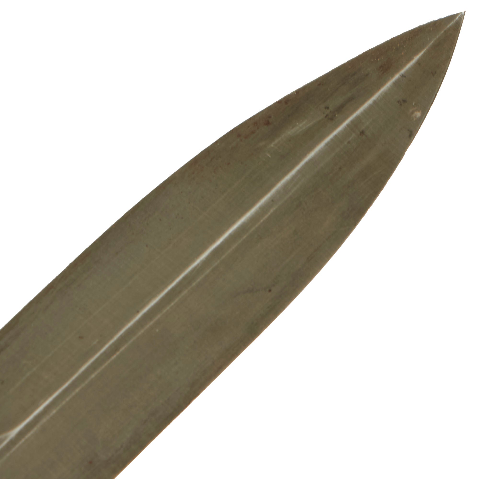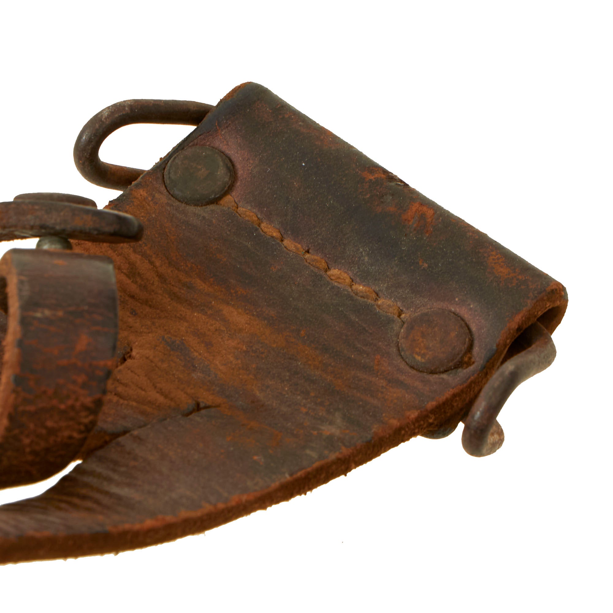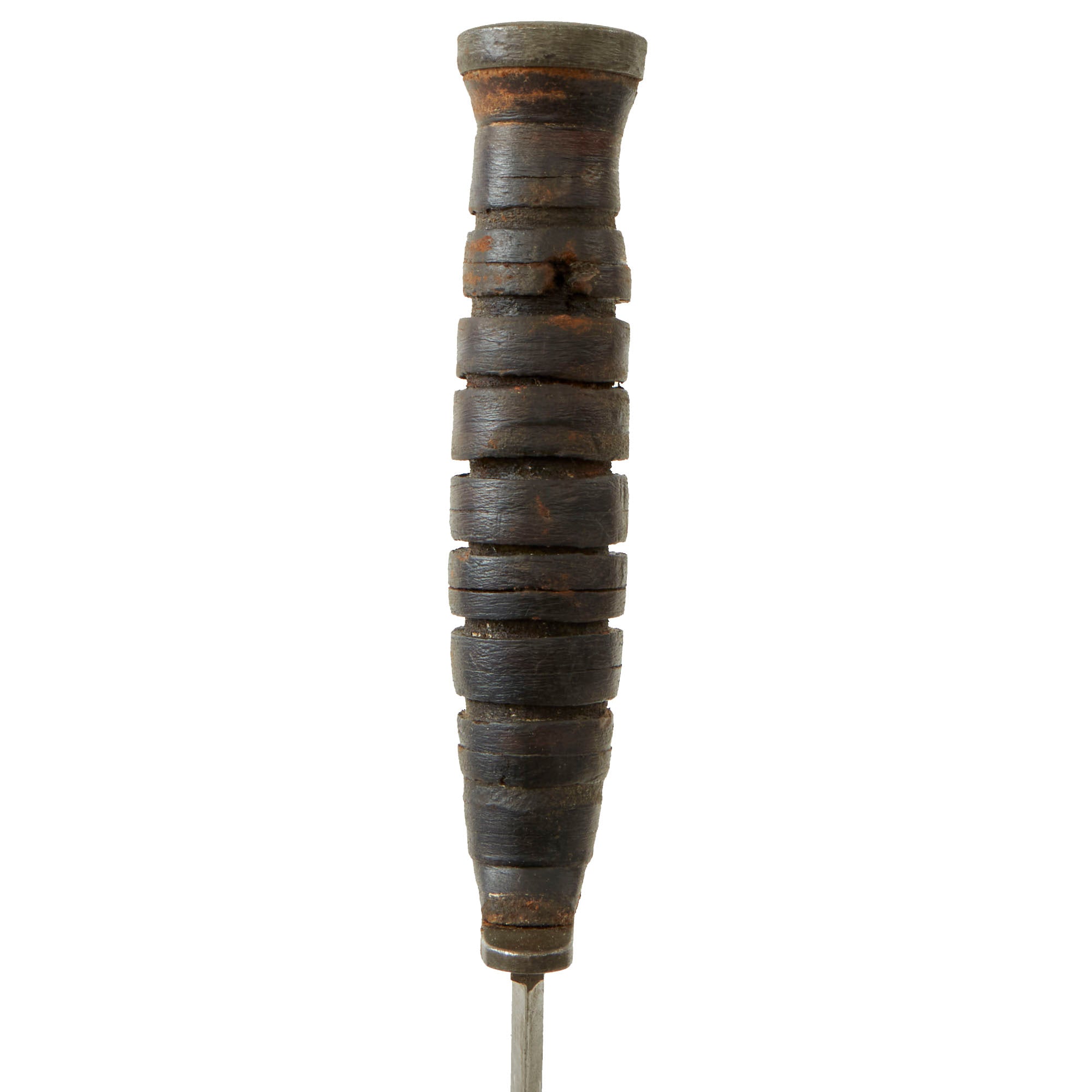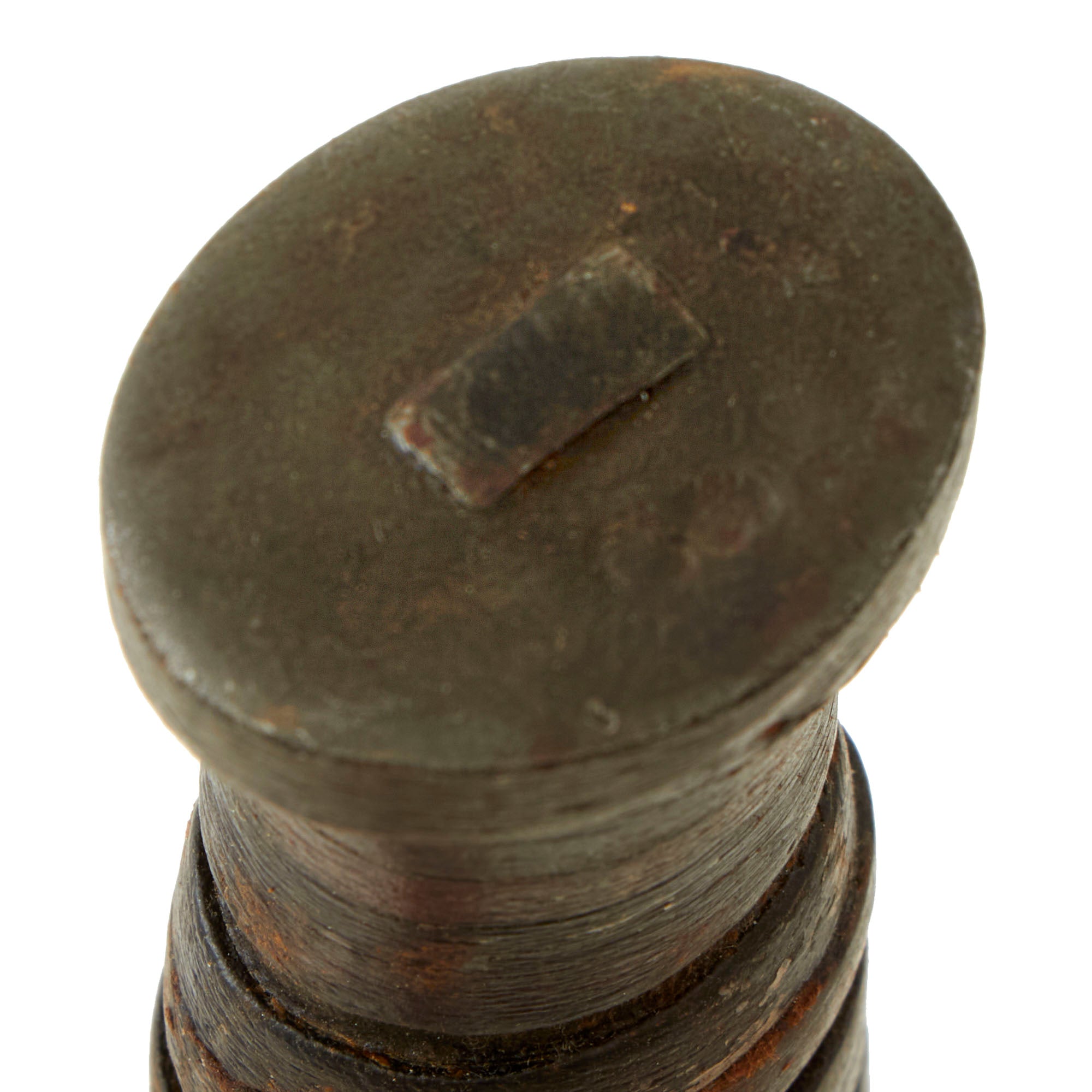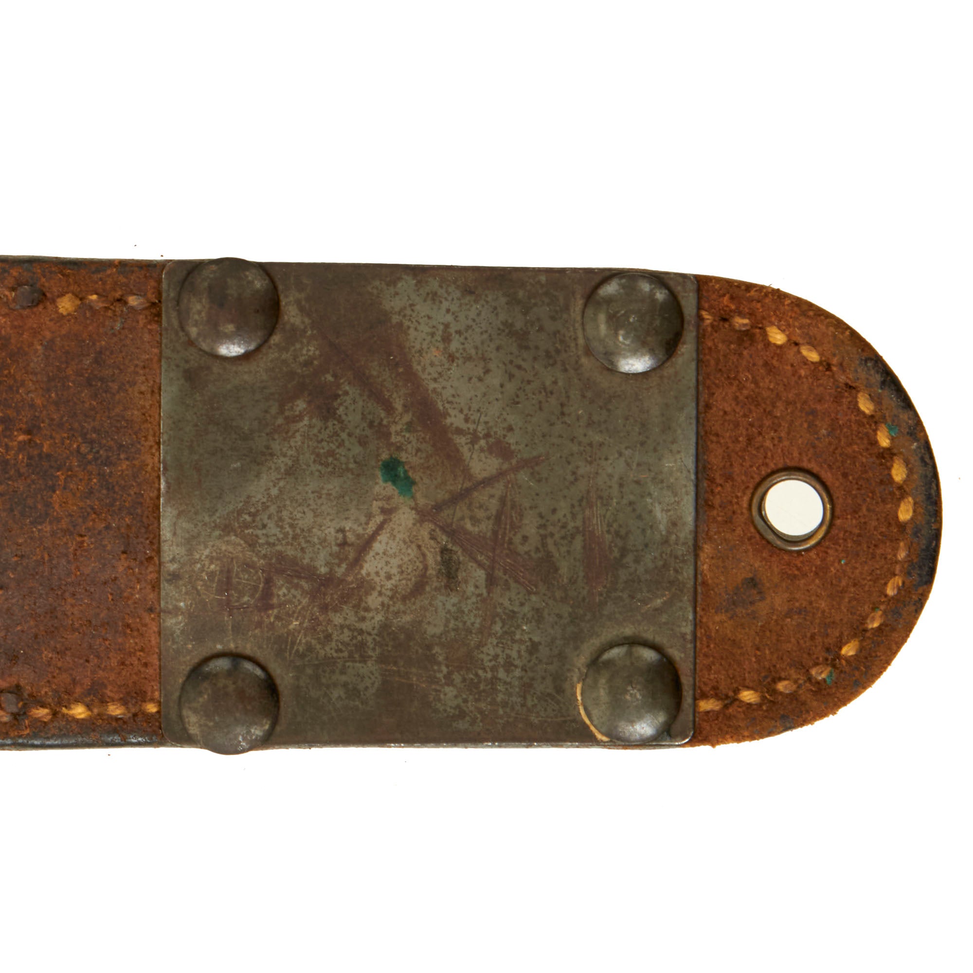 The original scabbard is marked, U.S. M6 / MILSCO / 1943, and is in good condition, retaining its belt attachment. It has a lovely aged leather look, with a bit of cracking and dry rot in places. The securing strap is somewhat delicate, and there is cracking near the scabbard throat. This is the original scabbard designed for this knife, which was then replaced with the Fiberglass M8/M8A1 scabbards, which were also used with the M4 bayonet. This example has Eldon 5480 written on the body, with 5480 also written behind where the grip would sit. The origin of these markings are unknown, but they are likely a soldier’s name and partial serial number. 3 of the rivets holding the metal plate on the bottom have lost their end pieces on one side, but the plates are still firmly held in place.