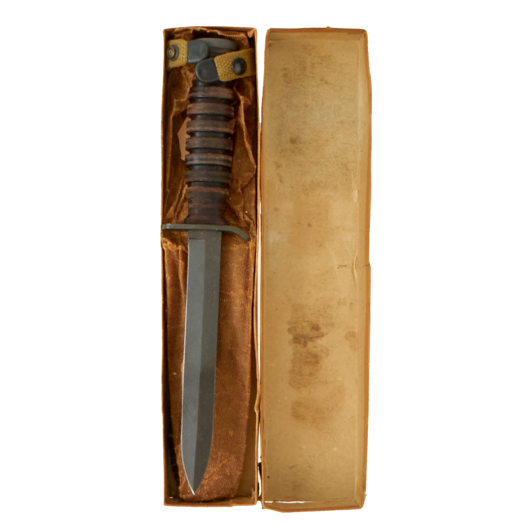 Original Item: Only One Available. An excellent condition WWII Mark 3 U.S. fighting knife with the guard stamped, U.S. M-3 BOKER. The blade retains 99% of the original finish and has not been sharpened retaining its original edge. The handle and stacked leather grip are in superb condition. The original scabbard is marked, U.S. M8 B.M. CO and also in excellent condition.