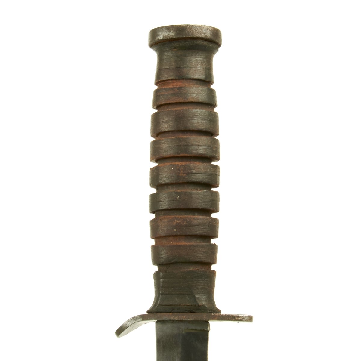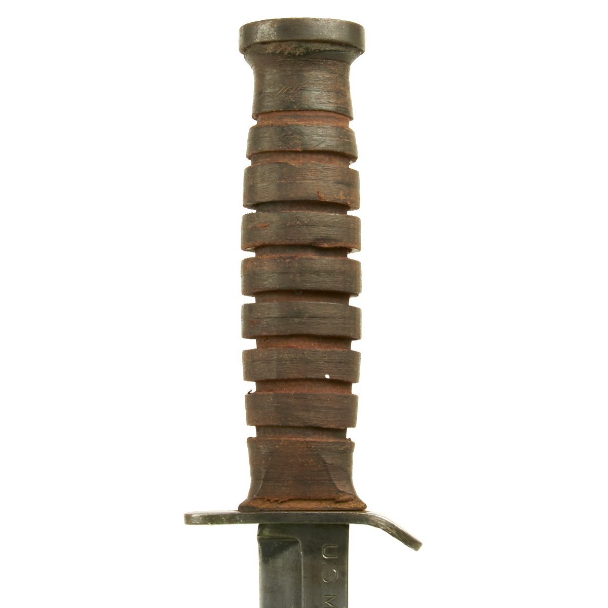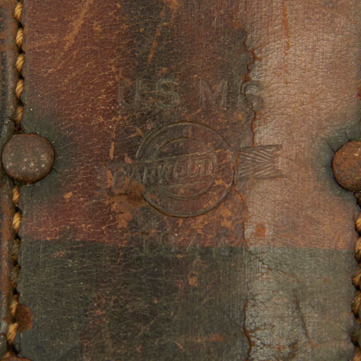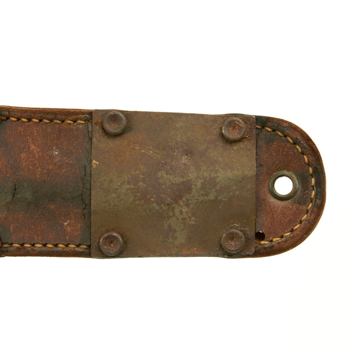 The original M6 leather scabbard is marked, U.S. M6 BARWOOD 1943 and in very good period used condition with no major imperfections or tears. The securing strap and snap are still functional and complete. The scabbard shows age and use but