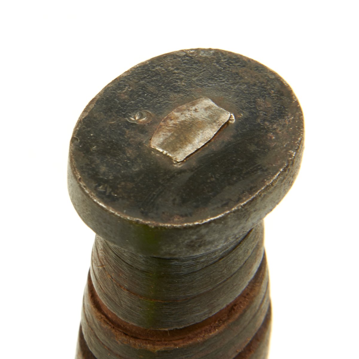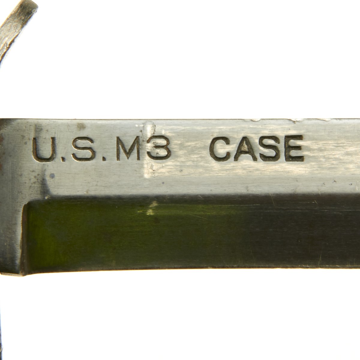 Original Item: Only One Available. A fine WWII period Mark 3 U.S. fighting knife with the blade deeply stamped, U.S. M3 CASE. This is the earlier scarce blade-marked version rather than guard-marked example. The blade shows 85% original finish is still razor sharp and offered in very good condition. The handle and stacked leather grip are in excellent condition.