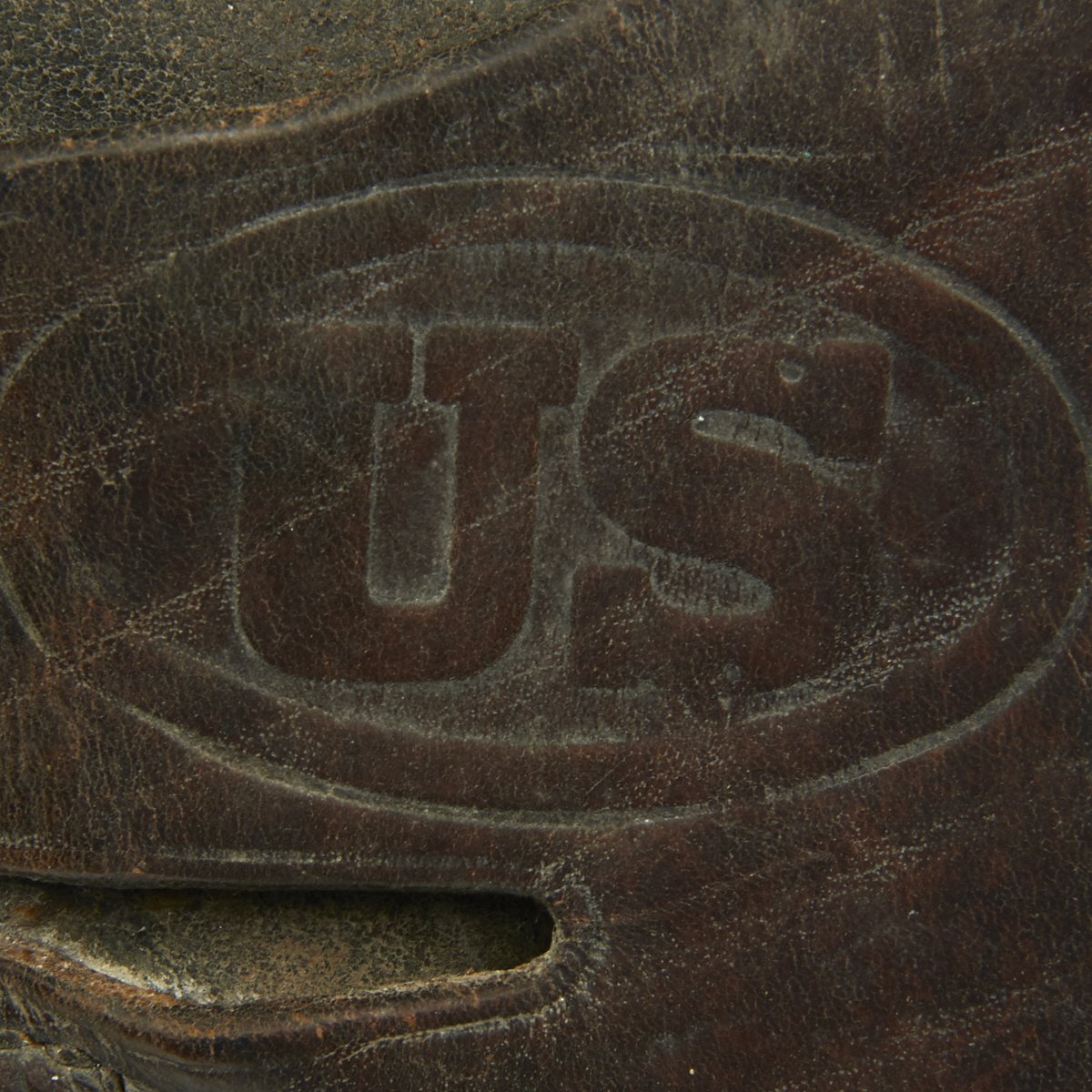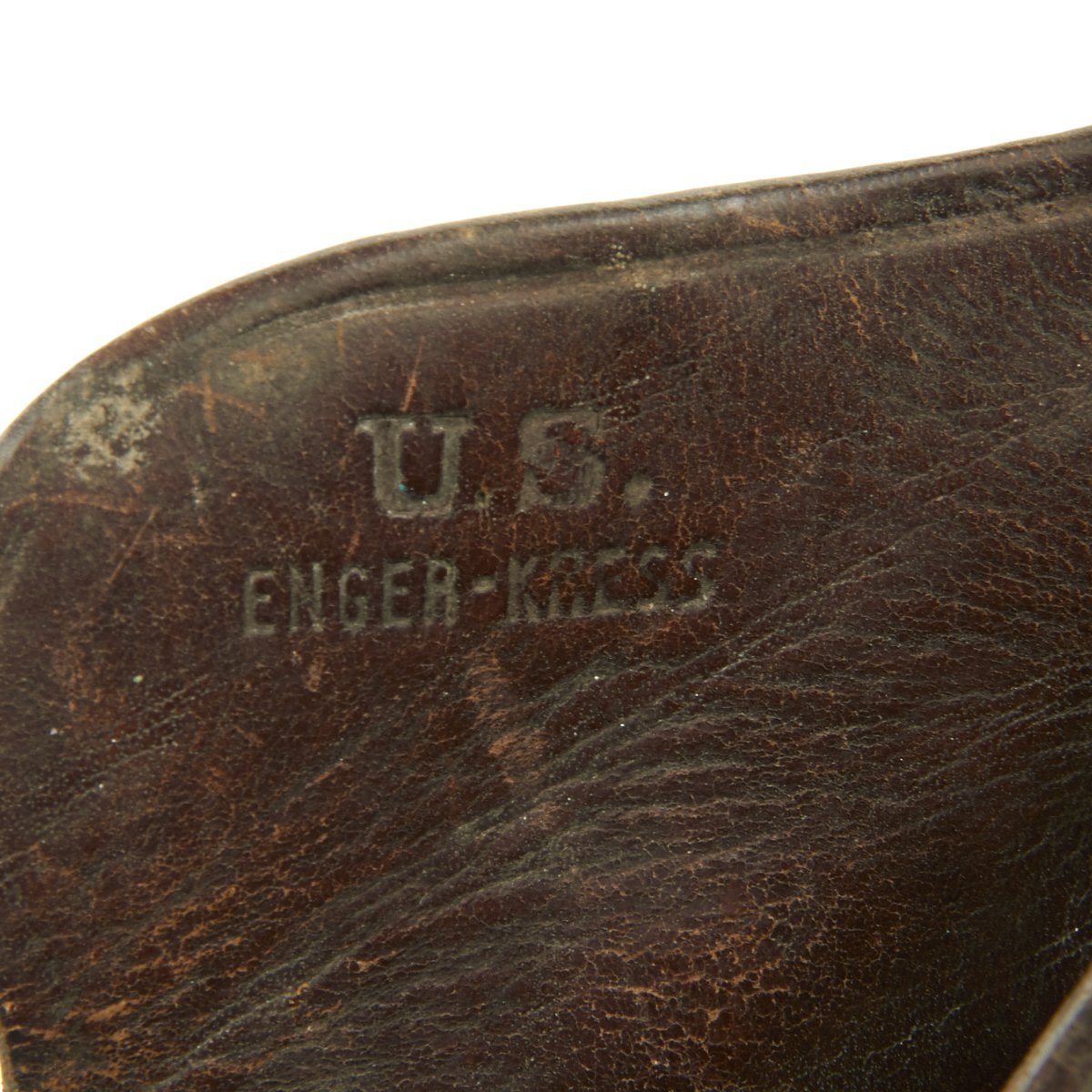 Original M3's were made in plain, "natural" leather, as they age they can darken through exposure to oil, dirt, and sweat that turns holsters a russet brown color. This example is a nice aged deep brown color, with wear to the finish from use. Leather is still soft and pliable, though it could use a good conditioning if intended for use. It is embossed on the front U.S. in an oval, meaning it was military issues (not civilian) and it is nicely stamped on the reverse: