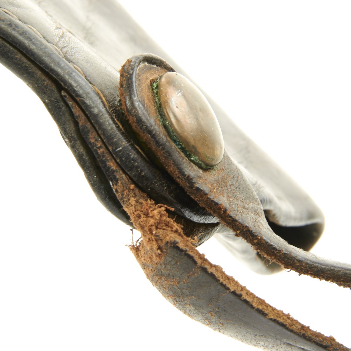 Offered in good condition with all original brass snaps and buckles in fully functional condition, though most of the original factory "blackened" finish has worn off. Only real issue is that the belt loop leather is quite worn where it attaches to the holster.