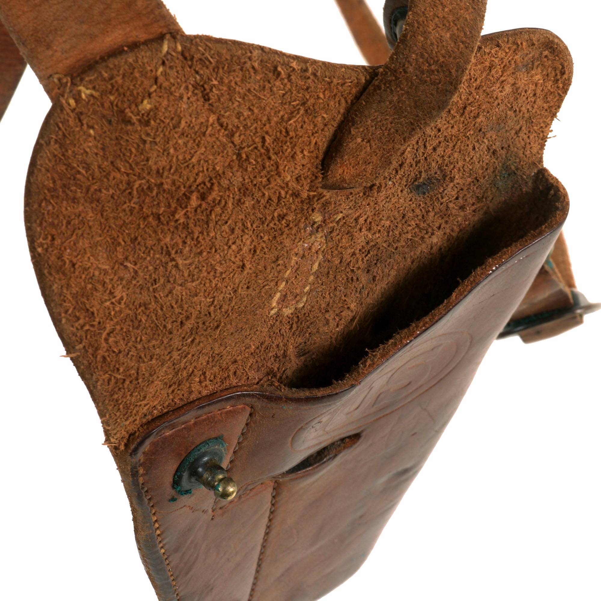 The leather is still soft and pliable, though there is definitely wear and some very minor dry rot on the leather. This is especially noticeable on the shoulder strap, which has a lot of leather crazing as well. There is also a bit of verdigris on the metal fittings and snaps.