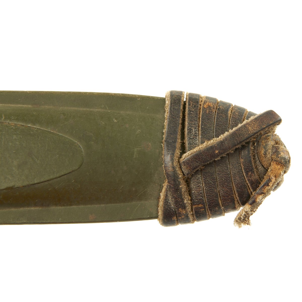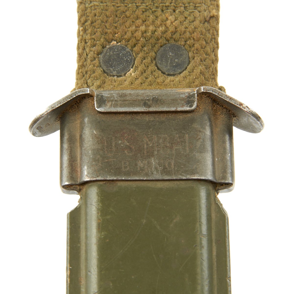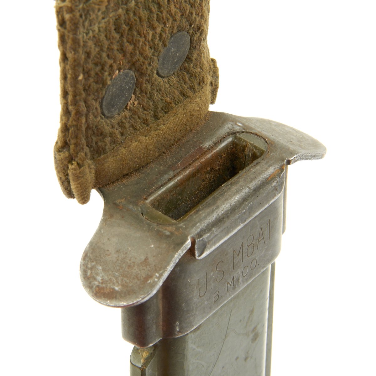 The original scabbard is marked, U.S. M8A1 / B.M. CO and is in very good condition with no major defects to note. The canvas is very good, with just a bit of dirt and staining, and there is some wear and light scratching on the scabbard shell. The metal finish is somewhat oxidized and worn, but looks great, and there is still the leather leg tie down, wrapped around the bottom of the scabbard. The scabbard was manufactured by Beckwith Mfg Co. a division of Victory Plastics.