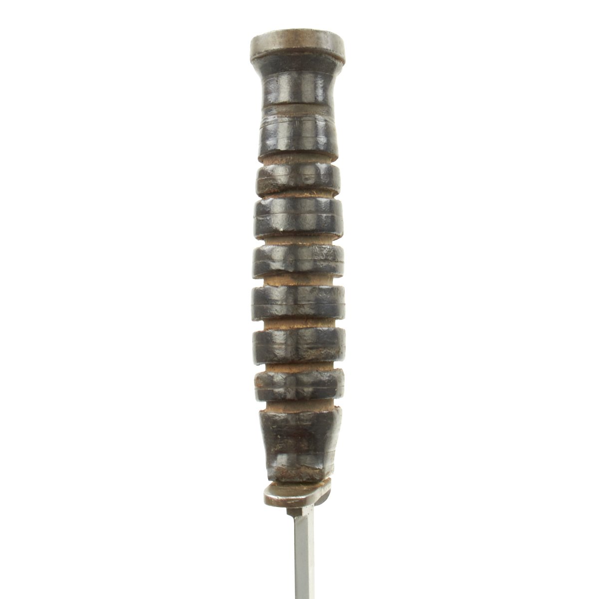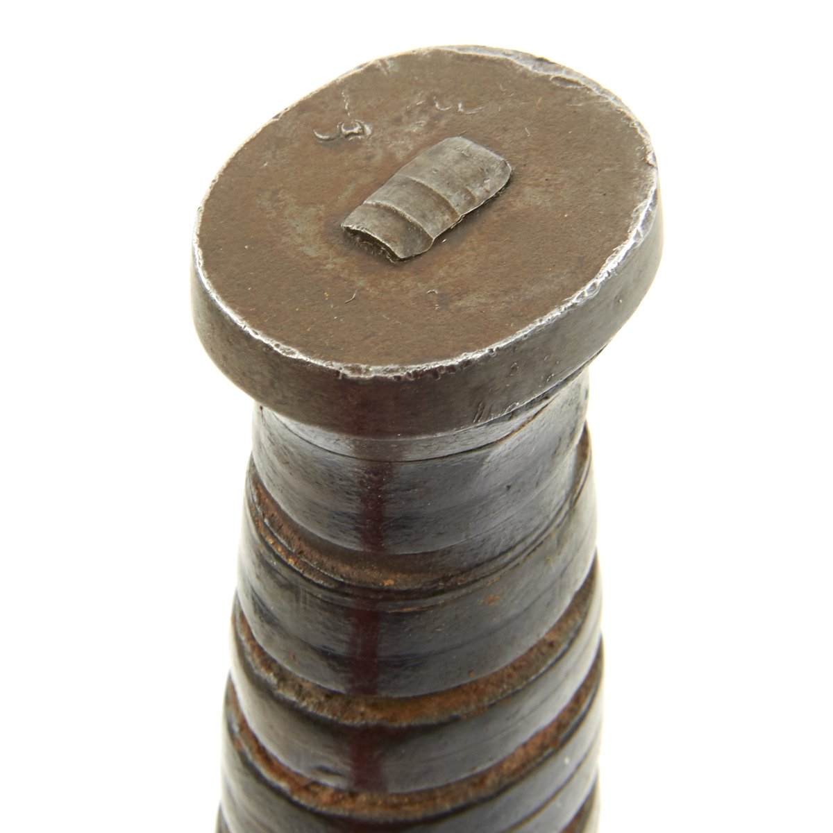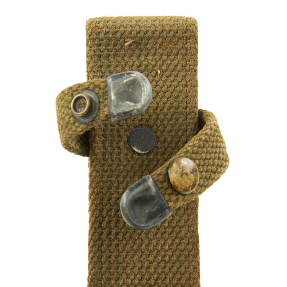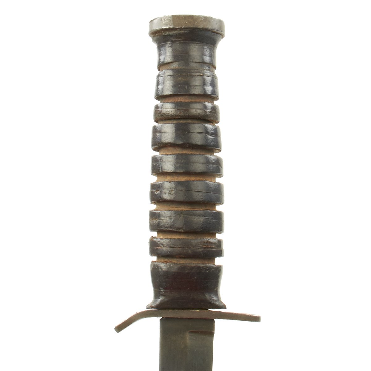The original scabbard is marked, U.S. M8A1 / B.M. CO and is in very good condition with no major defects to note. The canvas is very good, with just a bit of dirt and staining, and there is some wear and light scratching on the scabbard shell. The metal finish is somewhat oxidized and worn, but looks great, and there is still the leather leg tie down, wrapped around the bottom of the scabbard. The scabbard was manufactured by Beckwith Mfg Co. a division of Victory Plastics.