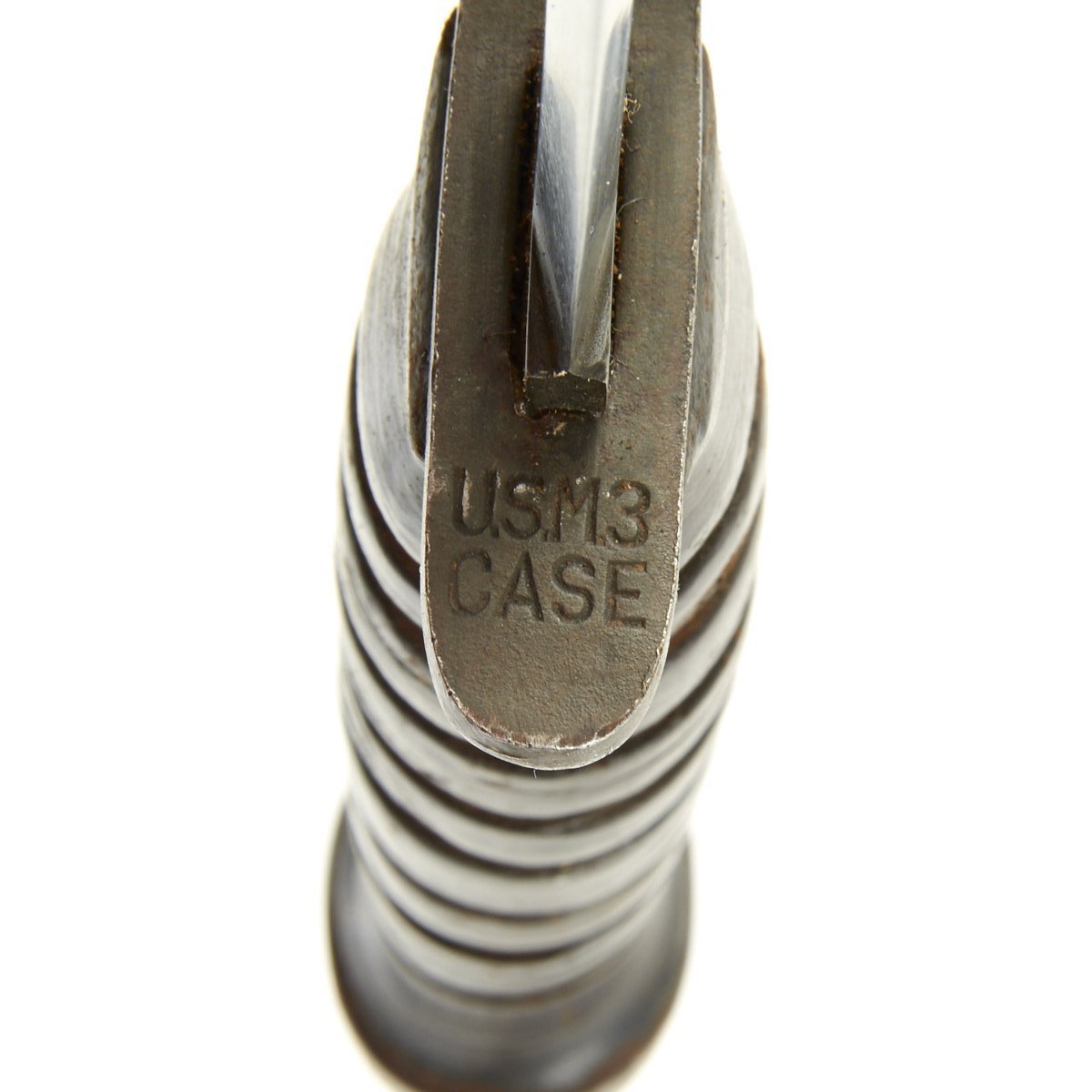 Original Item: Only One Available. This is a good WWII period Mark 3 U.S. fighting knife, with the guard deeply maker stamped, U.S. M3 / CASE. The 6 3/4 inch spear point blade is in good condition, though it definitely was used, and may have been arsenal reblued after sharpening. The blade is still quite sharp on the top and bottom edge, though there is a nick on the top edge. The handle and stacked leather grip are in similar condition, and is nicely broken in. There are no major cracks, and the leather is still soft, though due to shrinking the cross guard is loose. The bottom of the pommel shows a partial U.S. "Flaming Bomb" proof mark.