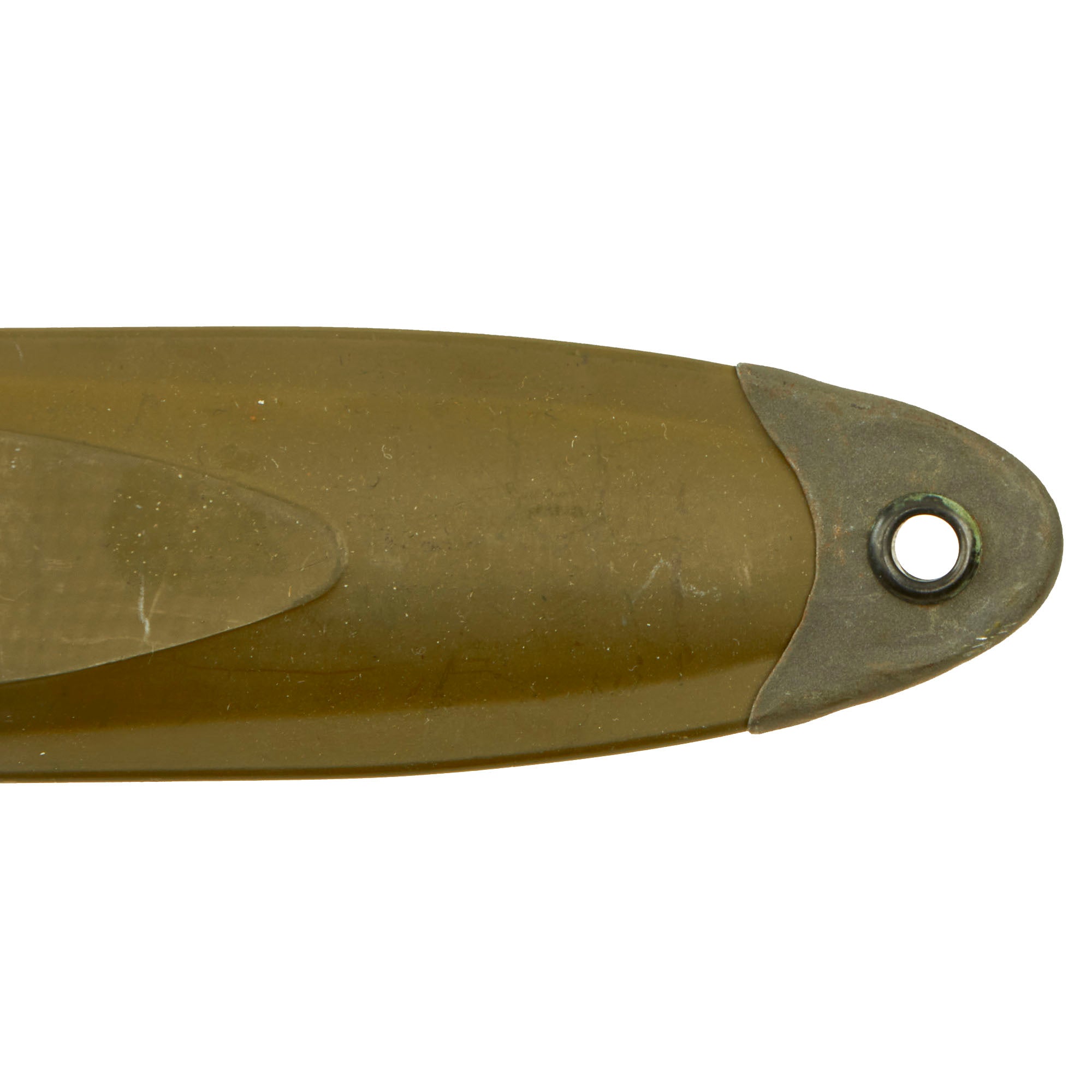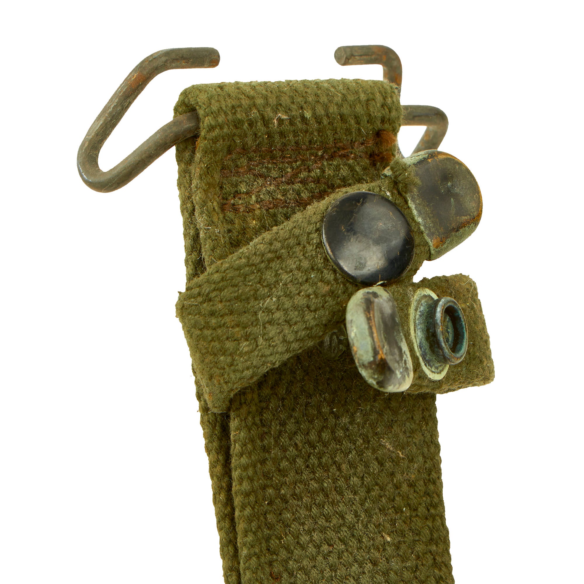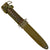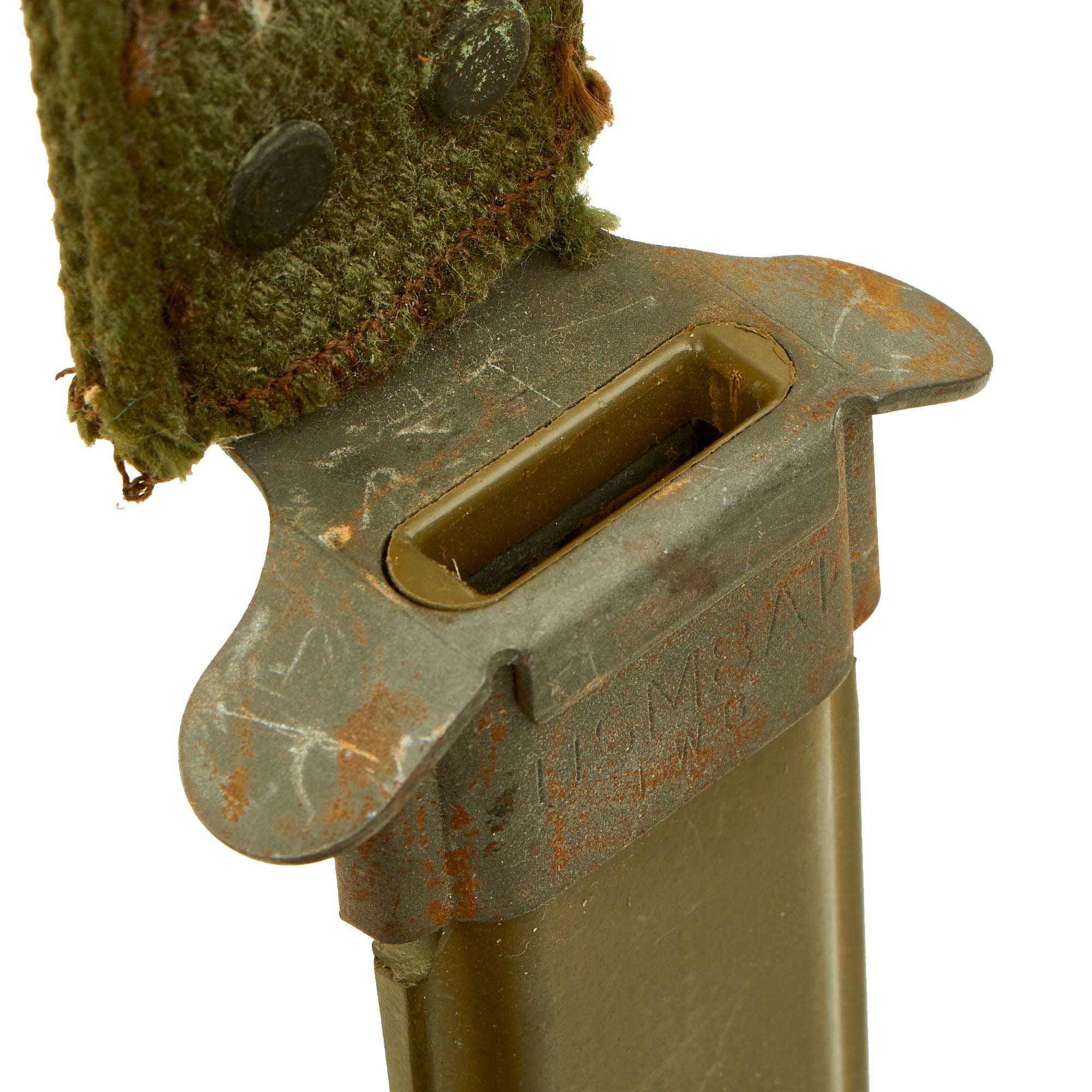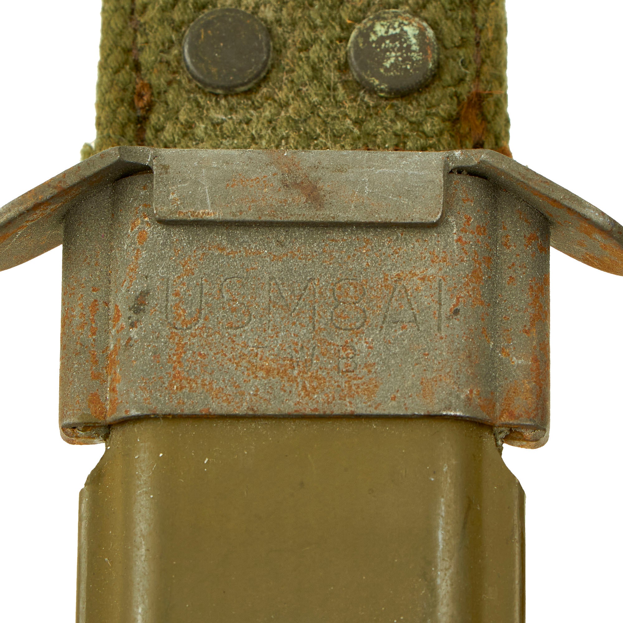 This lovely knife comes with an OD green scabbard marked U.S. M8A1 / T W B, also in offered in very good condition. This design features a thermoplastic impregnated duck canvas body, metal throat, and canvas frog and securing strap with a steel pistol belt hook. The scabbard is still fully functional, with a functional retaining strap, but does show wear and use. The canvas is somewhat dirty and discolored, and the finish on the metal fittings is mostly worn away. The body has been repainted once, which now shows some wear through.