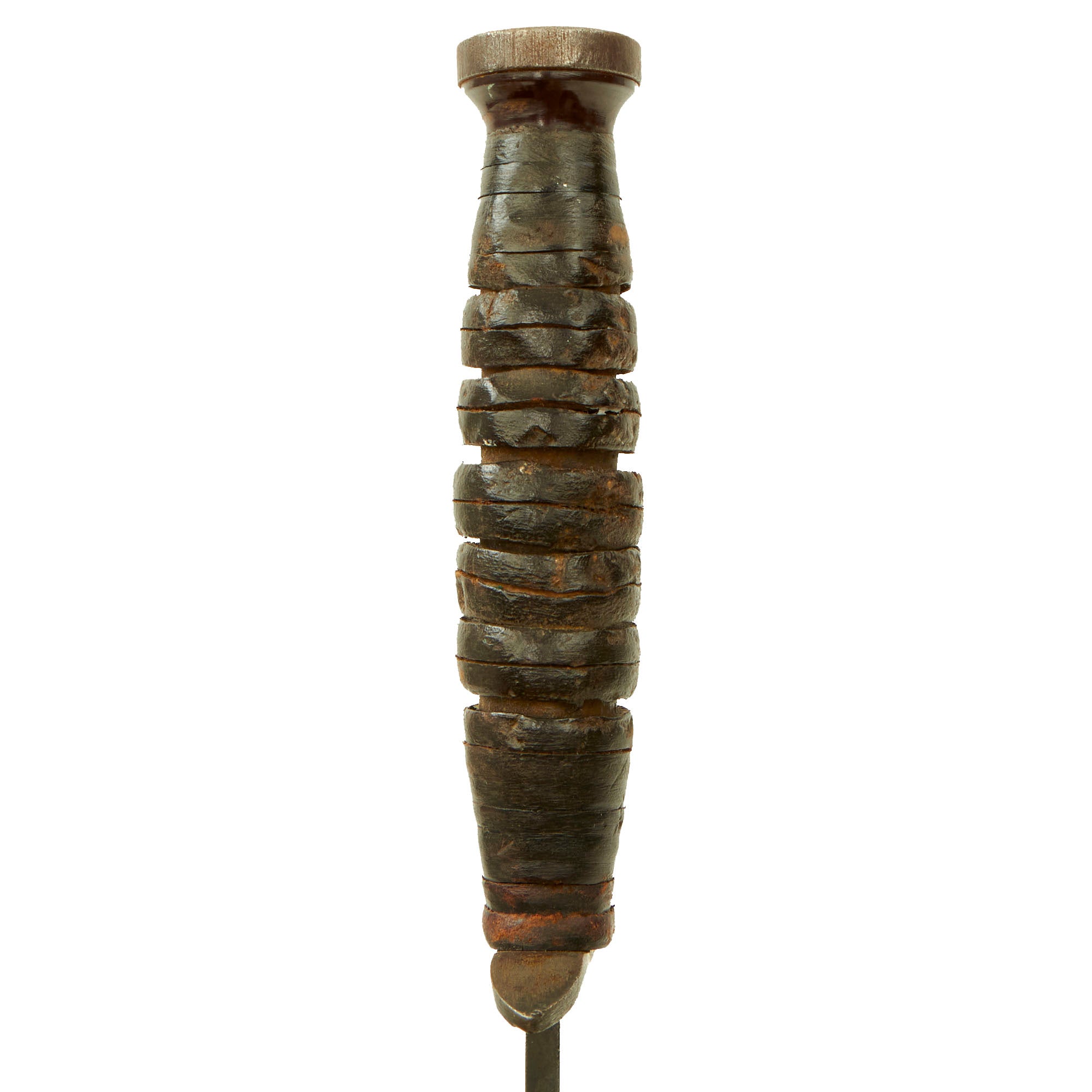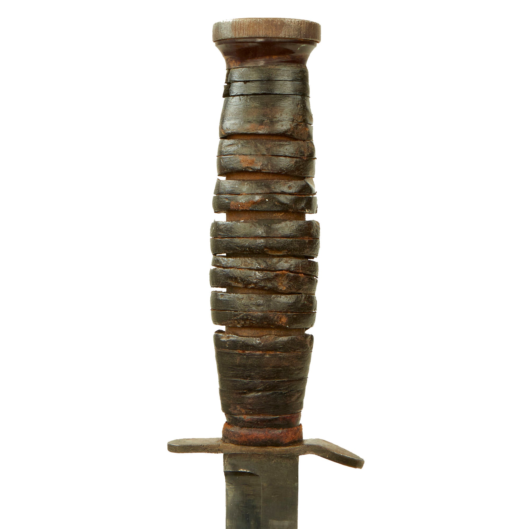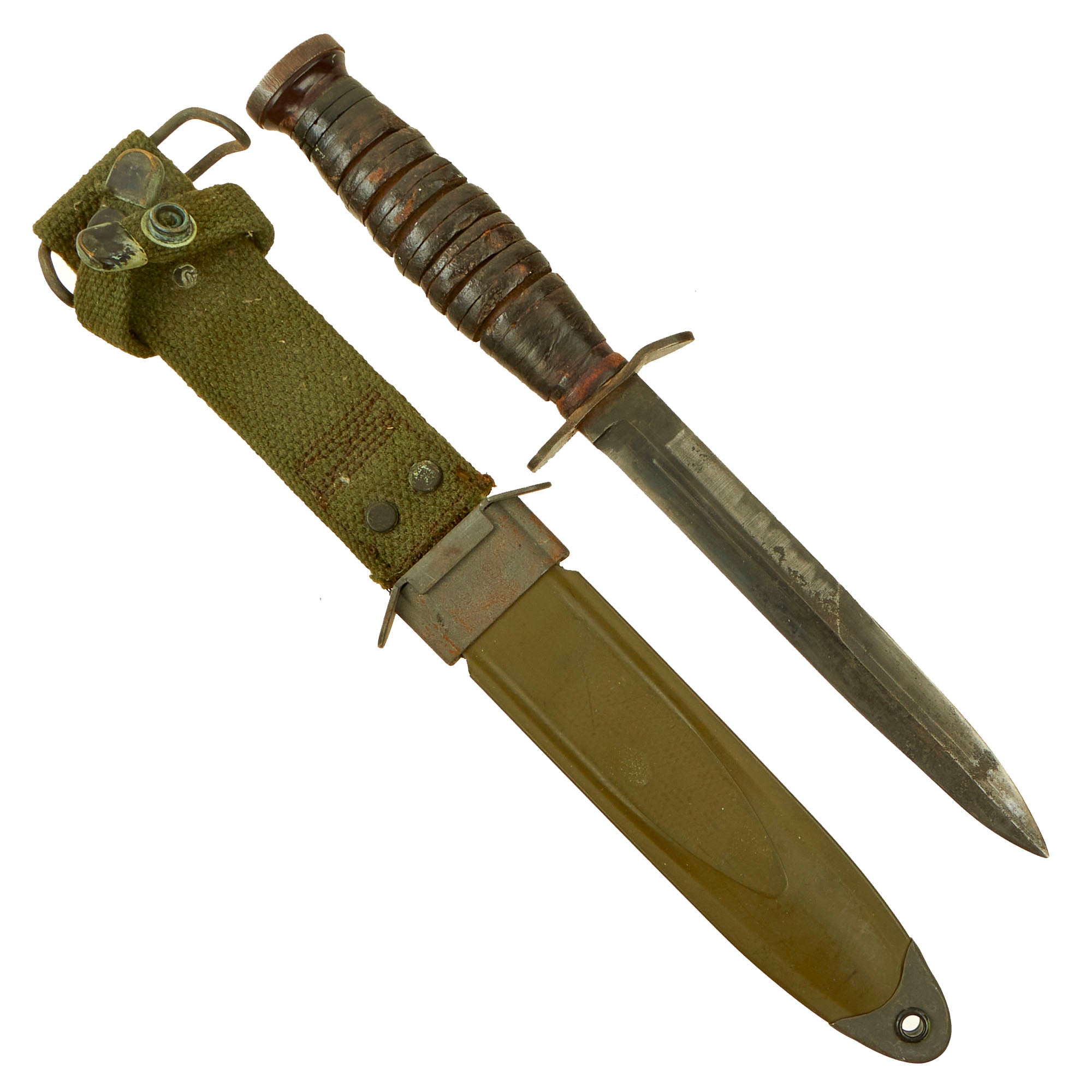 Original Item: Only One Available. This is a very nice service used example of a WWII M3 U.S. fighting knife, made by the desirable maker Imperial Knife Co. of Rhode Island. This company was at the time one of the largest knife makers in the world, founded by Italian immigrants. With the markings on the crossguard, this is the third and final pattern manufactured in the war. It comes complete in the correct M8 scabbard, which was updated during the war to the M8A1 standard. These fighting knives were preferred by American infantry during World War Two for hand to hand combat.