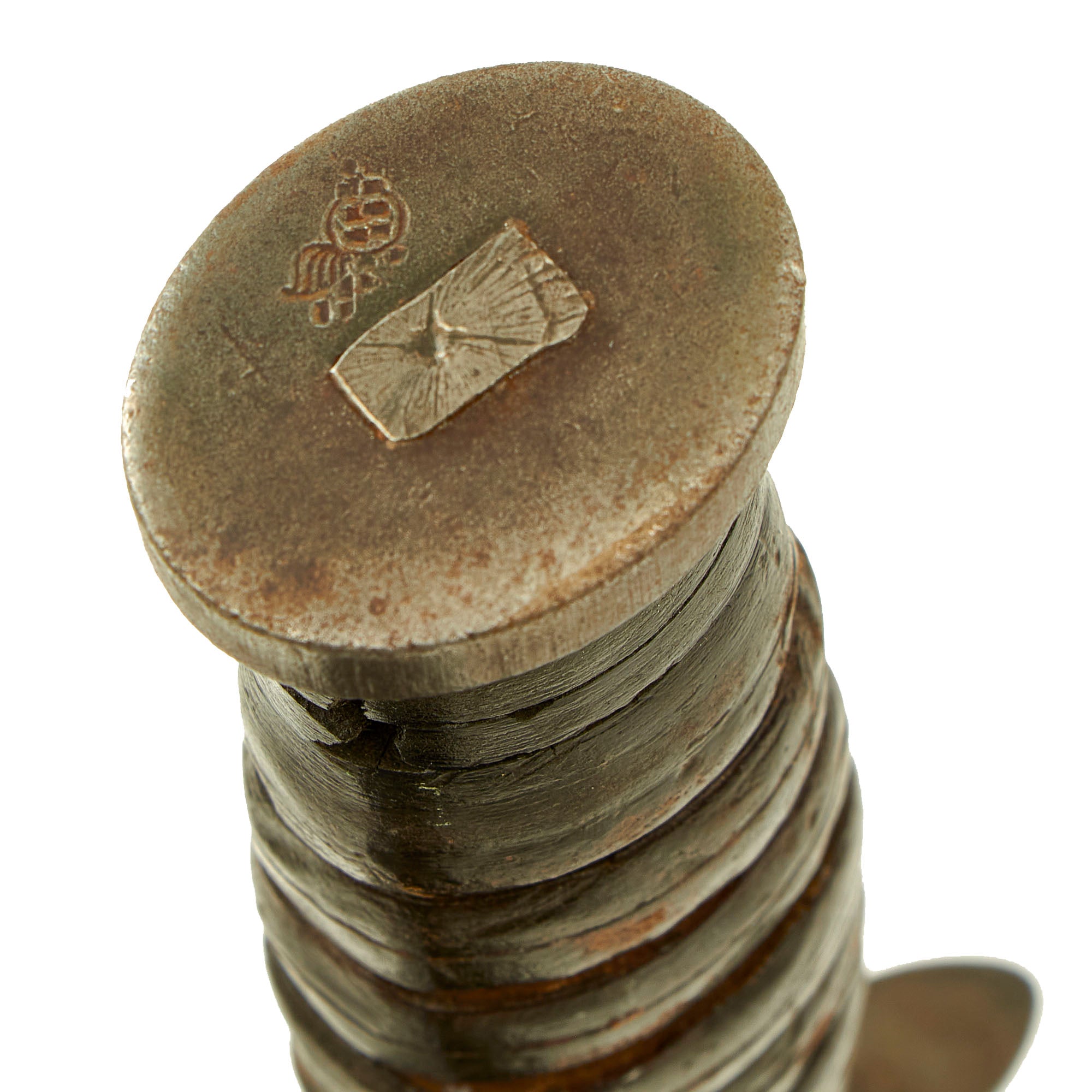 The handle and stacked leather grip are in good service used condition, showing staining, rounding and cracking consistent with service use. It is now a very dark brown, and looks in the past to have been conditioned using saddle soap. The crossguard is still in the correct shape, straight with a forward bend at the top for the thumb, and is still tight to the blade with no wobble. The bottom of the pommel shows the U.S. "Flaming Bomb" ordnance proof mark and correct "starburst" peened over tang, though polishing has made them very faint.