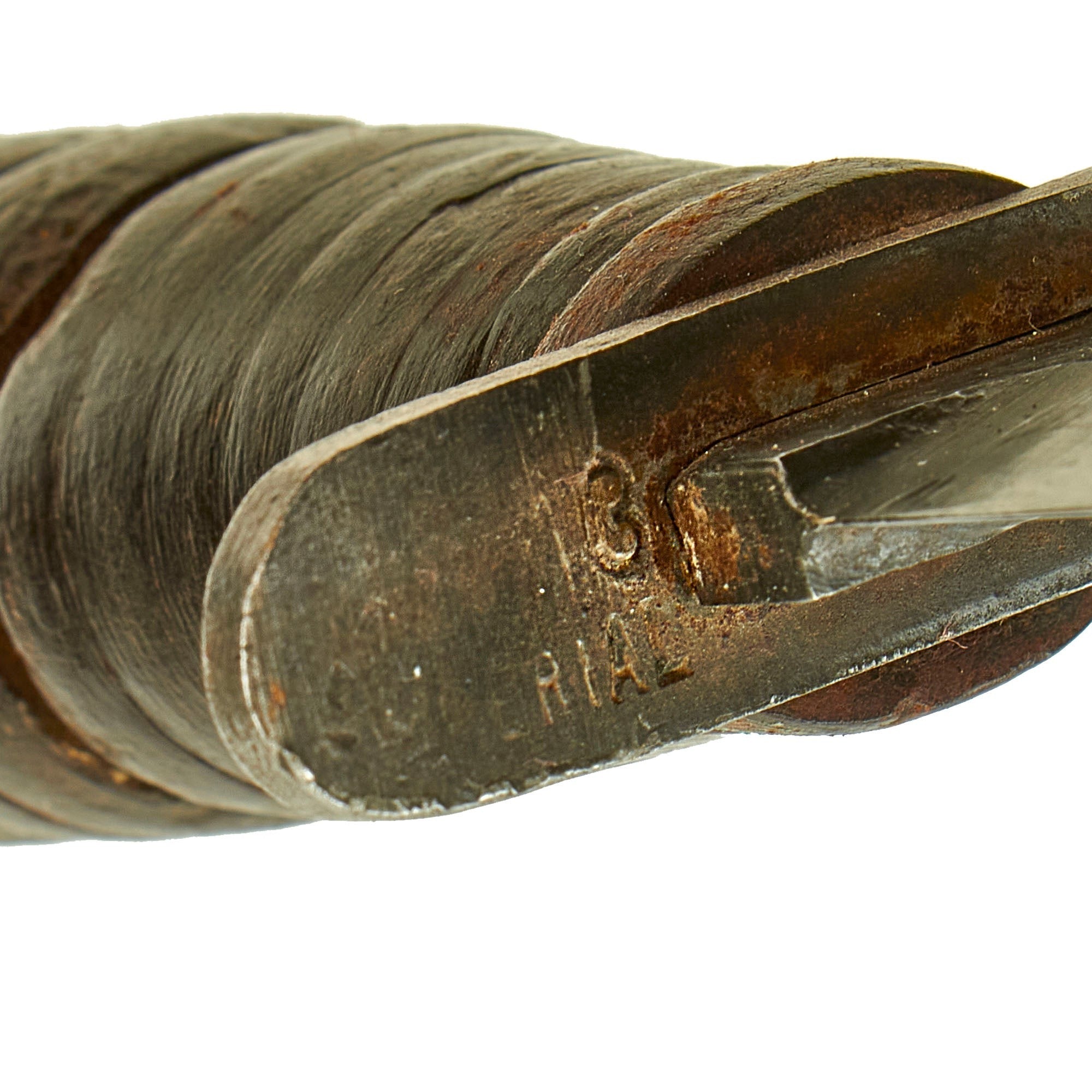 This knife is later war production, indicated by the maker information being stamped into the crossguard: U S M3 / IMPERIAL. The 6 3/4 inch spear point blade is in great shape, showing very little damage and a great shape. However, it has pitting towards the tip of the blade. There are some traces of past oxidation, but it does not look to have been worn down by the polishing of the pitted areas. The pommel cap and crossguard have also been polished to some degree.