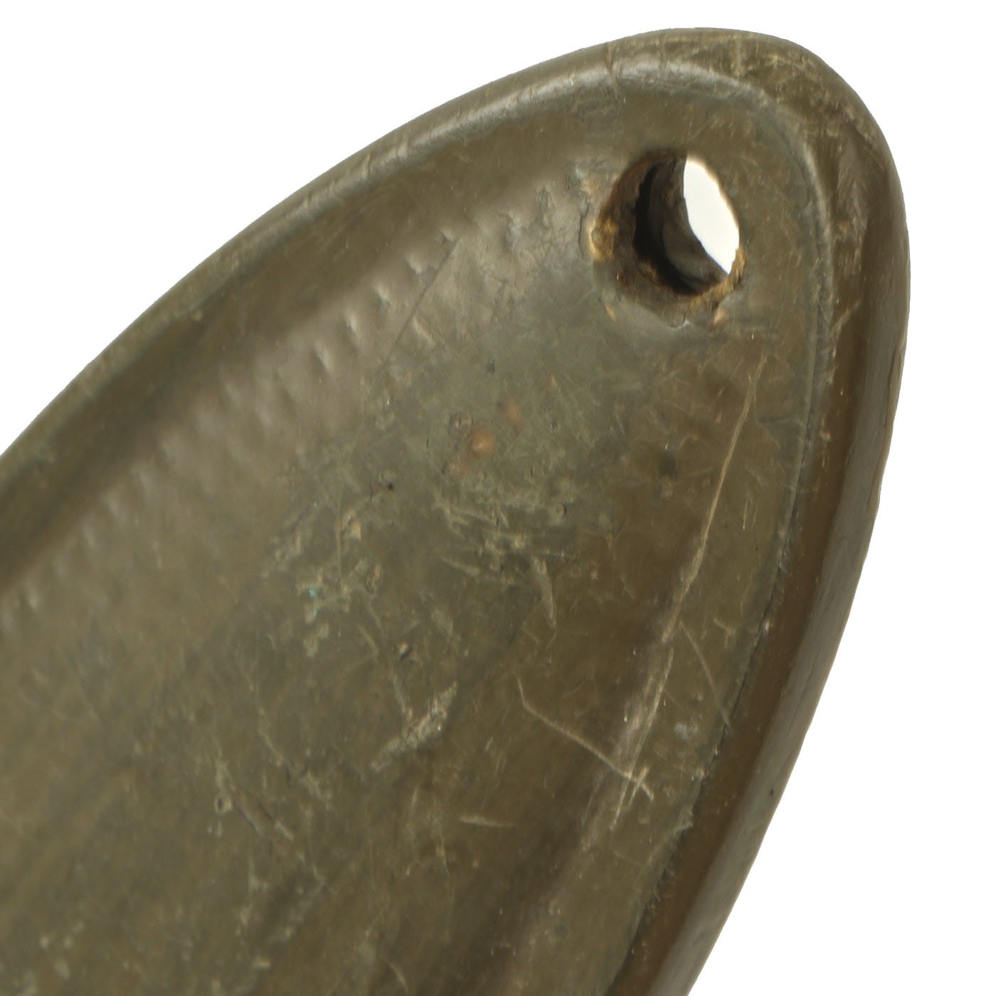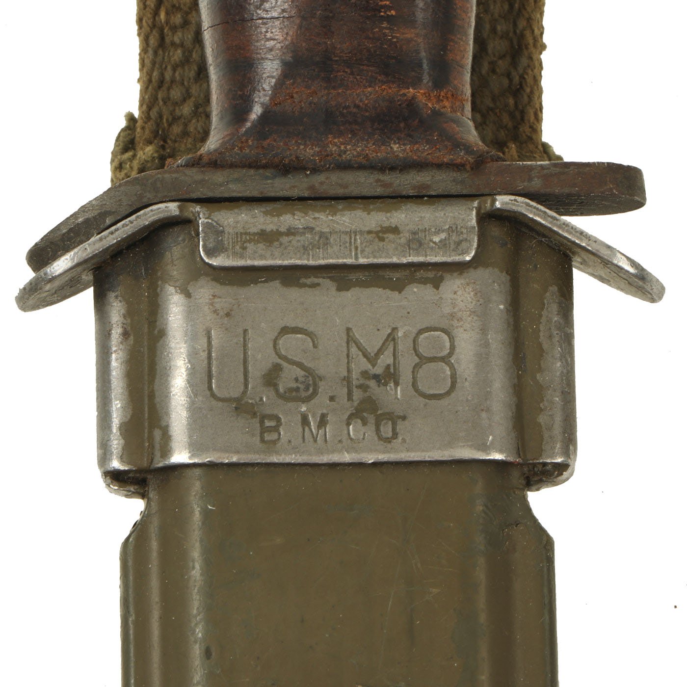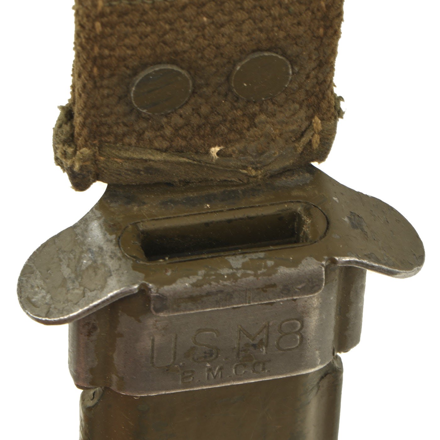 The original scabbard is marked U.S. M8 / B.M. CO and is in very good condition, with moderate overall wear. The scabbard was manufactured by Beckwith Mfg Co. a division of Victory Plastics. This is the earlier pattern of the scabbard, made without the retaining loop, though it was later updated to have one. These feature a thermoplastic impregnated cotton fabric body, metal throat, and canvas frog and securing strap. The scabbard is still fully functional, with a functional retaining strap, but does show wear and use. The canvas does show wear, and the finish on the fittings is mostly worn away. The body has been repainted darker green, and now has a worn finish.