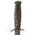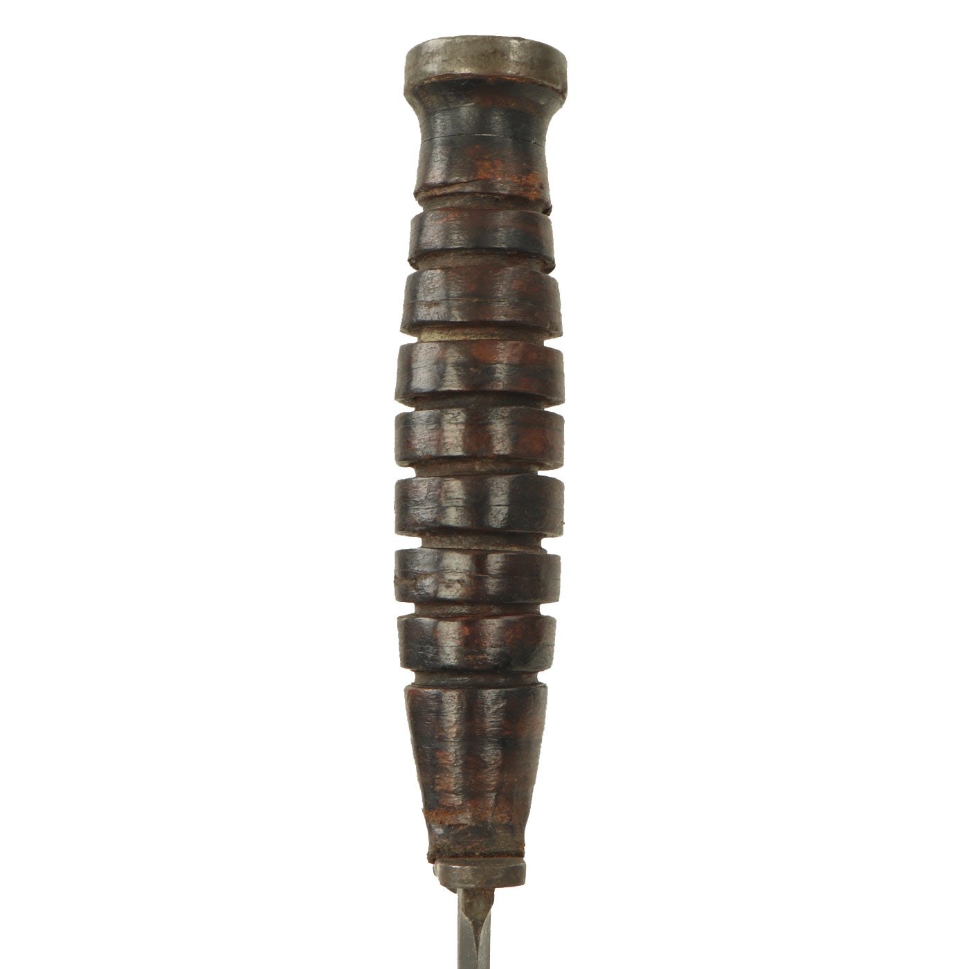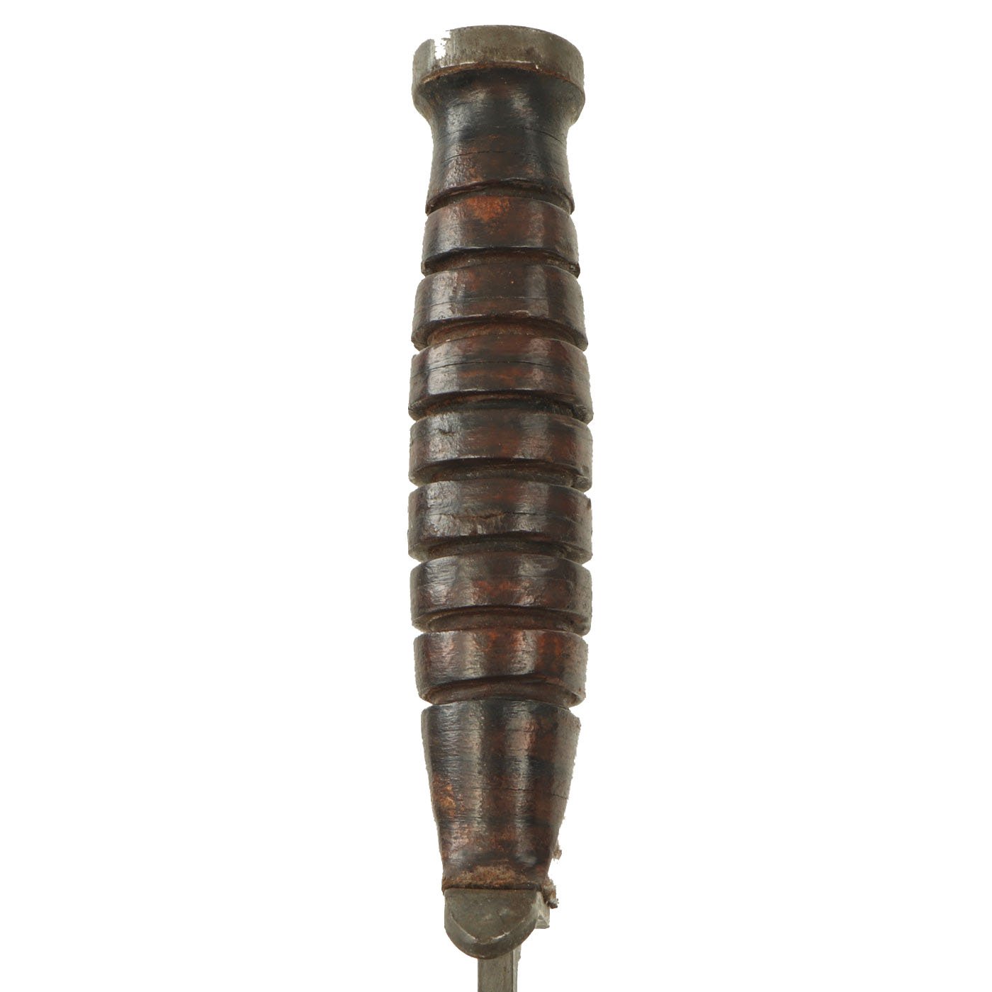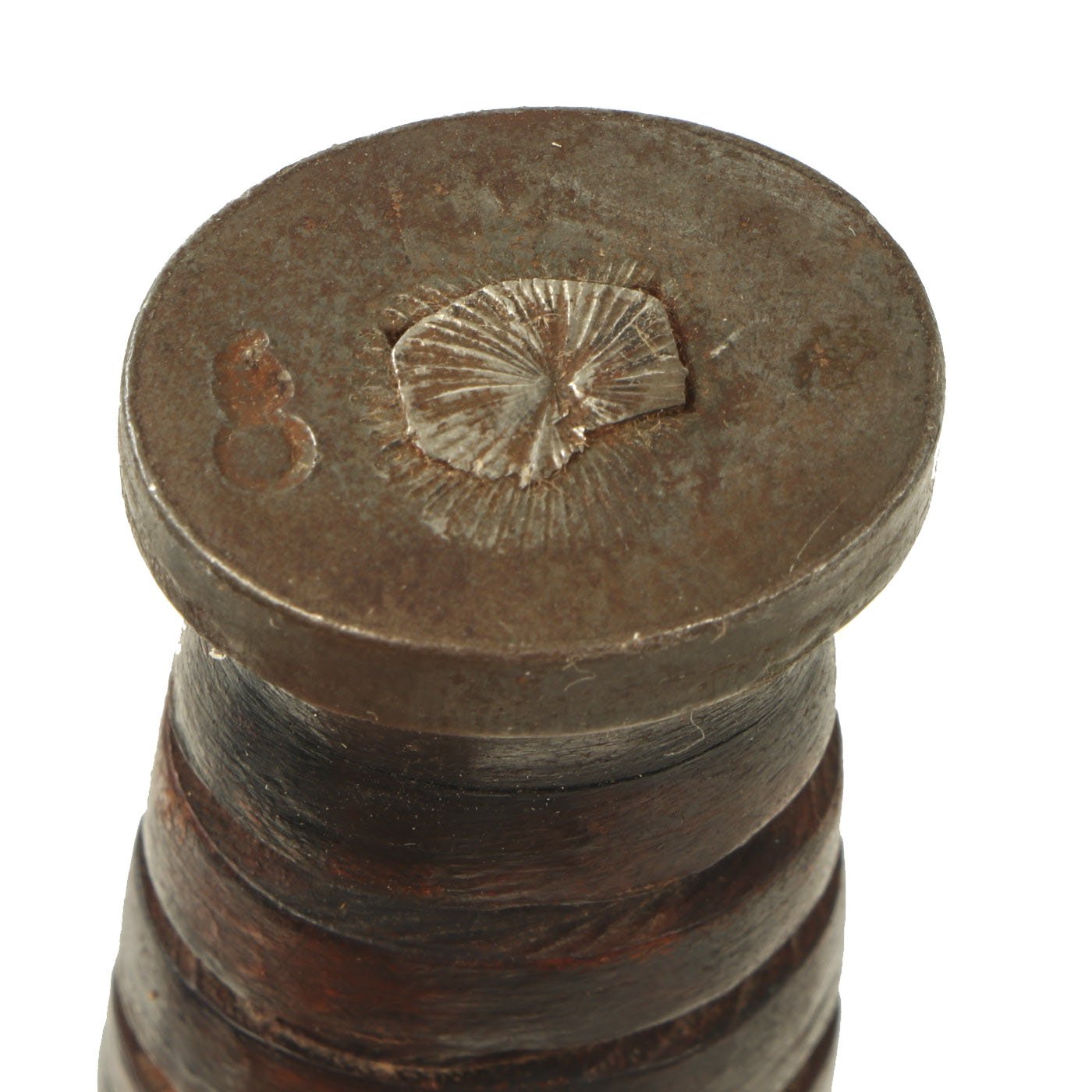 The handle and stacked leather grip are in very good condition, with no major issues or cracking. It has only light wear, with some rounding of the groove edges. The crossguard is still in the correct shape, straight with a forward bend at the top for the thumb, and is still tight to the blade with no wobble. The bottom of the pommel shows the U.S. "Flaming Bomb" ordnance proof mark and correct "starburst" peened over tang.