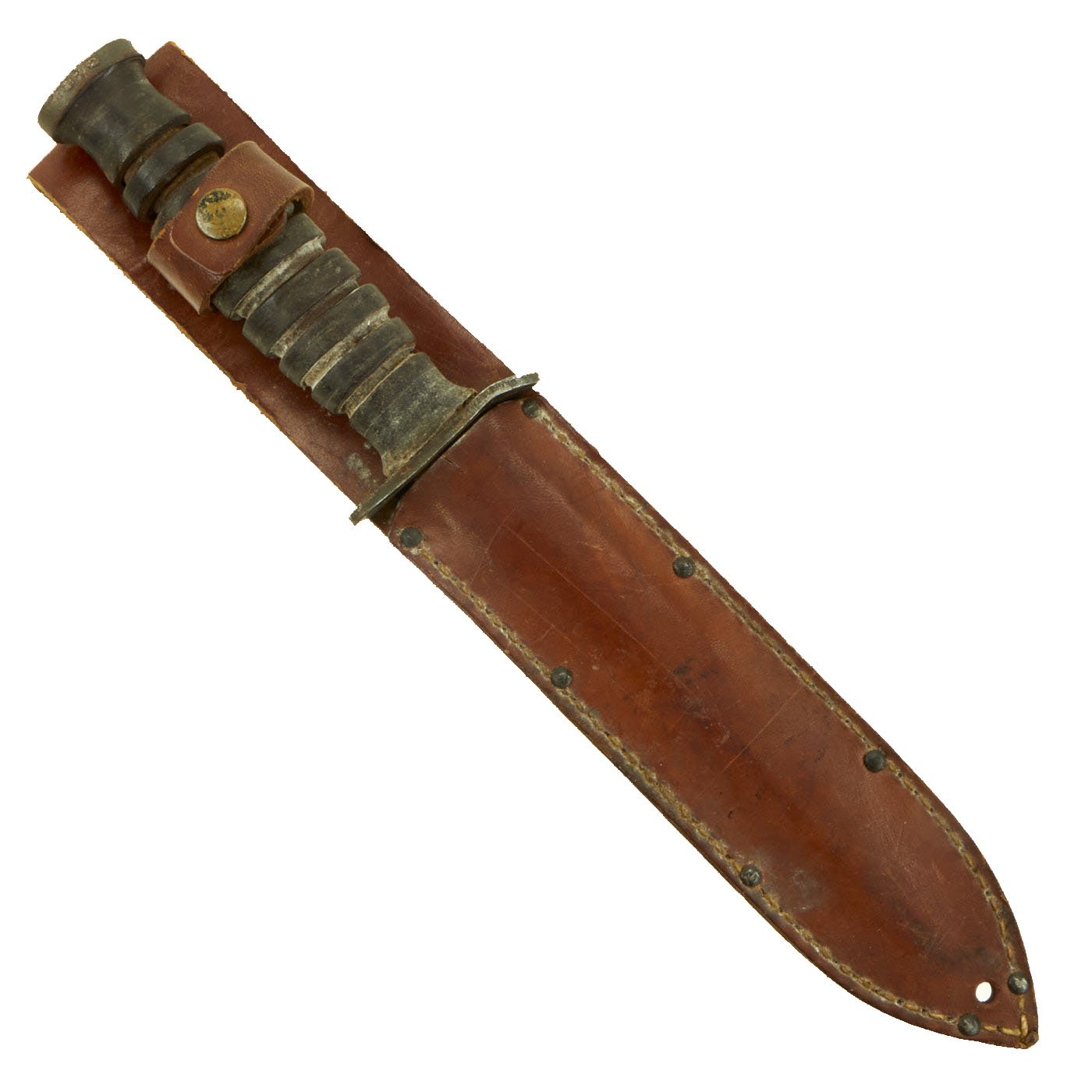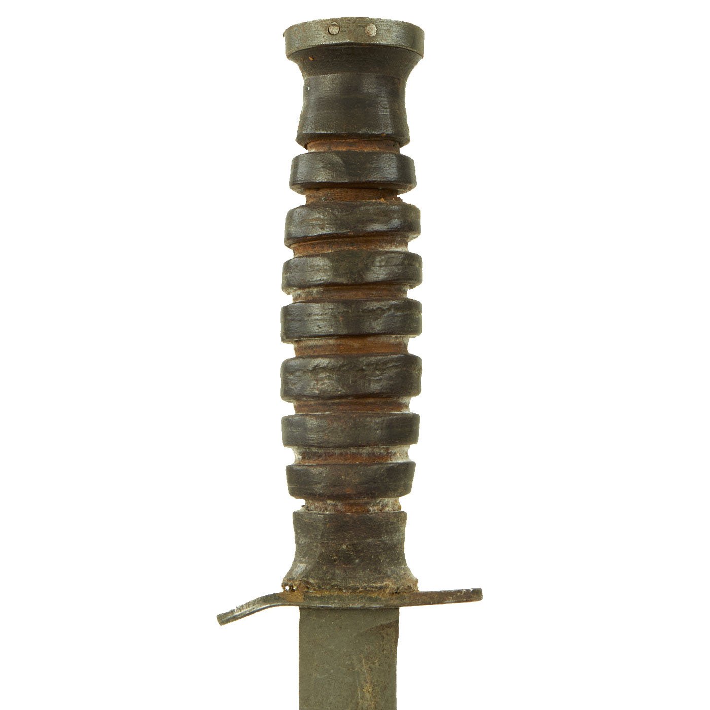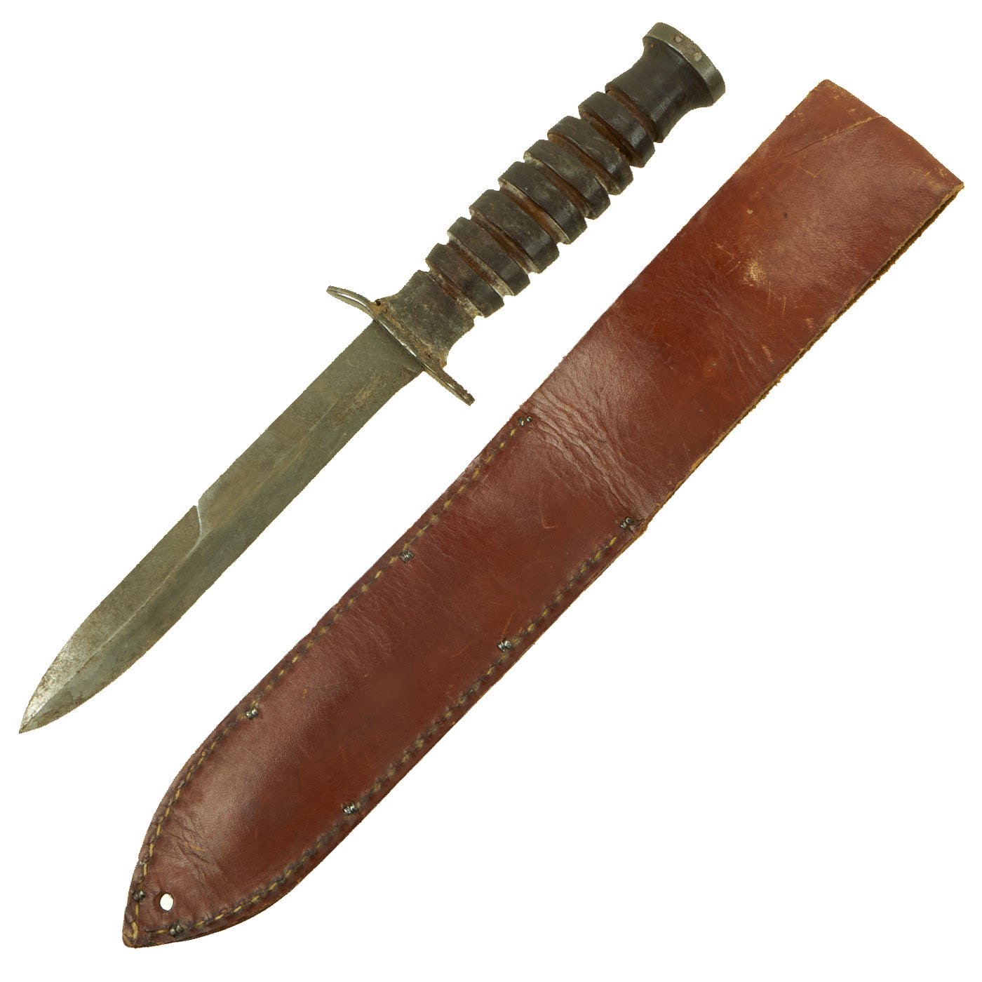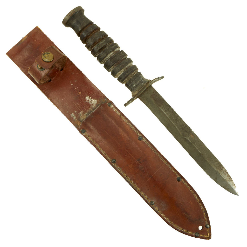 It is definitely original WWII U.S. production, and still has the correct "flaming bomb" on the pommel, which is secured by two cross pins. Based on this, the knife was most likely made by Camillus Cutlery, who used two cross pins on their knives, compared to the peened tang used by most. These fighting knives were preferred by American infantry during World War Two for hand to hand combat.