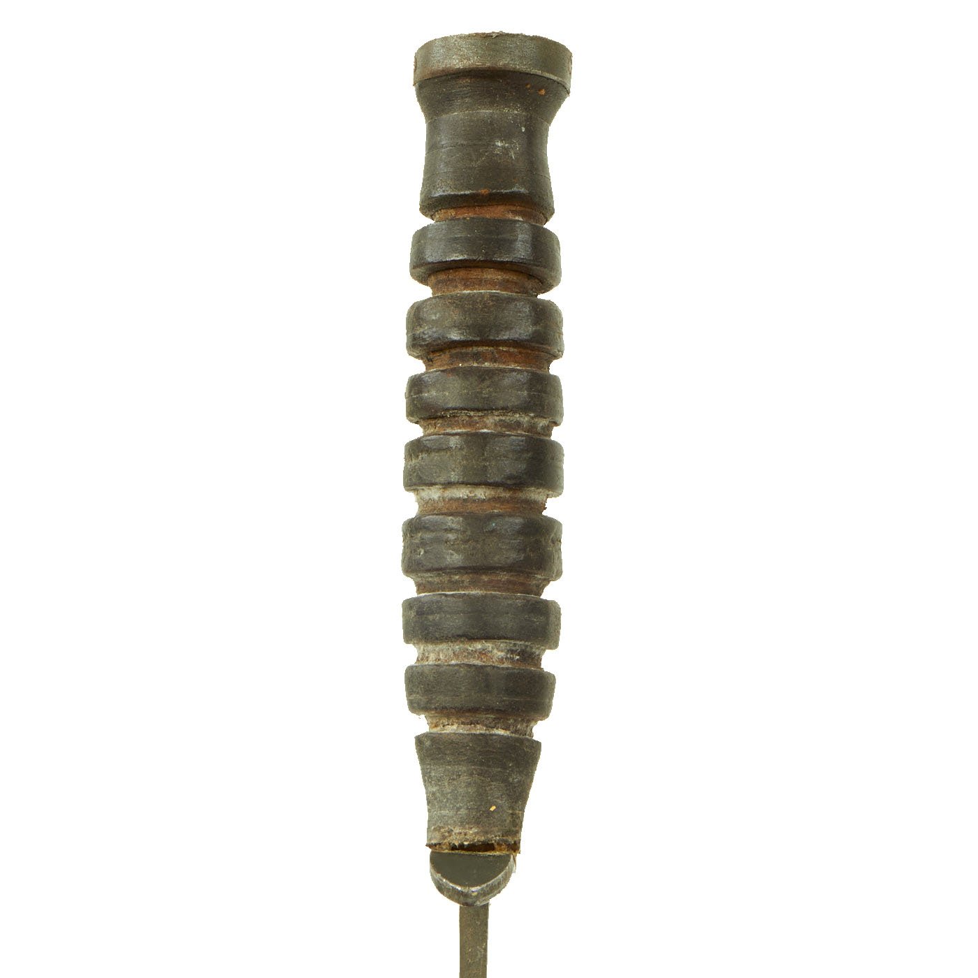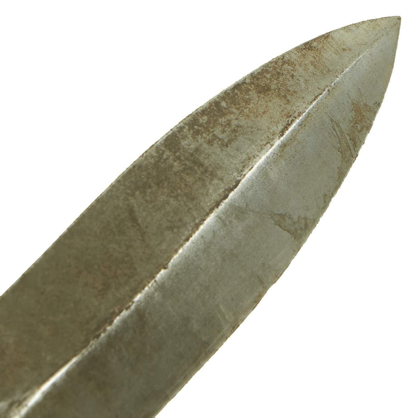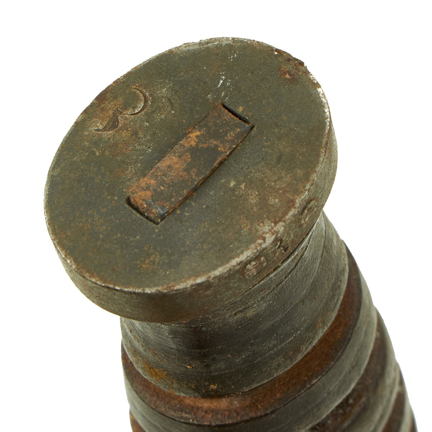 Original Item: Only One Available. This is a very nice service used example of a WWII M3 U.S. fighting knife, which for some reason had the original maker markings on the blade ground away. Close inspection of the blade shows that there is still the remains of a number 3 close to the start of the upper edge, which originally would have been the end of a "1943" date. This means that this was originally an example of the scarce 1st pattern of the M3 knife, which had both the maker name and date on the blade.