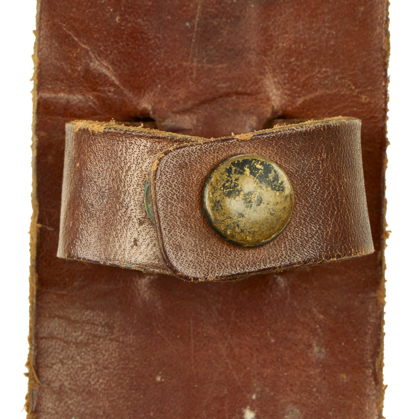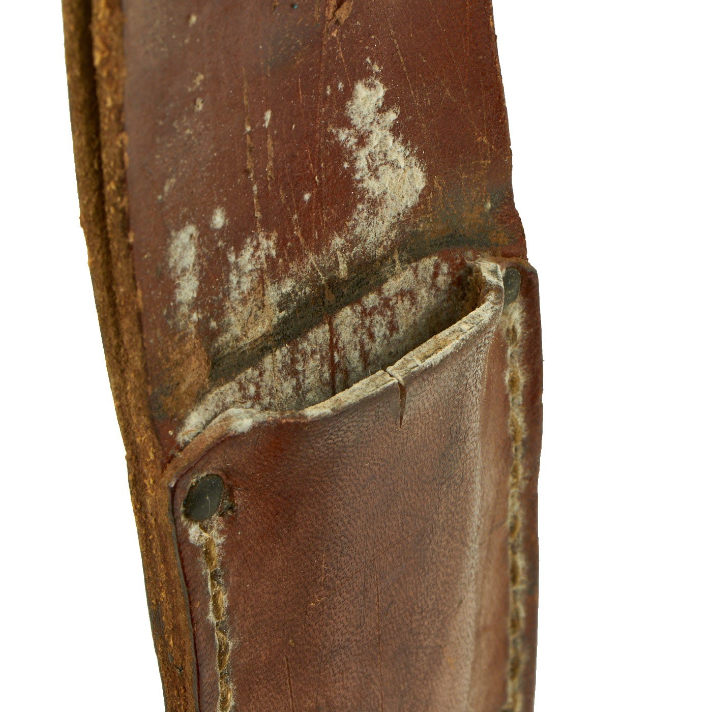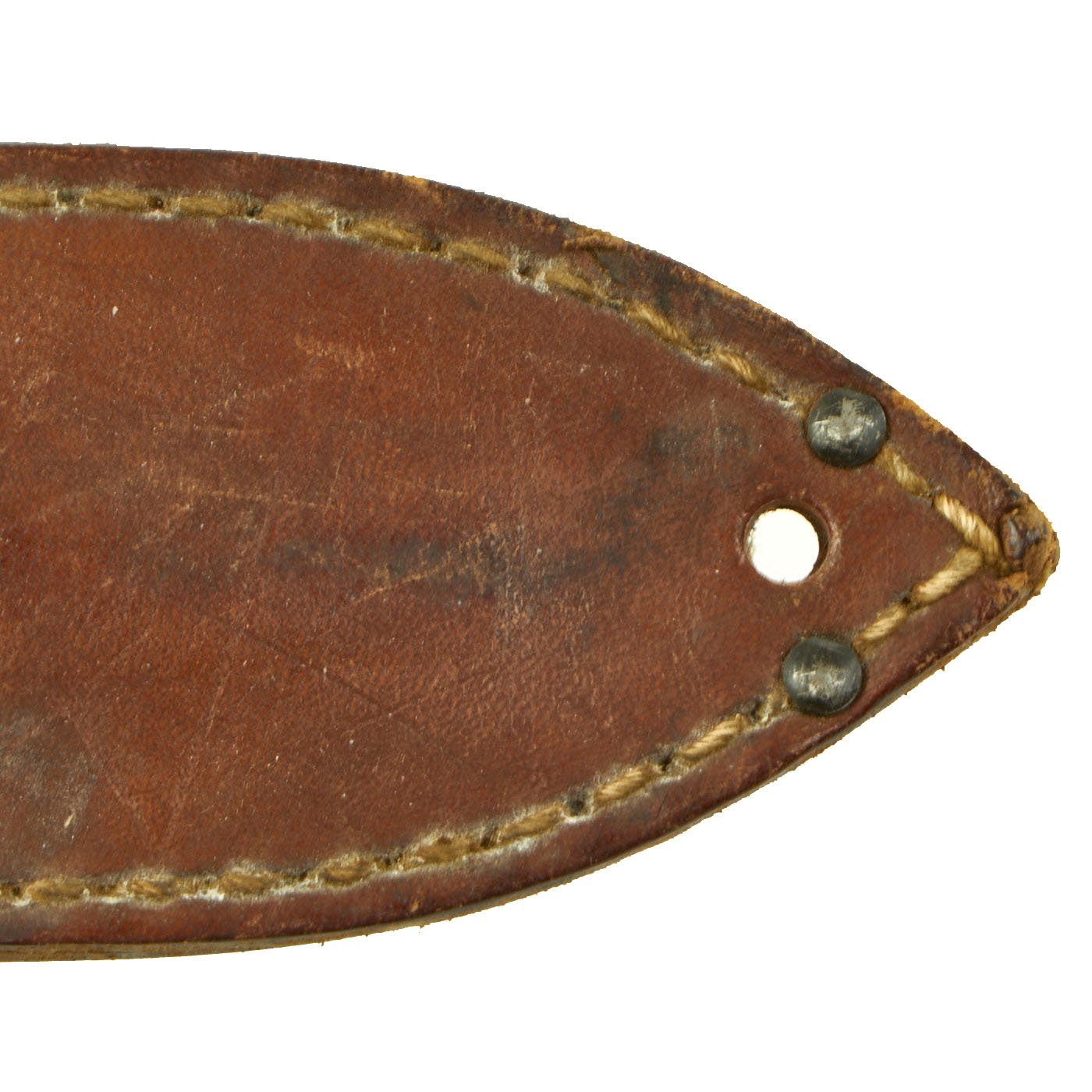 The included scabbard is a relatively standard private purchase type, very similar to the ones used with the U.S. Navy Mark 2, but designed for the spear point profile of the M3. It has a belt loop at the top, with an intact securing strap, and it is in very good condition.
