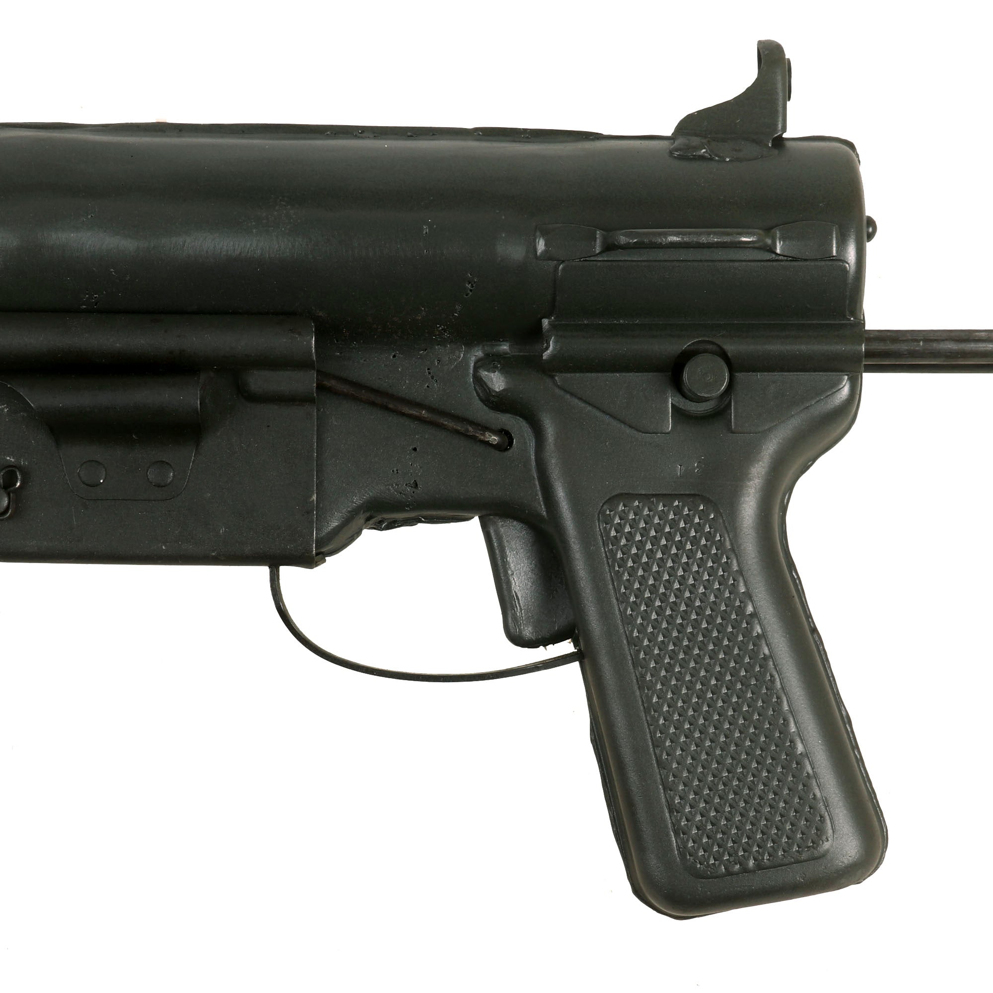 Its steel stamped construction made this the must less costly successor to the Thompson and Rising sub-machine guns of WWII. It has an interesting safety mechanism that when the bolt is back and the ejector port cover is closed, a tab on the cover holds the bolt in the rear position, even when the trigger is actuated. One must open the ejector port cover in order for the bolt to move forward and fire. We haven't had, or even seen, a Grease Gun dummy gun in nearly 20 years, and we expect it could be another 20 years before we get another. Act now or be sorry later!