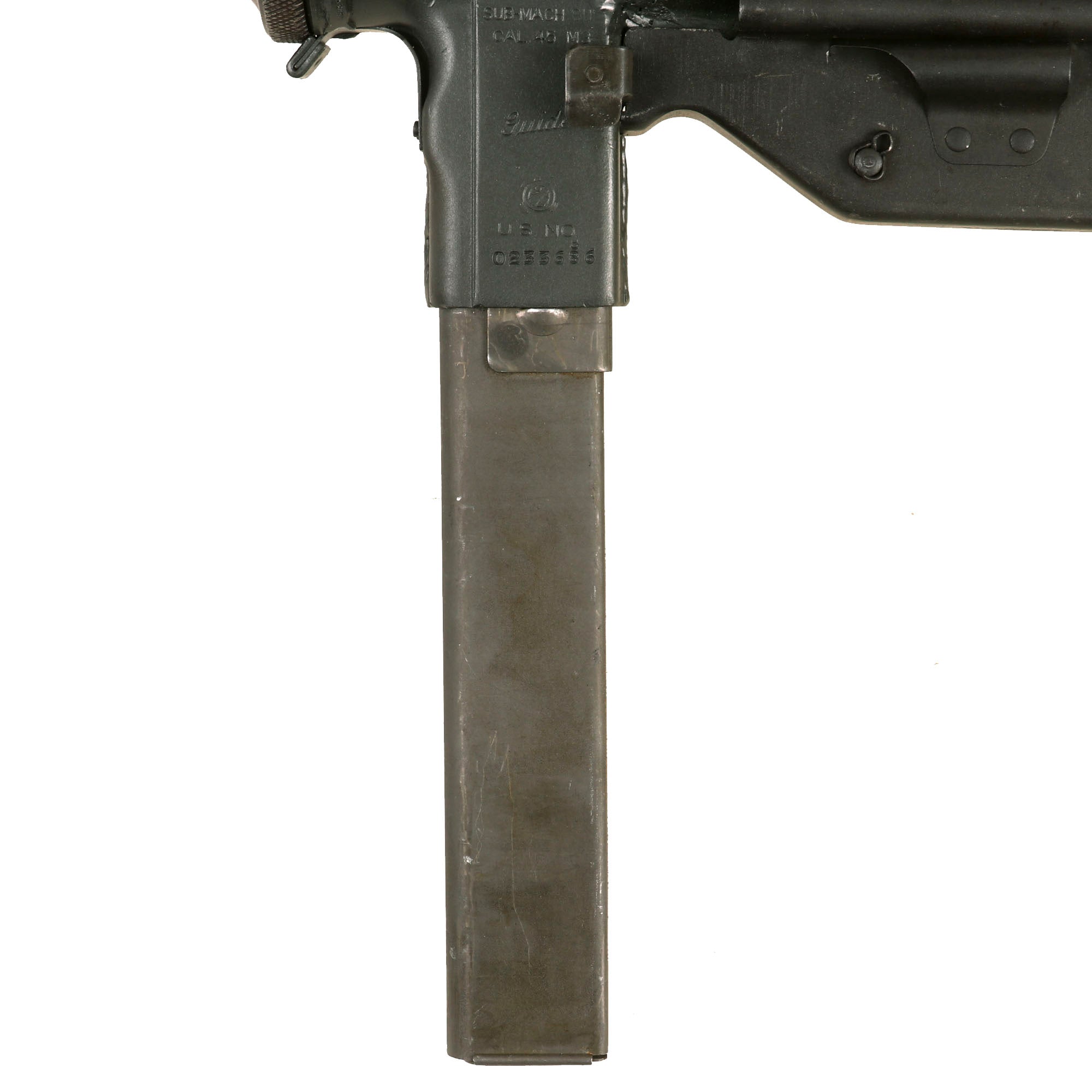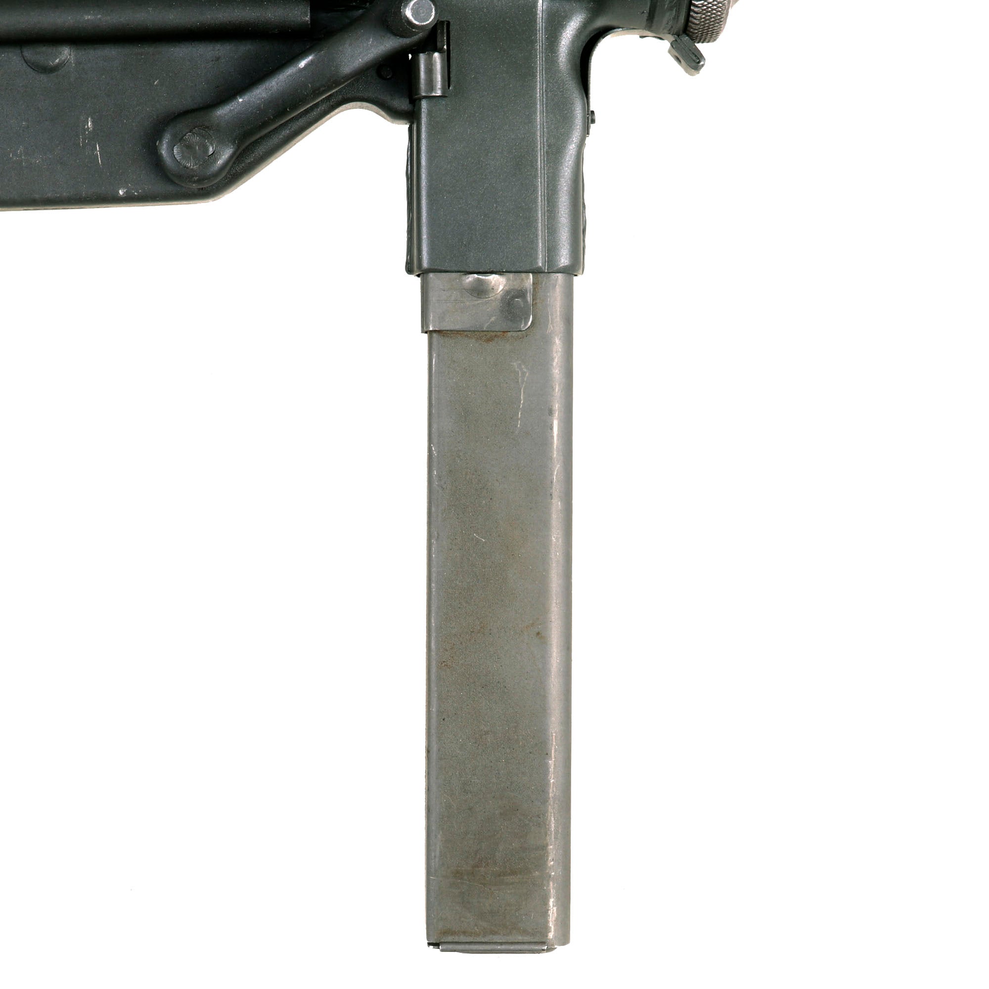 Original Item: Only One Available. This is a magnificent WWII "SUB-MACHINE GUN, CAL 45, M3" display gun, usually referred to as the M3 "Grease Gun" due to the resemblance. It is built from all original USGI issue parts on an original BATF compliant non-firing display receiver, making this a 100% legal display Sub-Machine gun. This receiver was created by using portions of the original torch cut receiver, including the barrel bushing, combined with some new made steel portions. It has properly had a 30% section of the total length completely replaced entirely with solid steel bar stock. Meaning a 1/3 length section of the display receiver is solid steel, making this totally legal to own without a license of any kind within the USA.
