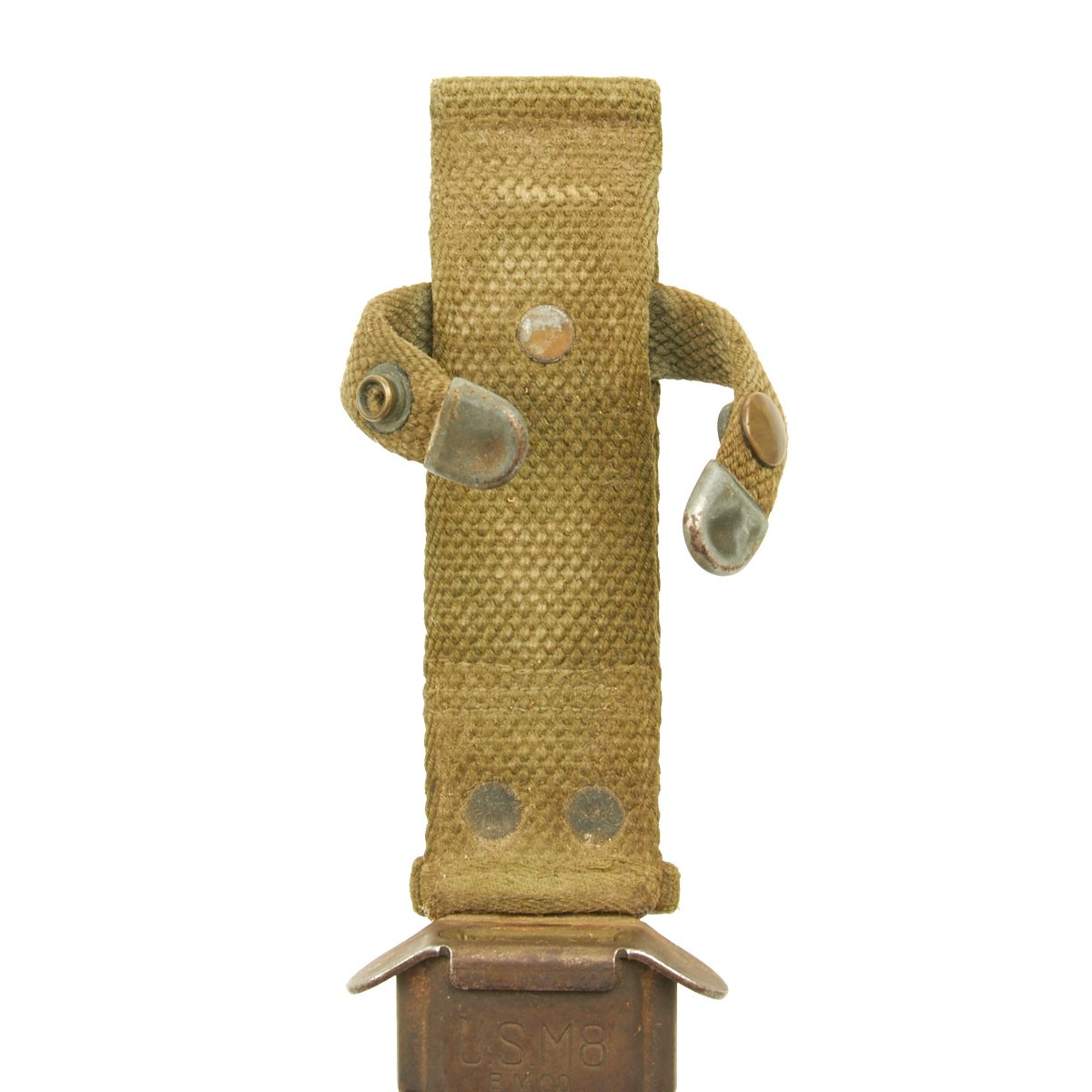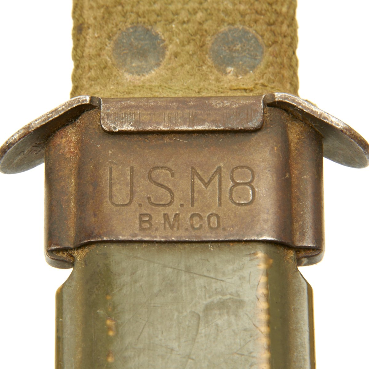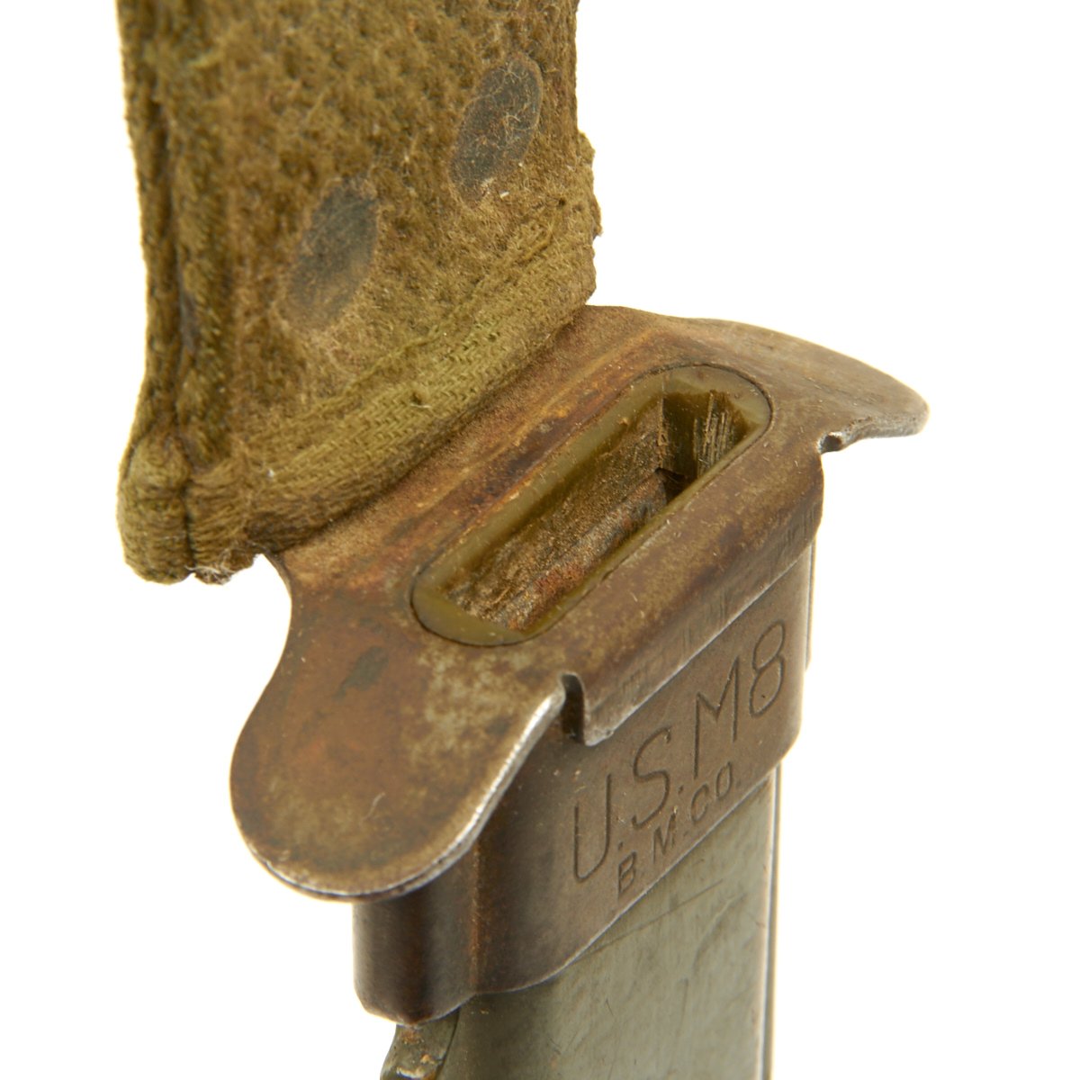 The original scabbard is marked, U.S. M8 B.M. CO and in very good condition with no major defects to note. The canvas is excellent, though there is wear ib the fiberglass scabbard shell, and the metal finish is somewhat oxidized. The scabbard was manufactured by Beckwith Mfg Co. a division of Victory Plastics.