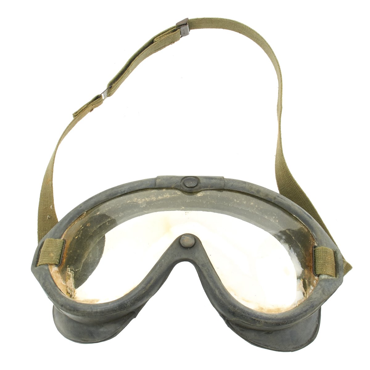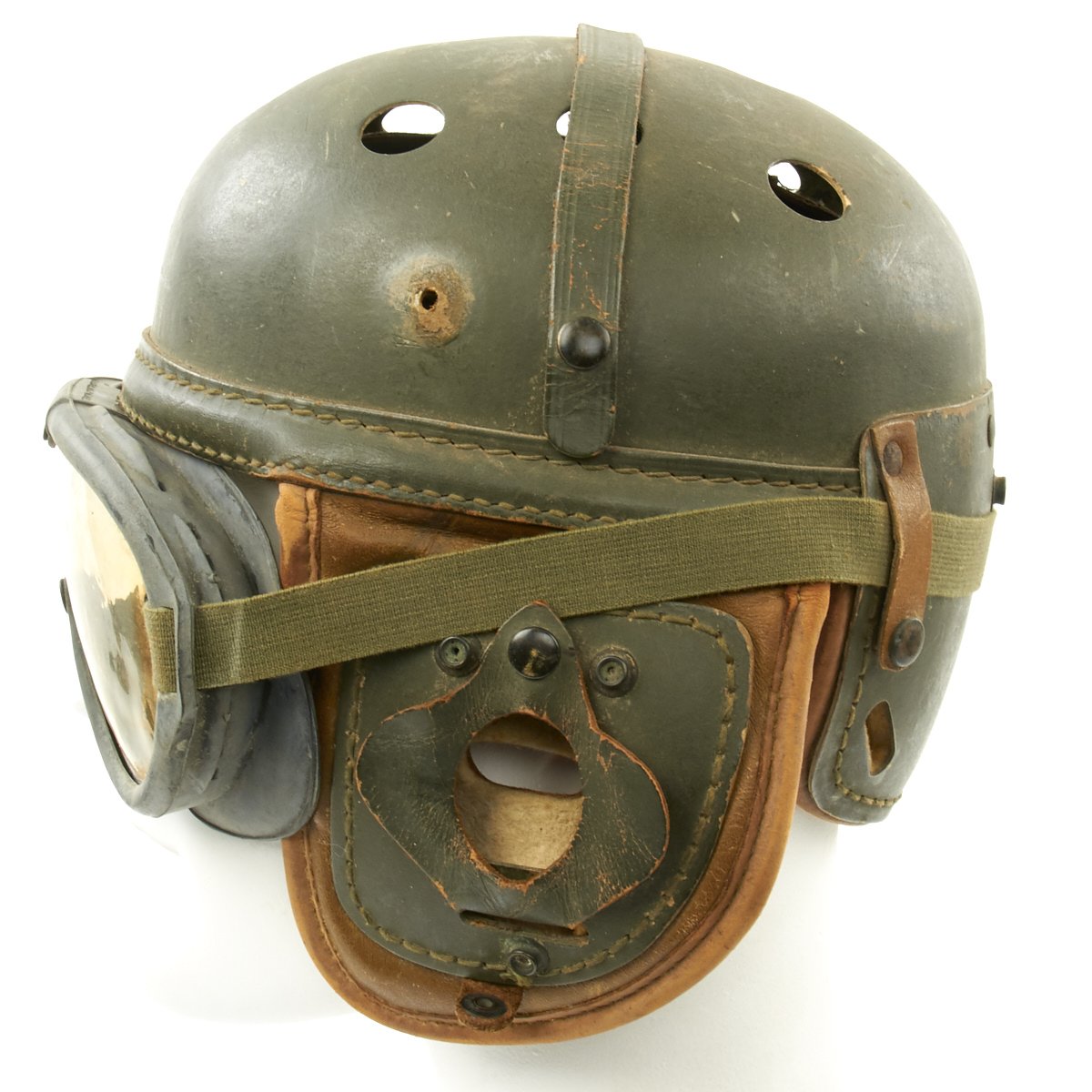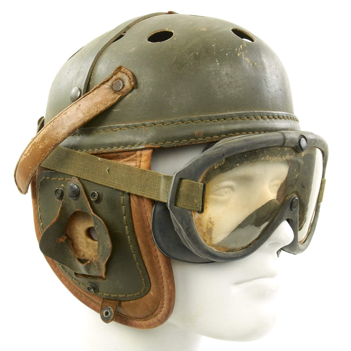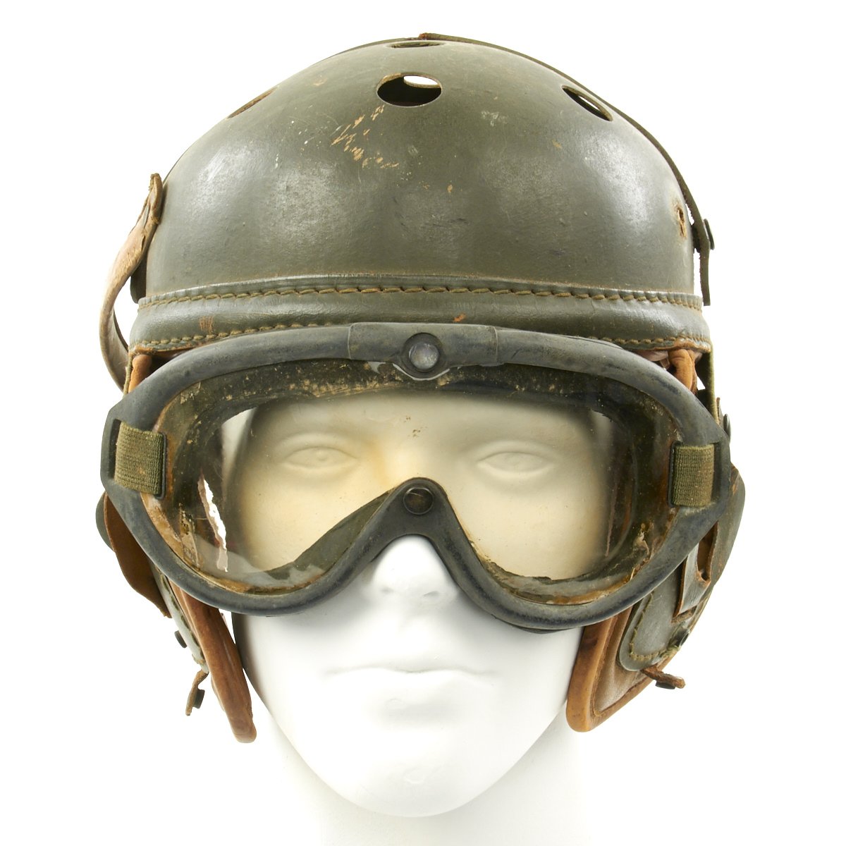 Helmet is nicely marked C.099 in white paint on the reverse. It is nicely used with a rich appeal and is mostly completely. Both the chin strap and the strap that secures the three flaps together are missing, and one of the curved side earphone tensioners is missing. Also included are a pair of classic WWII M1944 Goggles by Polaroid in very nice condition with the exception of some clouding around the edges of the lens.