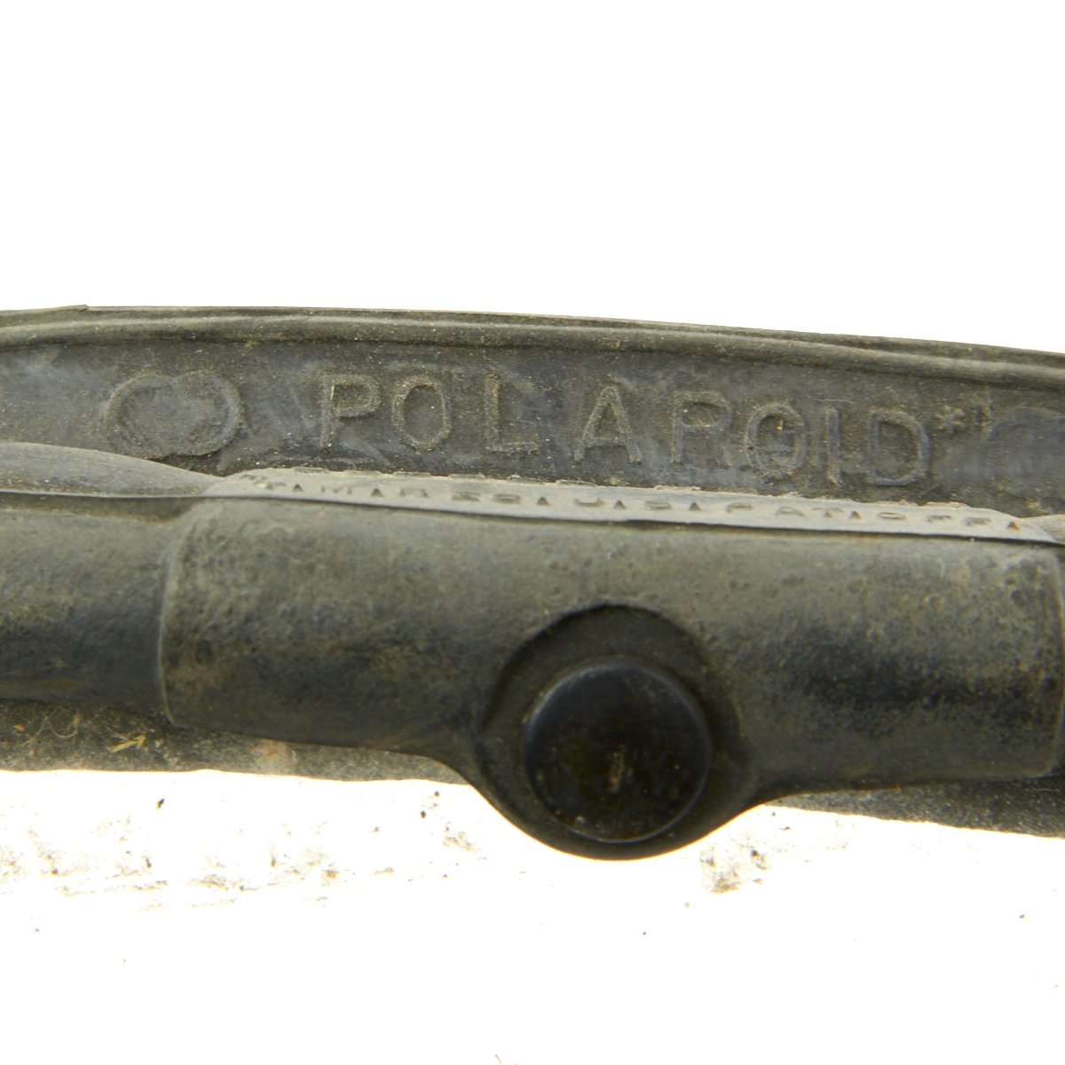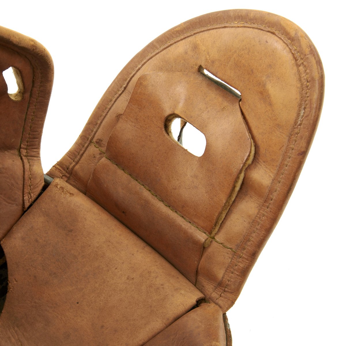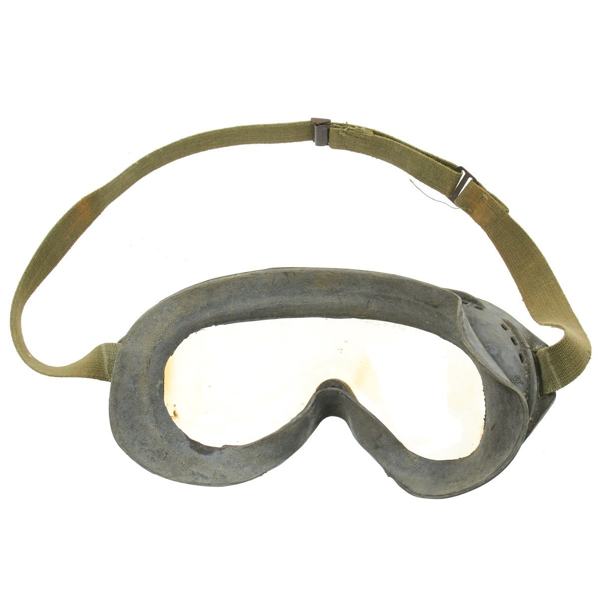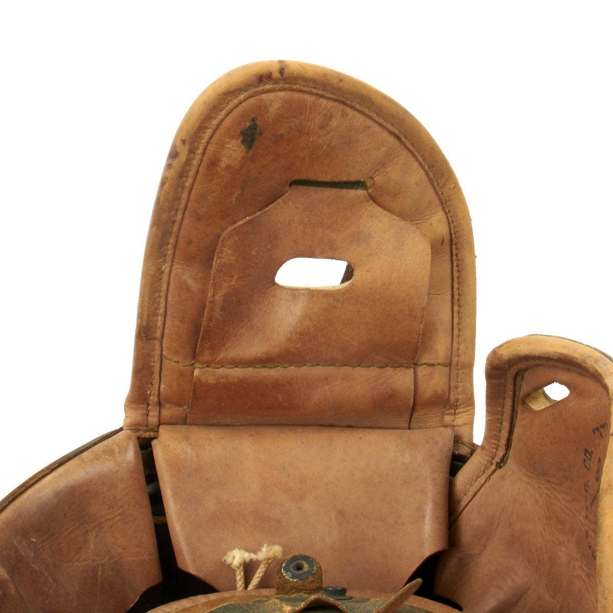 Helmet is nicely marked C.099 in white paint on the reverse. It is nicely used with a rich appeal and is mostly completely. Both the chin strap and the strap that secures the three flaps together are missing, and one of the curved side earphone tensioners is missing. Also included are a pair of classic WWII M1944 Goggles by Polaroid in very nice condition with the exception of some clouding around the edges of the lens.