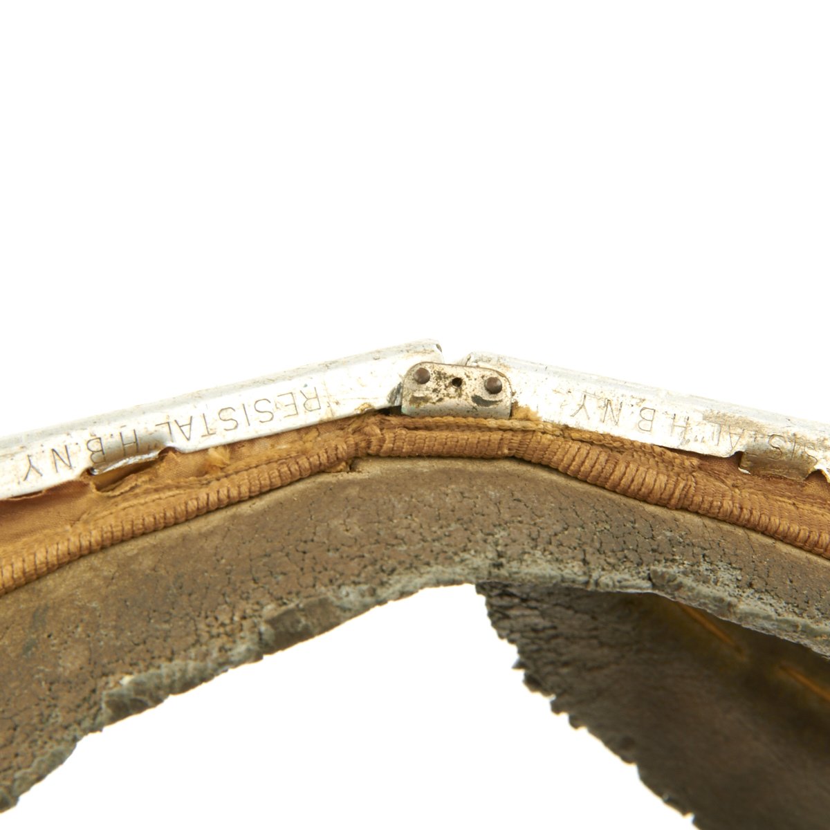 The most distinctive new feature of the M-1938 tanker helmet relative to the previous versions was the leather ear flap assembly. The ear flap extended well below the wearers ear and contained an ingenious flexible housing for retaining the ear phones in their proper position. The ear phones fit into a slot in the leather flap, and a thin leather fastening piece snapped over the ear phone to hold it in place. This leather fastening piece could be adjusted forward or backward via three metal snap fasteners to position the ear phone directly over the user’s ears. A curved leather-covered metal spring arm extended downward from the helmets fiber shell and exerted tension on the ear phone to hold the ear flap assembly snugly against the user’s ear. The spring arm was mounted on a swivel to allow it to be placed in a variety of positions, depending upon the user’s needs and accessory equipment.