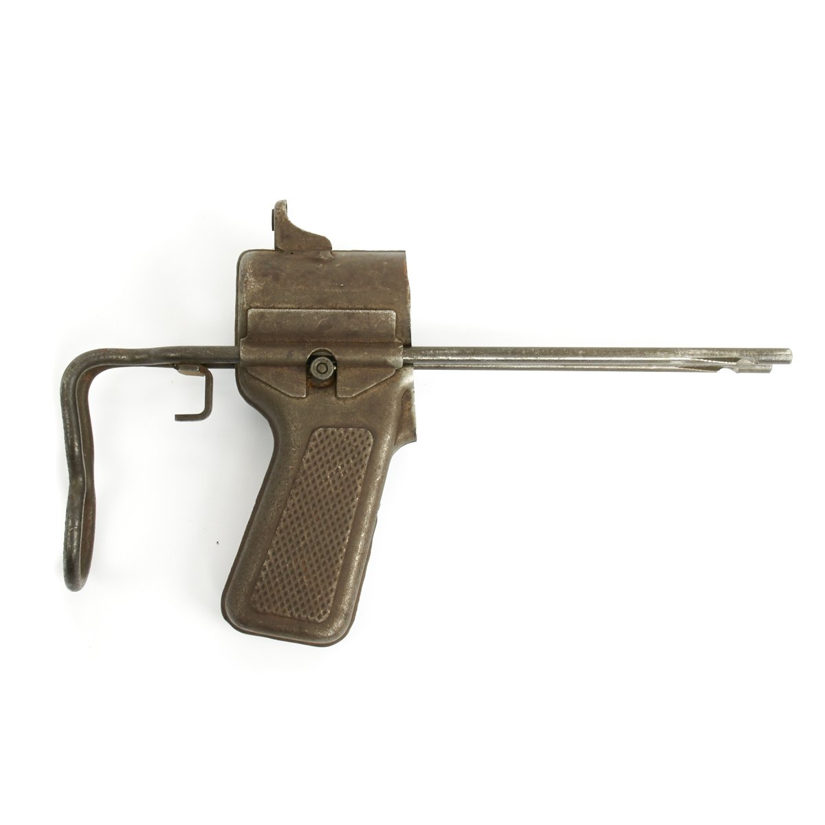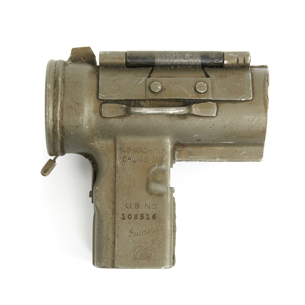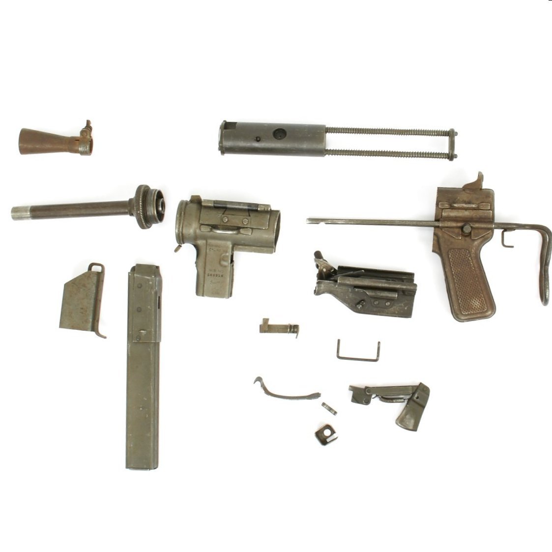 Original Item: Only One Available. This is a fantastic condition M3A1 grease gun parts set by Guide Lamp Company complete with US ordnance markings on left side of magazine and serial number 108516. It is comprised of totally original WWII parts. It is offered complete with the exception of the receiver making it 100% legal for sale, trade and ownership within the USA. Comes complete with flash hider, one 30 round magazine (high capacity restrictions will apply) and magazine loader. A telescoping wire shoulder stock, fixed peep sights, and all steel construction made this the must less costly successor to the Thompson and Rising sub-machine guns of WWII. It has an interesting safety mechanism that when the bolt is back and the ejector port cover is closed, a tab on the cover holds the bolt in the rear position, even when the trigger is actuated. One must open the ejector port cover in order for the bolt to move forward and fire. We haven't had, or even seen, a Grease Gun parts set in nearly 20 years, and we expect it could be another 20 years before we get another. Act now or be sorry later!