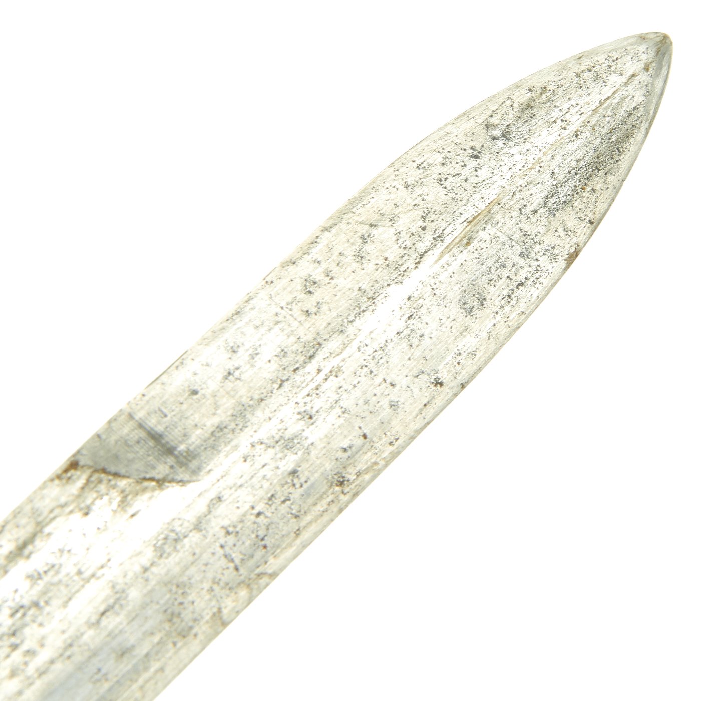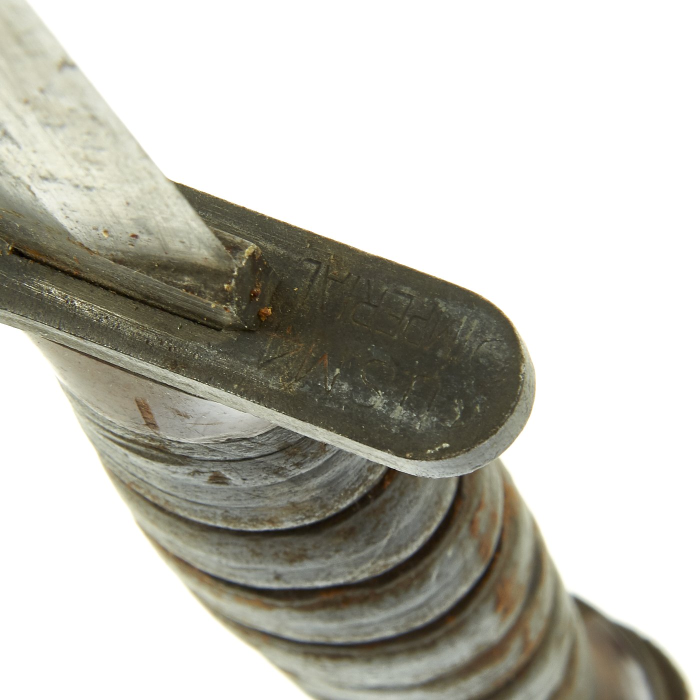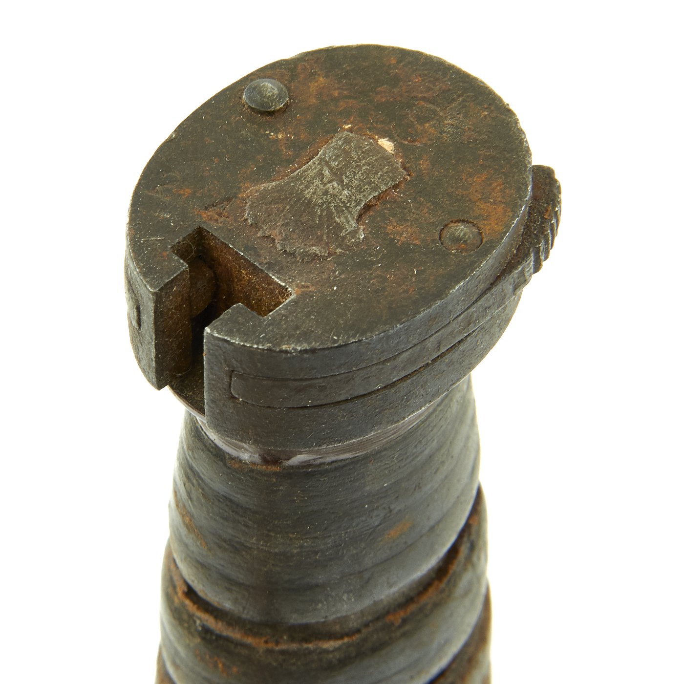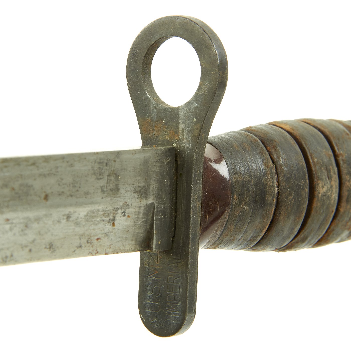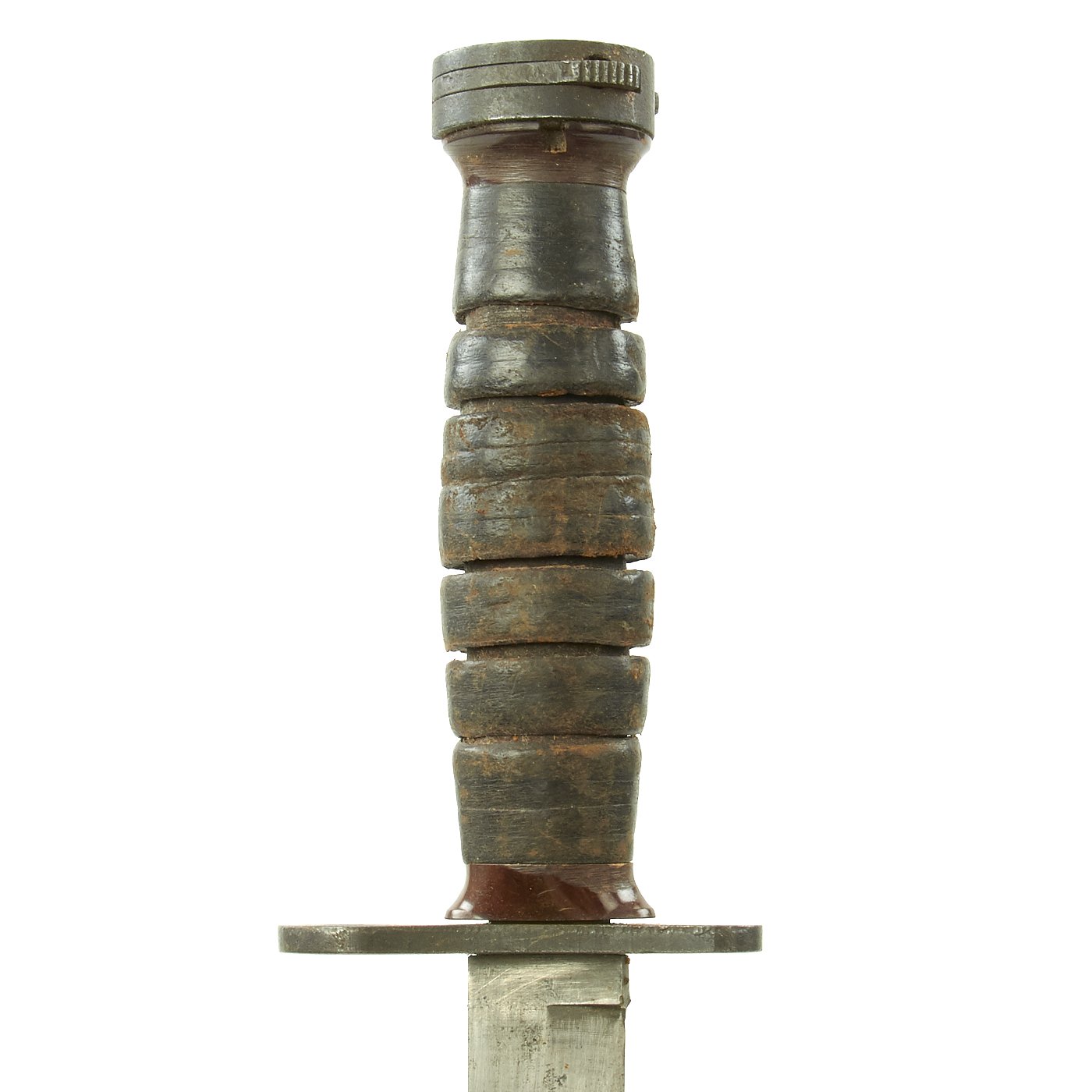The bayonet still has the original WWII issue leather washer grip, with the correct original bakelite inserts at the top and bottom. These have not been changed out, and the leather in the grip shows wear as well as dirt accumulation. The pommel is held on by the correct "starburst" style peened over tang, which with the flaming bomb proves this is definitely a WWII example, and not a later reissue.