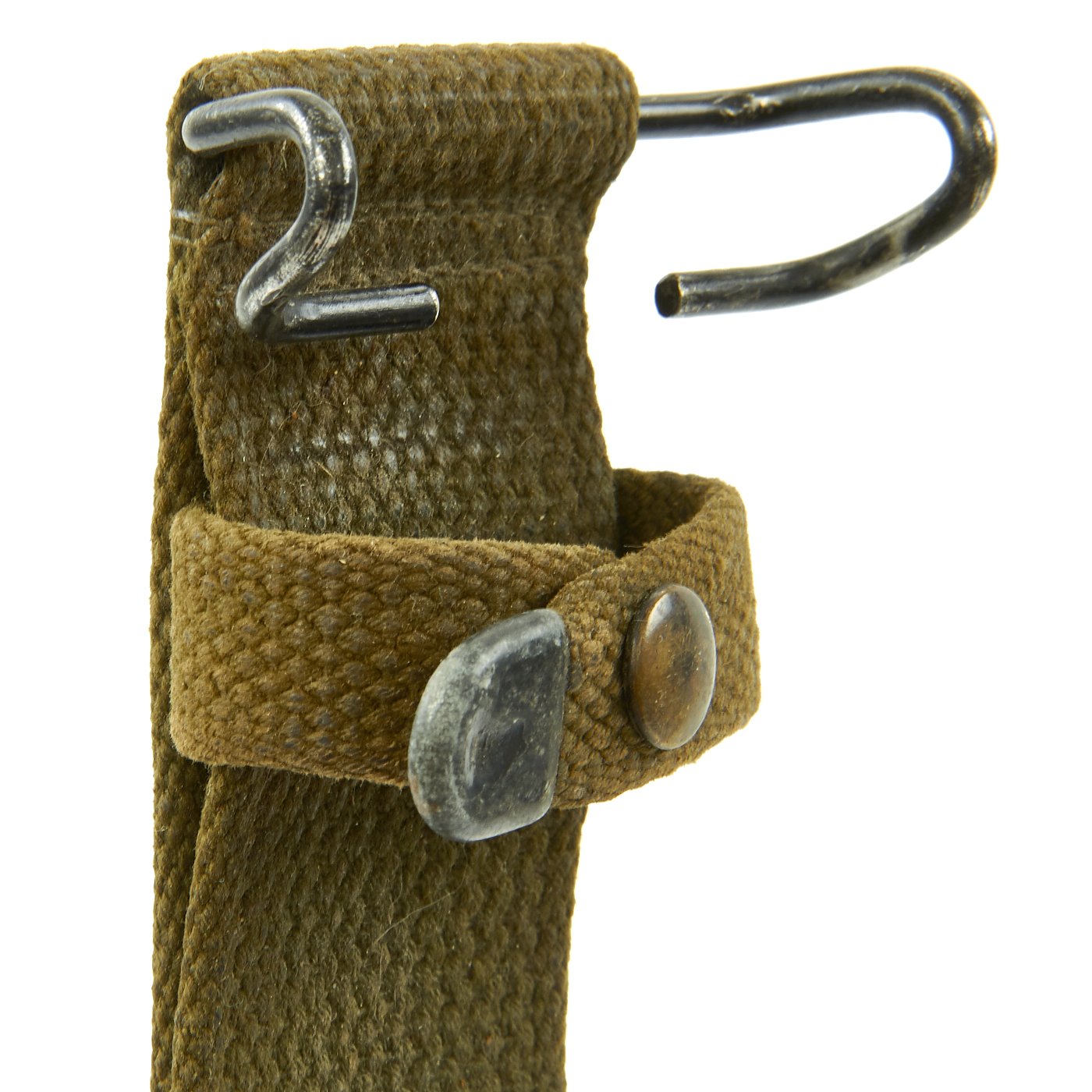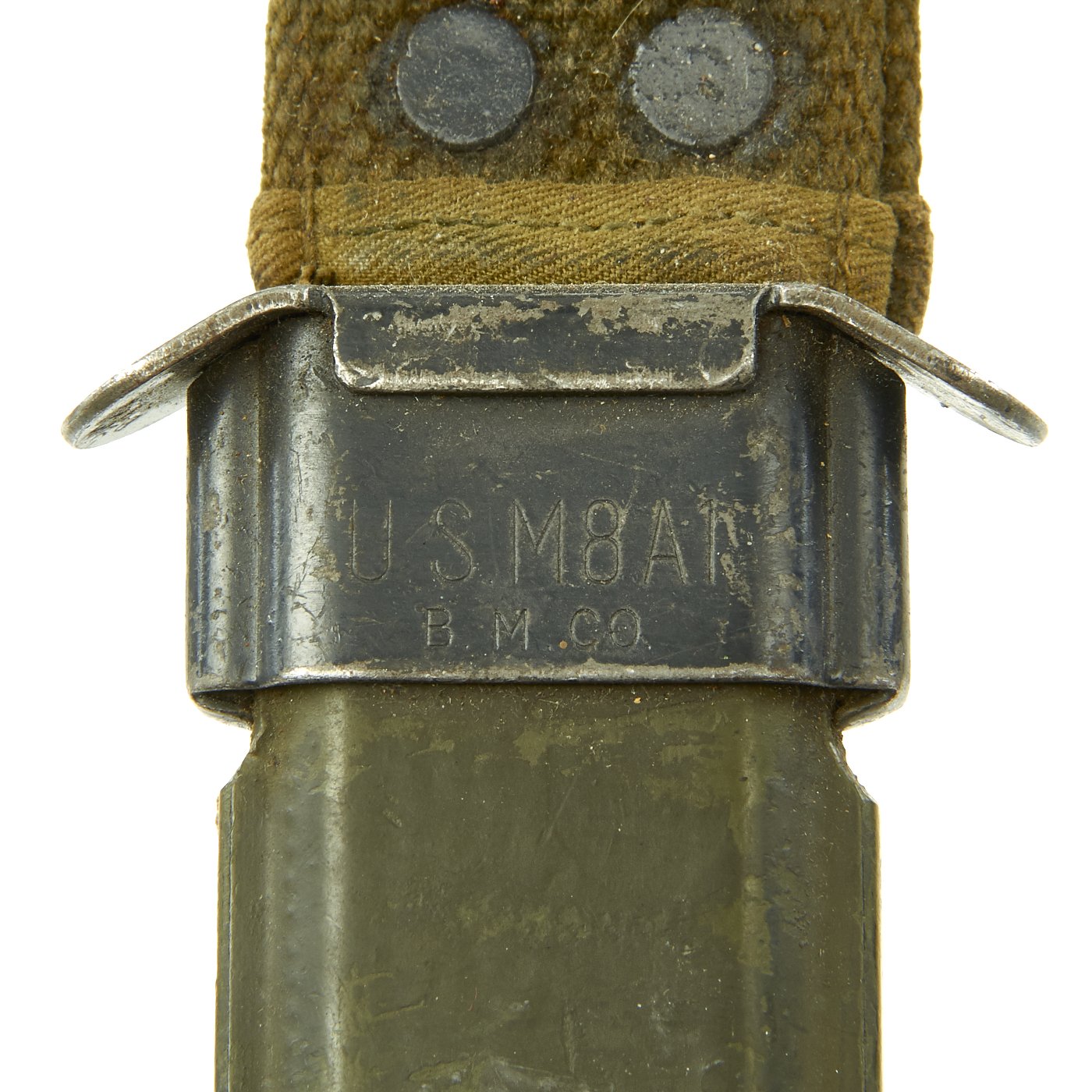 It comes in a nice WWII issue OD green thermoplastic impregnated cotton fabric scabbard marked U.S. M8A1 / B.M. CO., also in offered in very good condition. There is some wear to the scabbard, but it still has almost all of the original green paint. The canvas is in very good condition, and the snap still functions, though the finish is worn. The OD Green #7 color and lack of a bottom reinforcement indicates late WWII manufacture. The scabbard was manufactured by Beckwith Mfg Co., a division of Victory Plastics.