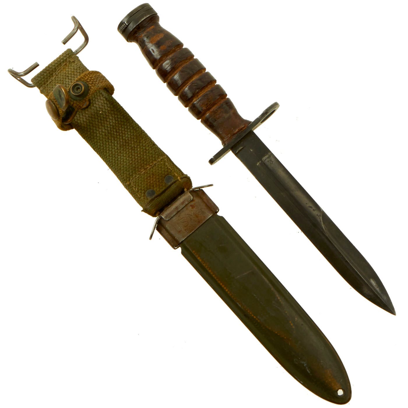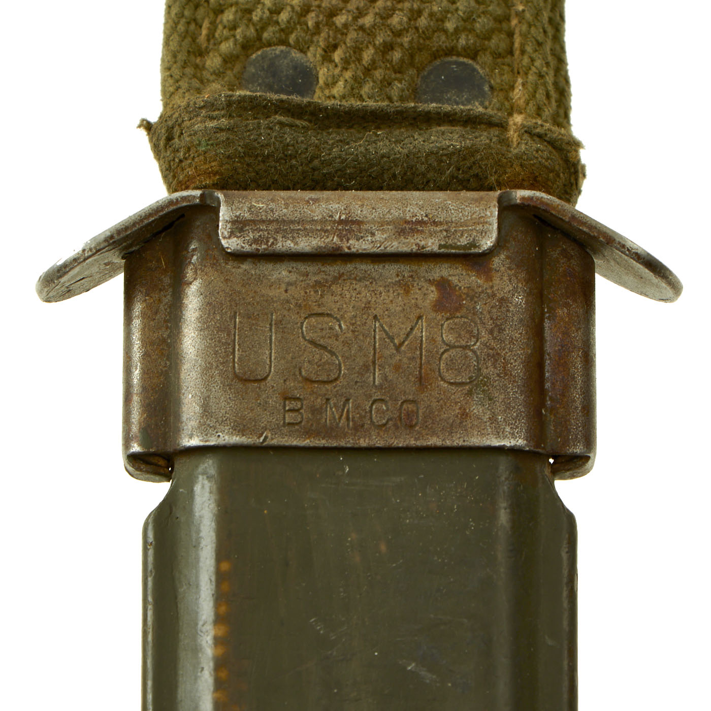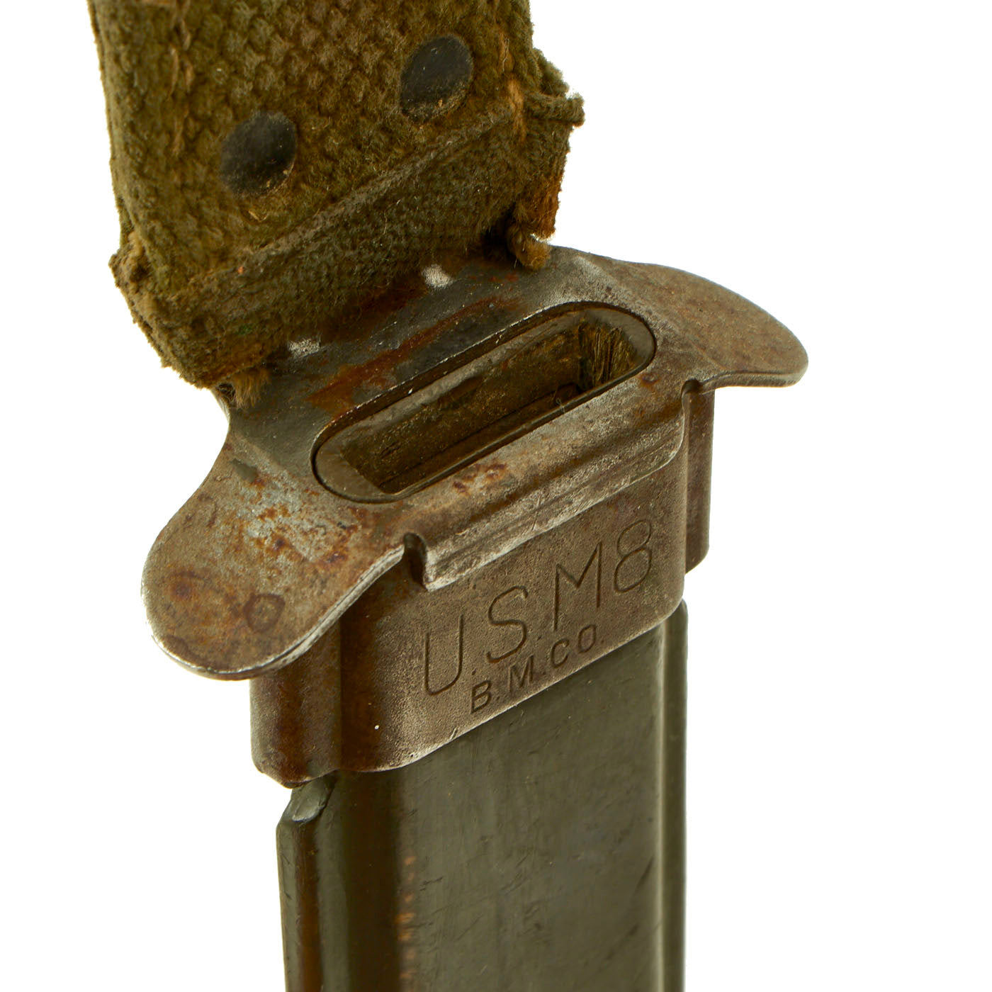The original scabbard is marked, U.S. M8 / B.M. CO and in very good condition with no major defects to note. This is the earlier version of the scabbard, but like virtually all M8 scabbards, had the retaining loop at the top added to upgrade it to M8A1 specs. The canvas is very good, with a bit of wear, and the finish on the snaps on the frog has worn. The thermoplastic impregnated duck canvas body is excellent, with excellent paint, and the throat still has most of the original finish. The scabbard was manufactured by Beckwith Mfg Co. a division of Victory Plastics.