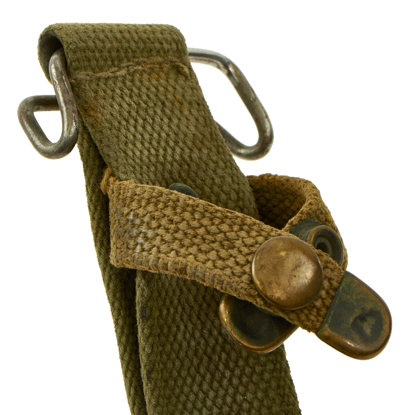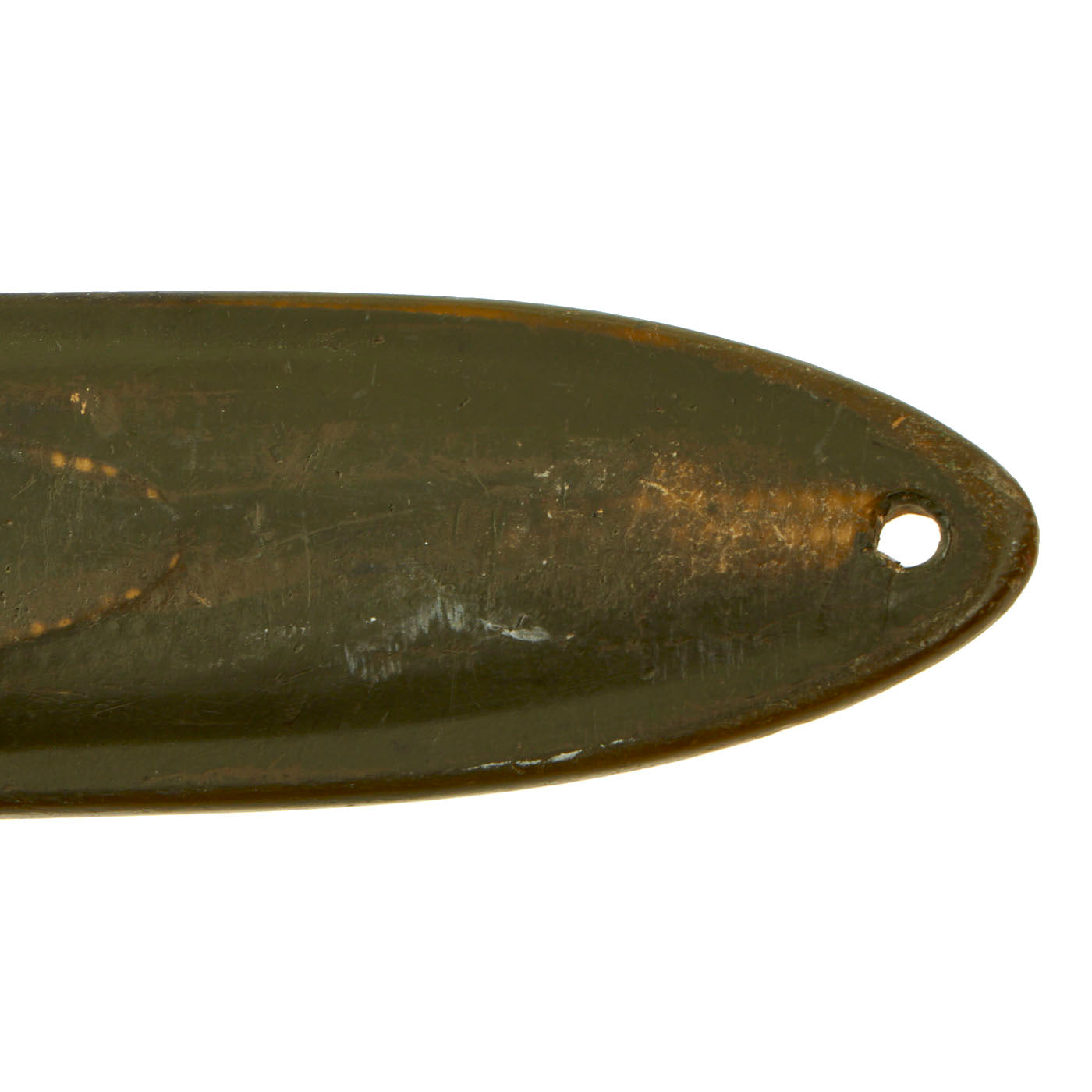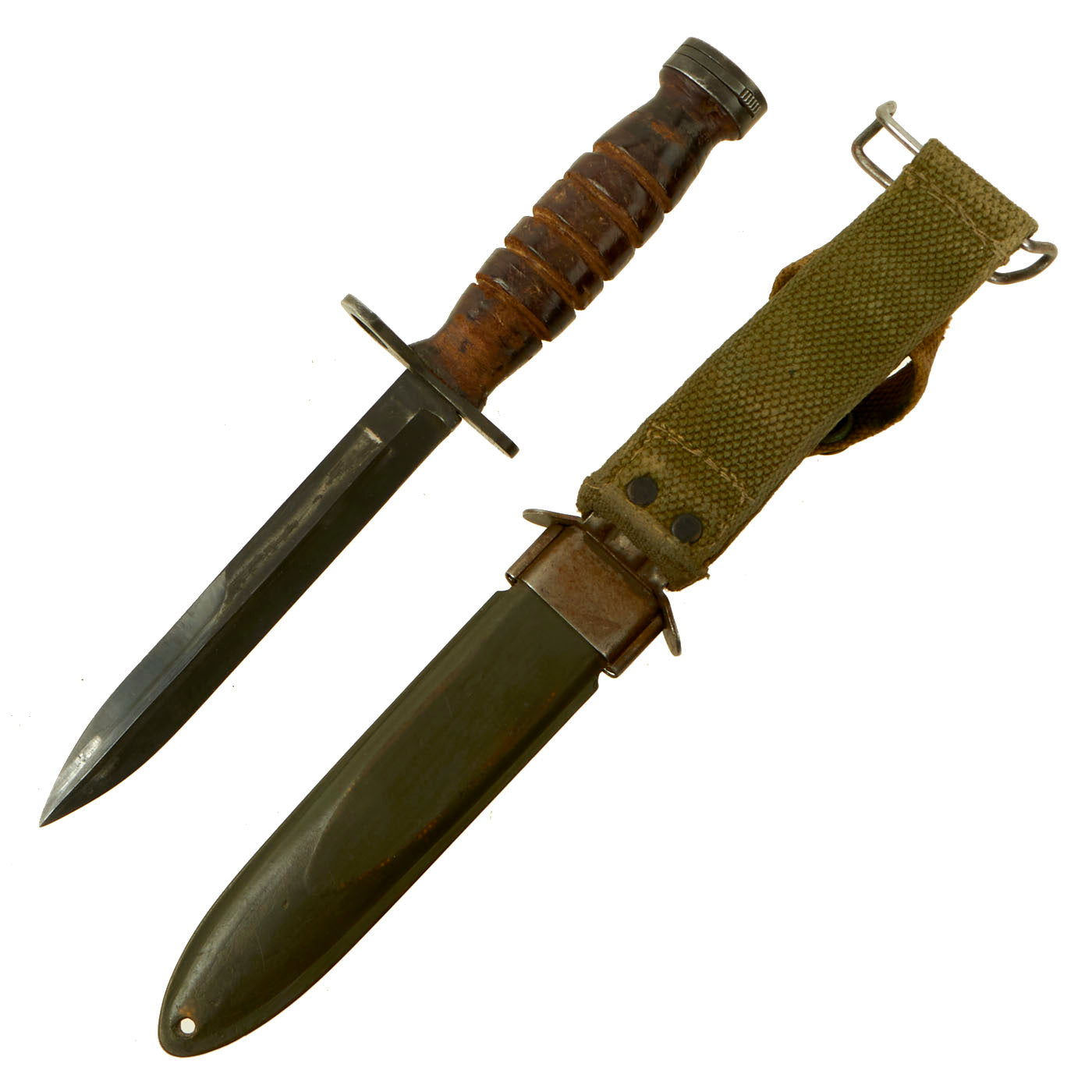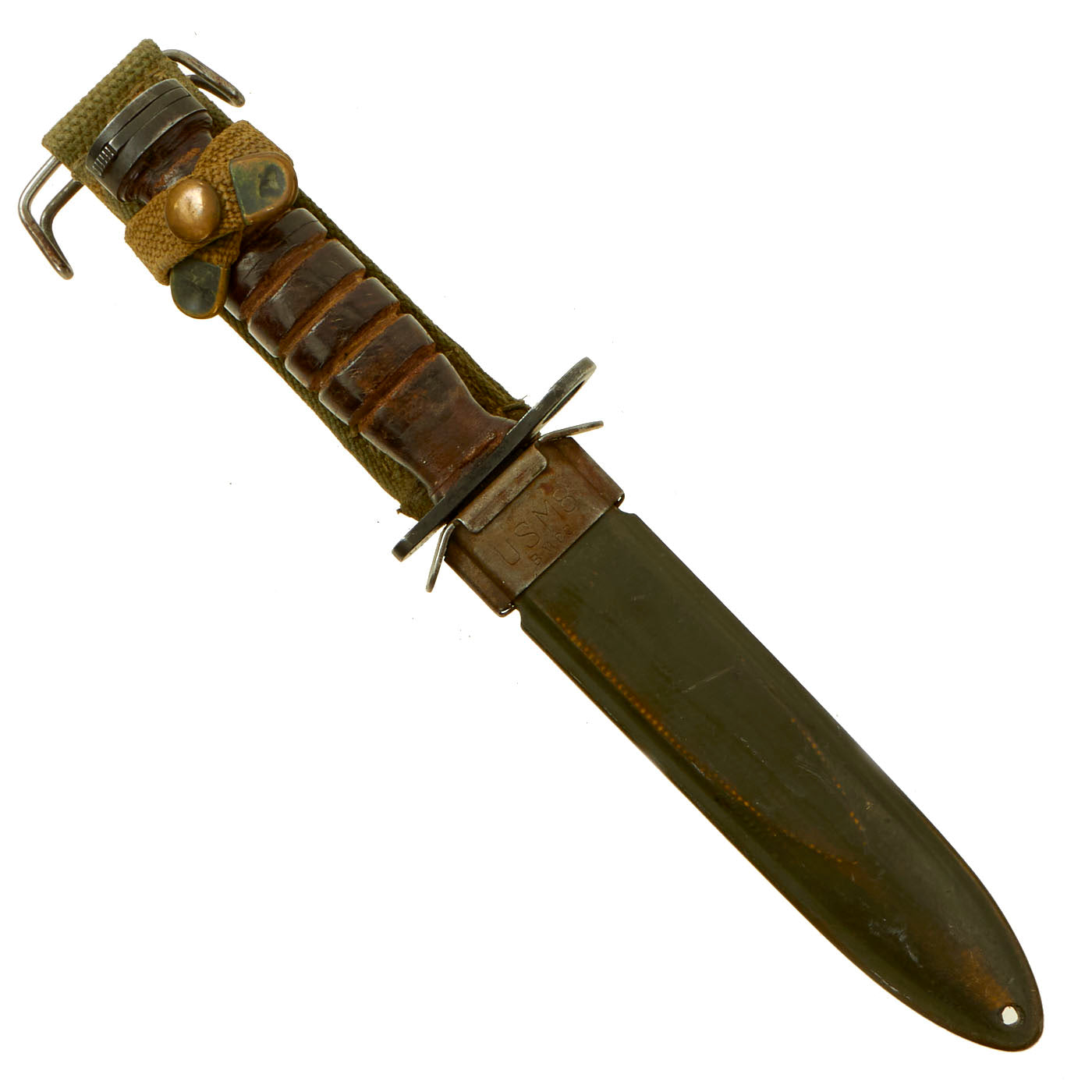 The original scabbard is marked, U.S. M8 / B.M. CO and in very good condition with no major defects to note. This is the earlier version of the scabbard, but like virtually all M8 scabbards, had the retaining loop at the top added to upgrade it to M8A1 specs. The canvas is very good, with a bit of wear, and the finish on the snaps on the frog has worn. The thermoplastic impregnated duck canvas body is excellent, with excellent paint, and the throat still has most of the original finish. The scabbard was manufactured by Beckwith Mfg Co. a division of Victory Plastics.