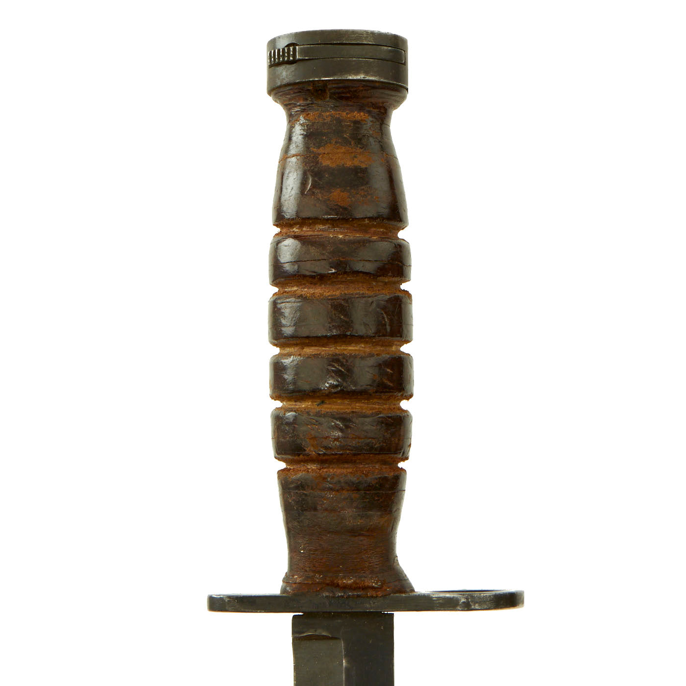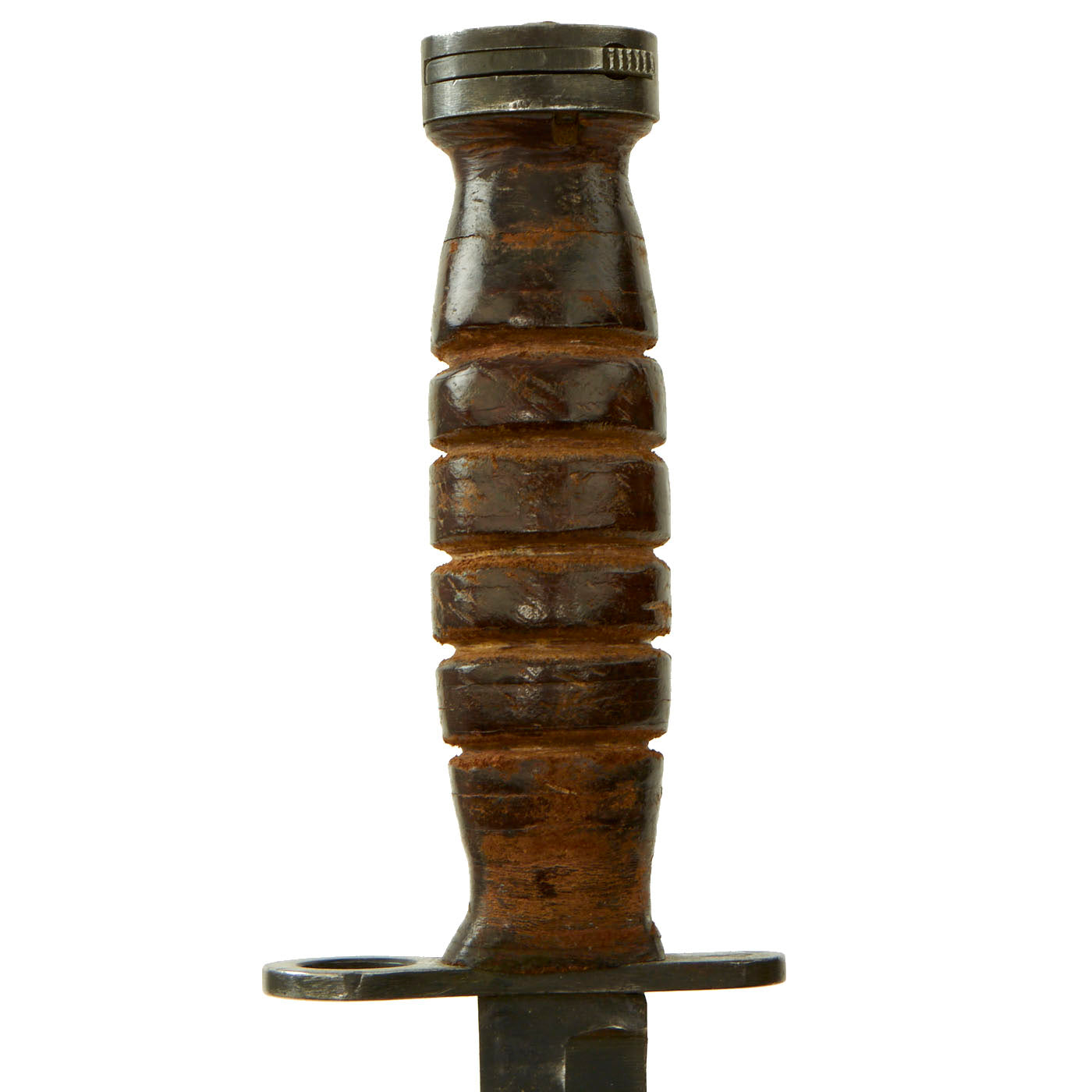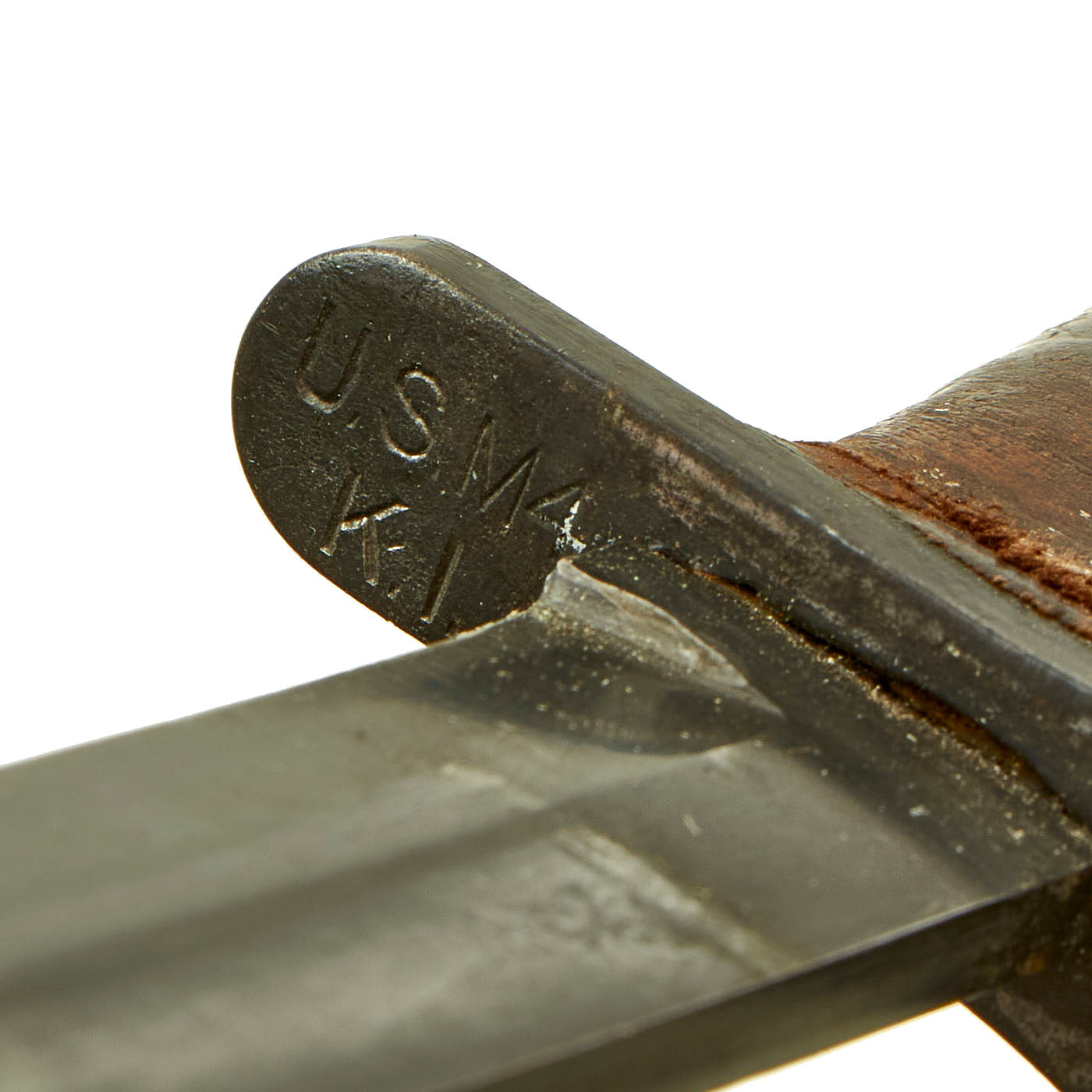 The bayonet still has the original WWII issue leather washer grip. The pommel is held on by the correct peened over tang, which with the flaming bomb proves this is definitely a WWII example, and not a later reissue. The handle does have a possibility of having been replaced during WWII or possibly later due to the starburst pattern no longer being visible and a small gap between the ricasso and crossguard.