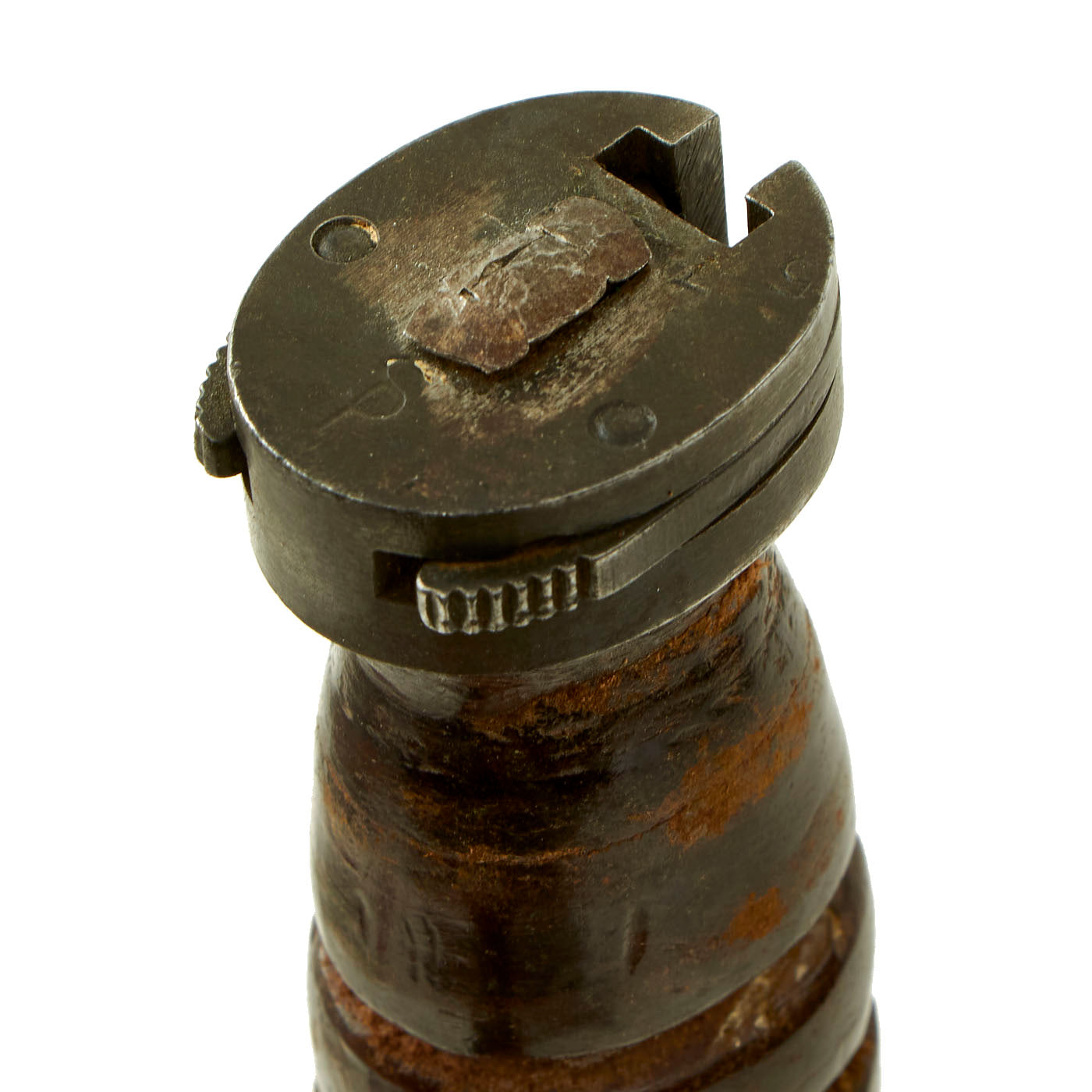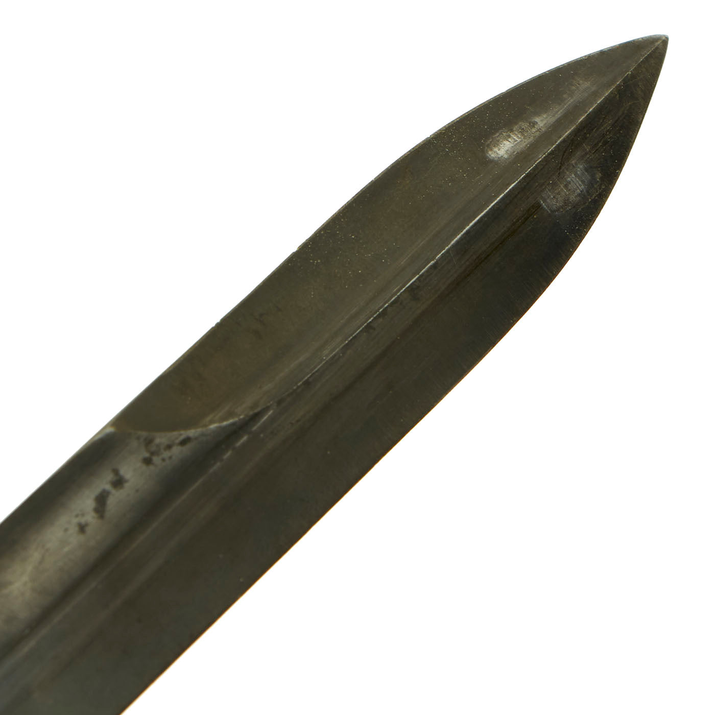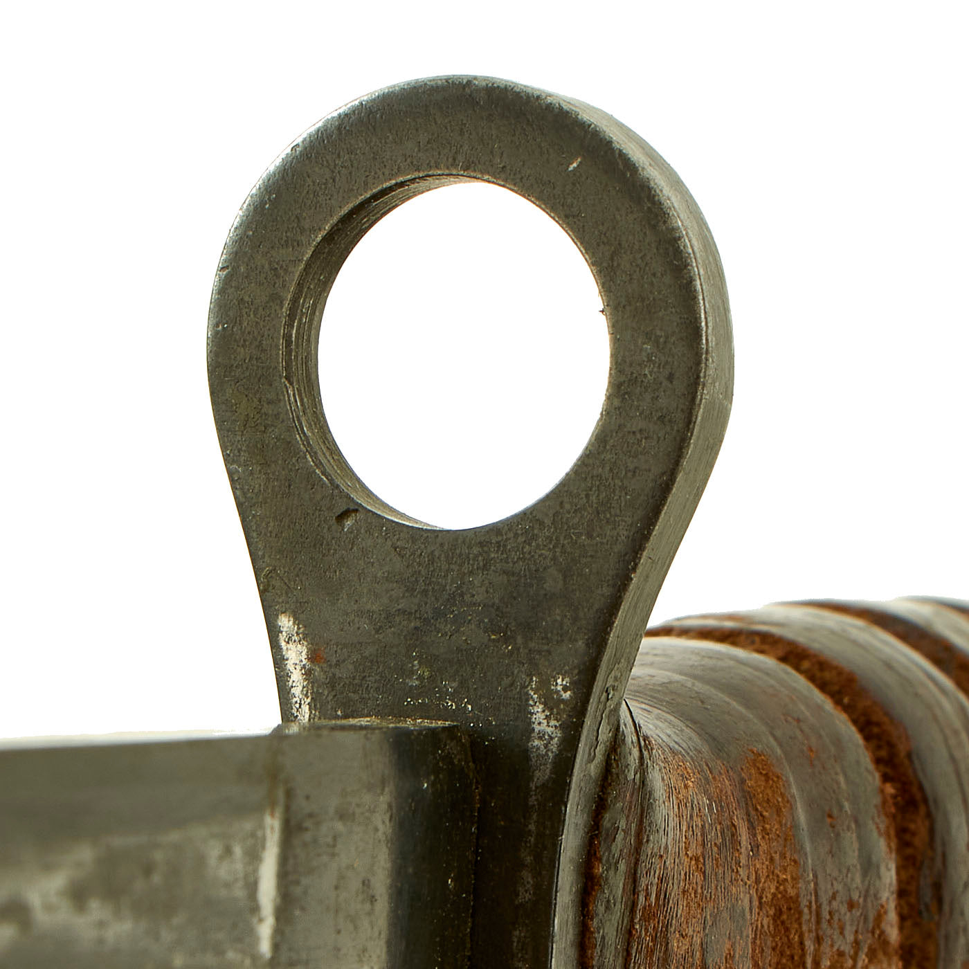 The bayonet still has the original WWII issue leather washer grip. The pommel is held on by the correct peened over tang, which with the flaming bomb proves this is definitely a WWII example, and not a later reissue. The handle does have a possibility of having been replaced during WWII or possibly later due to the starburst pattern no longer being visible and a small gap between the ricasso and crossguard.
