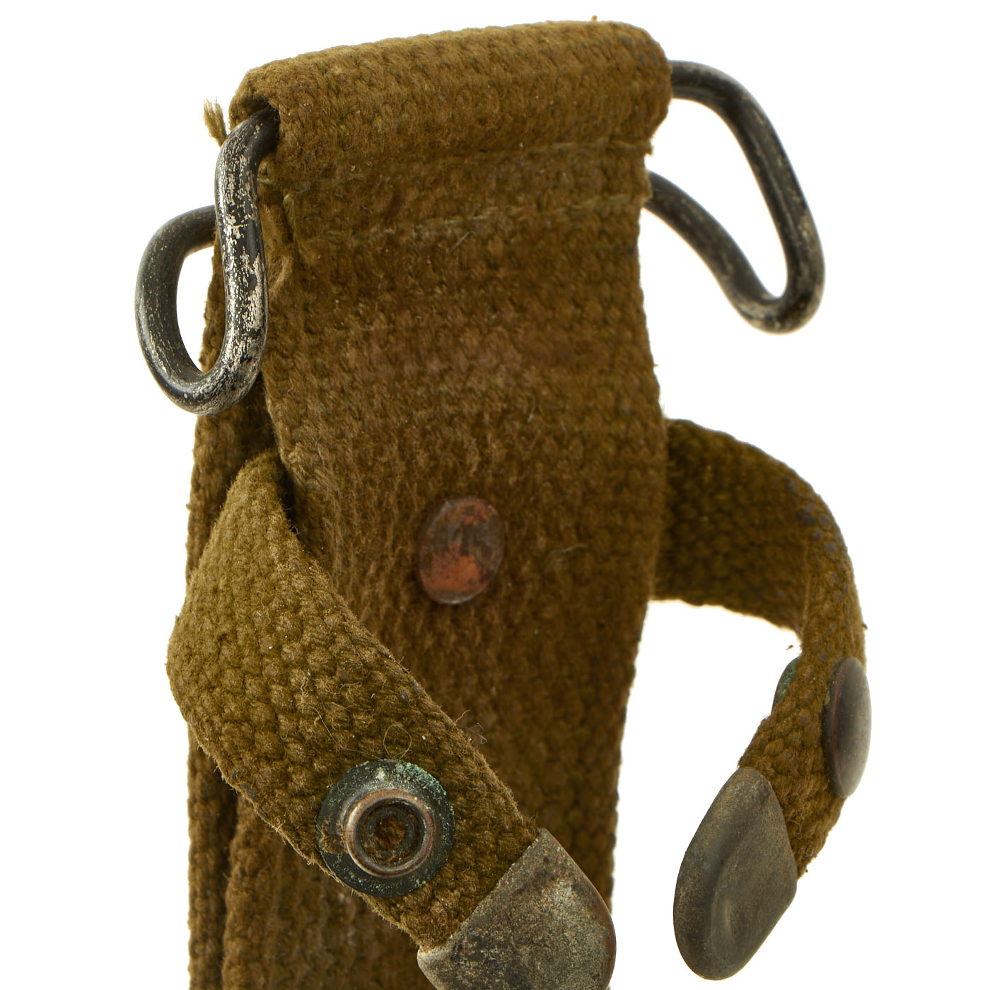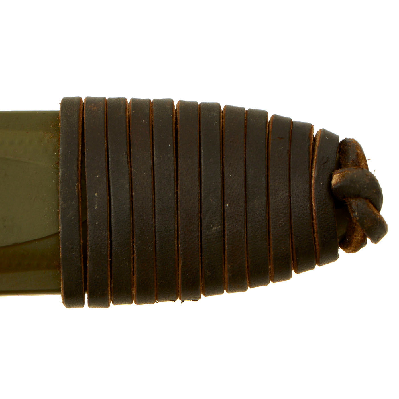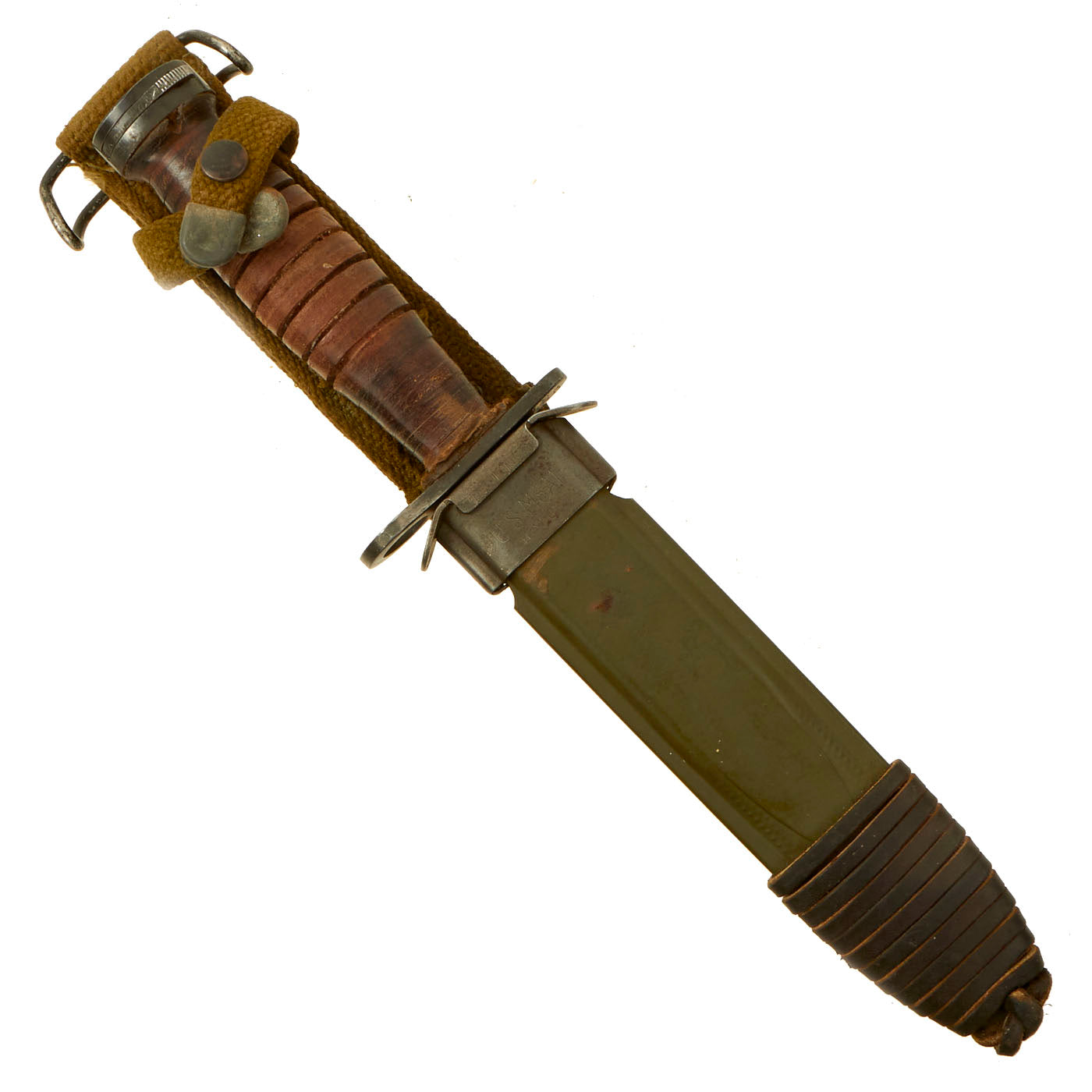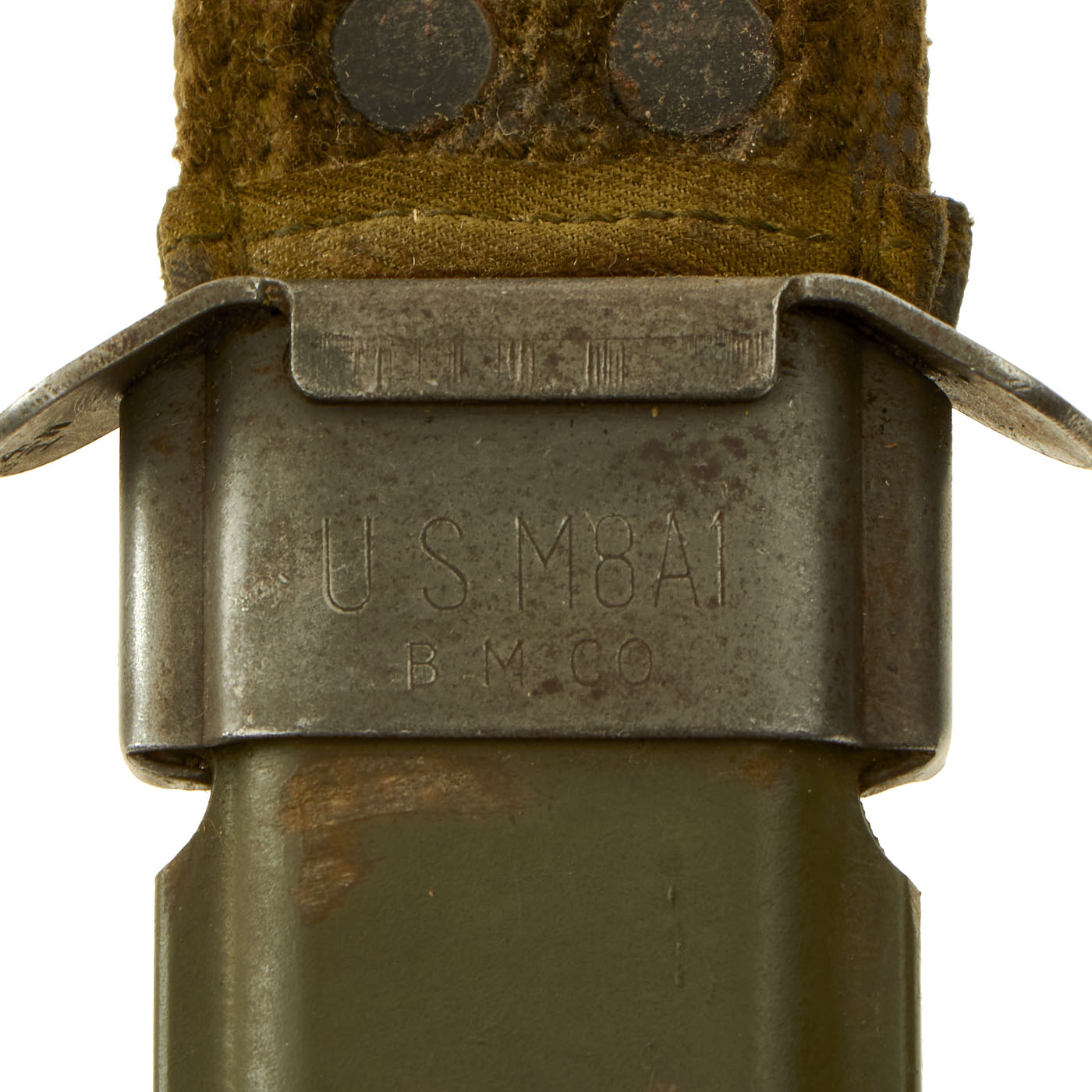 This lovely knife comes with an OD green scabbard marked U.S. M8A1 / B.M. Co, also in offered in very good condition. This design features a thermoplastic impregnated duck canvas body, metal throat, and canvas frog and securing strap with a steel pistol belt hook. There is some wear to the scabbard, but it still has almost all of the original green paint. The throat shows only slight wear to the finish, as shown. The canvas is in very good condition, and the snap still functions, with light finish wear. The scabbard was manufactured by Beckwith Mfg Co., a division of Victory Plastics, who manufactured many scabbards during the war.