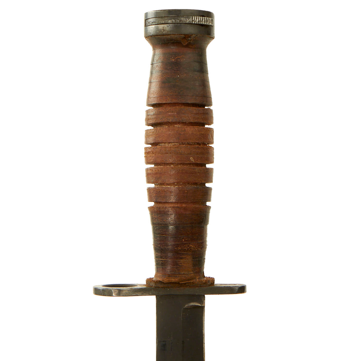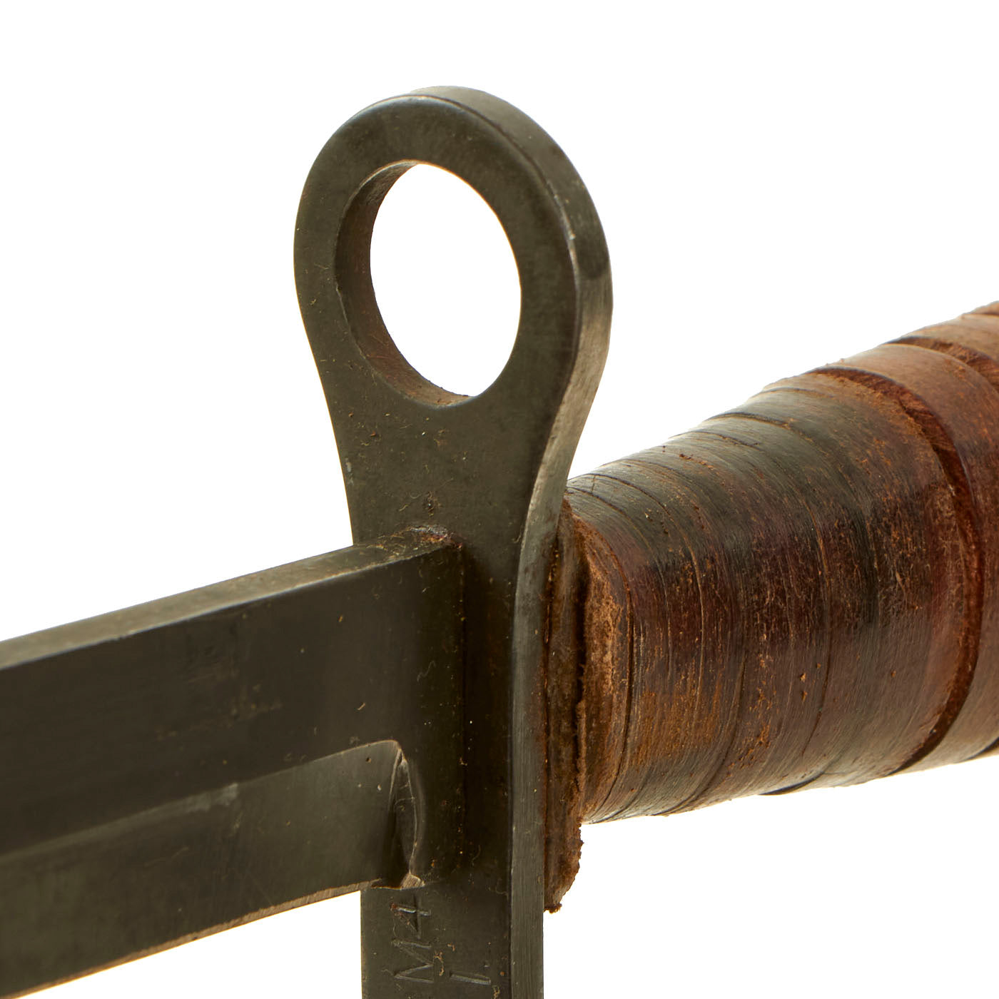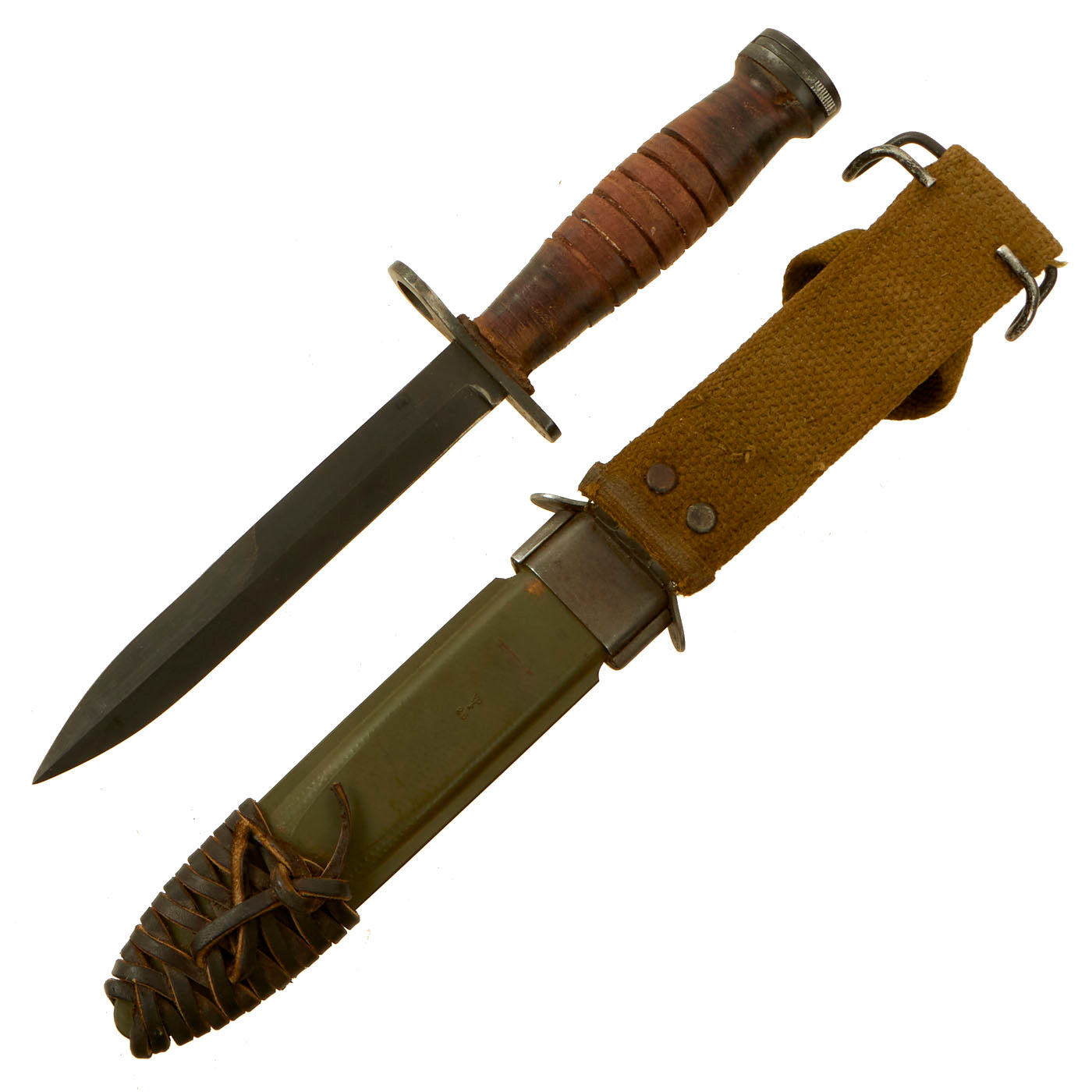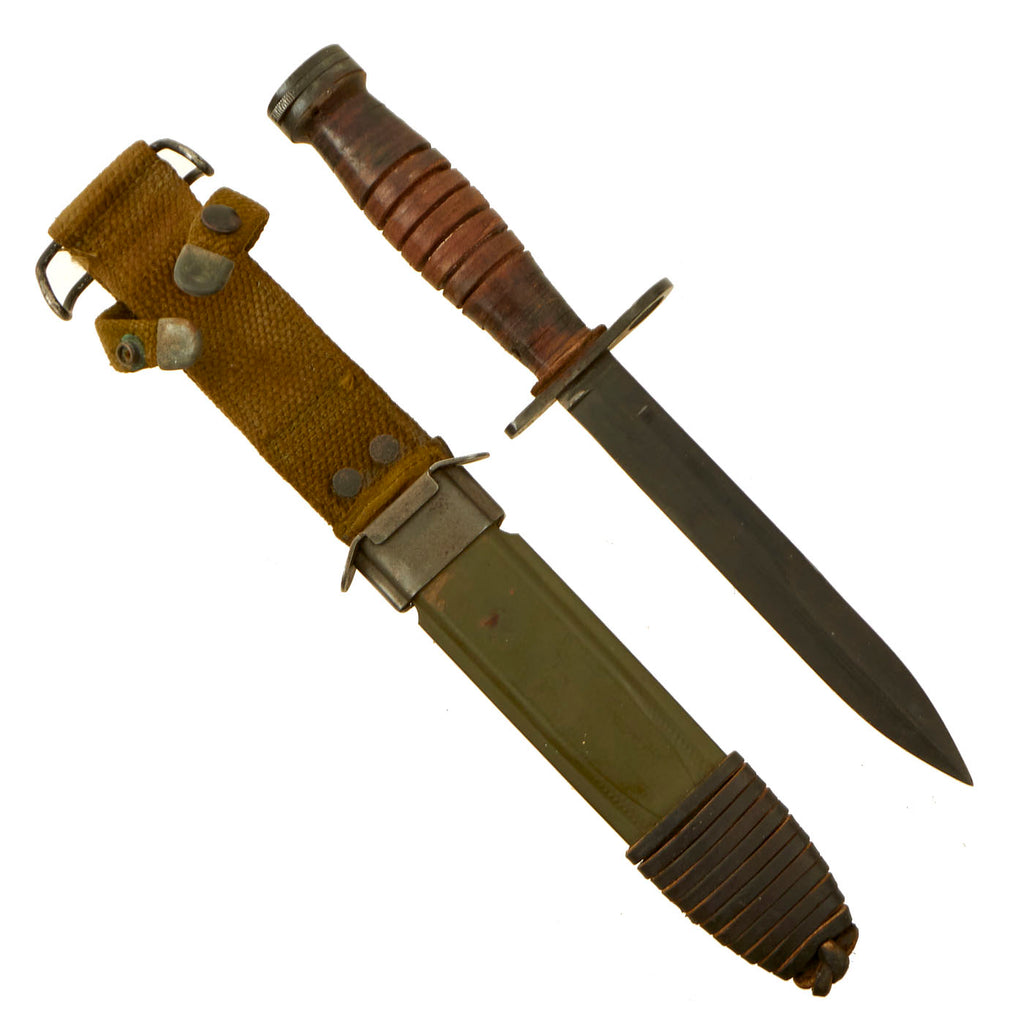 Original Item: Only One Available. This is a very good condition genuine WWII U.S. Army M4 Carbine bayonet fighting knife, with an original M8A1 scabbard. Nicely marked U.S. M4 / K.I. on the blade side of hand guard for Kinfolks, underneath on the blade side is the U.S. Ordnance "Flaming Bomb". This is an original WWII example and not a “Korean Industries” bayonet. When Kinfolks produced these bayonets during the war, the “Flaming Bomb” was located on the underside of the crossguard, the Korean made ones are usually located on the top of the guard next to the K.I. stamp. The guard is the narrow version and not the post war wide version. The blade is in excellent condition, showing barely any use, and no sharpening after arsenal. The crossguard, handle, and pommel are all tight to the blade.