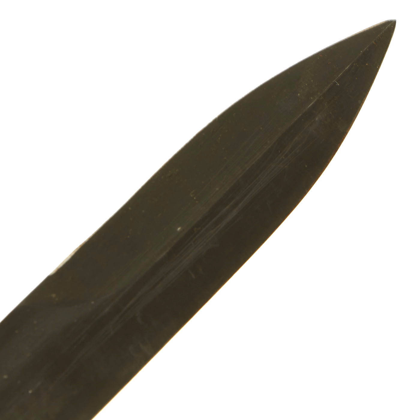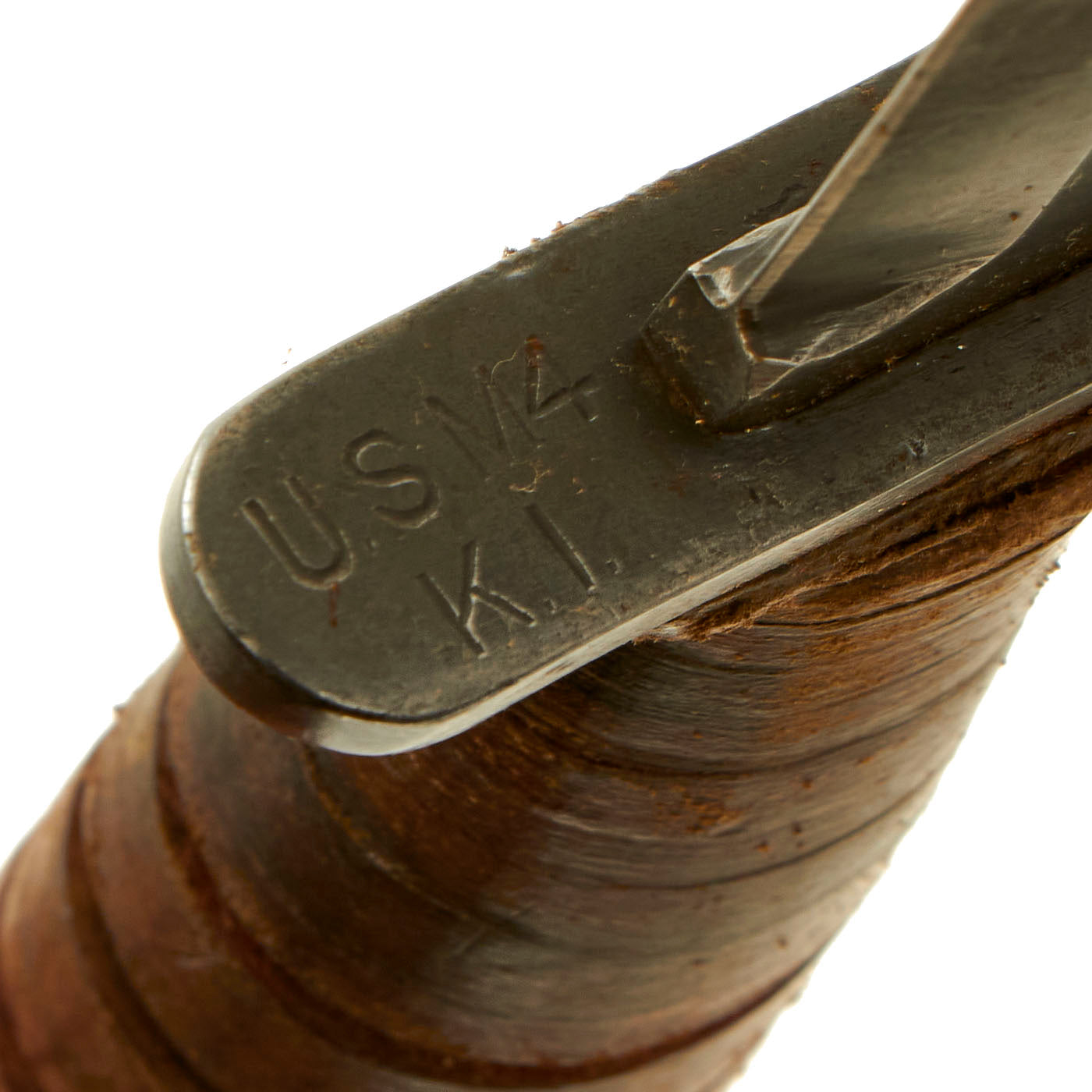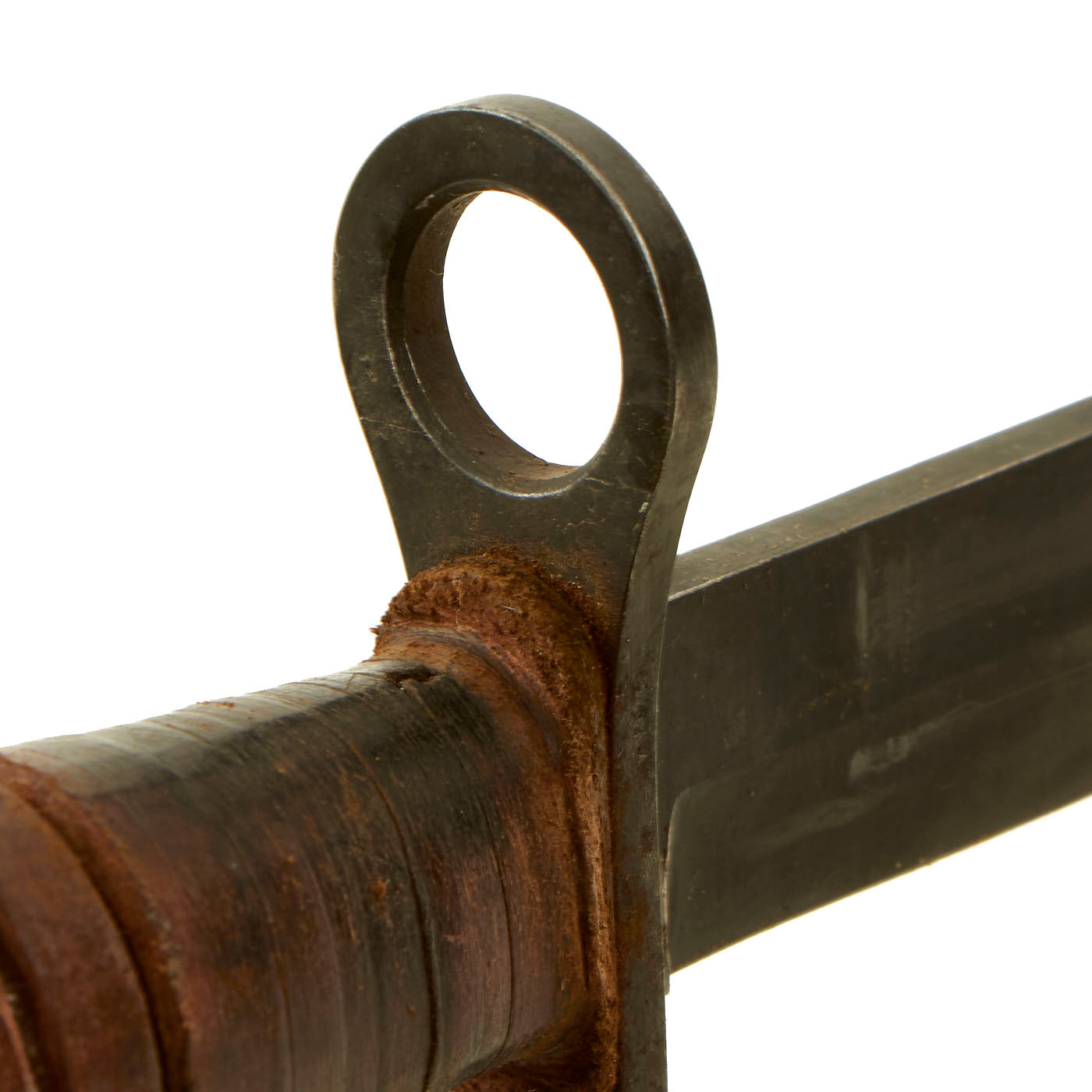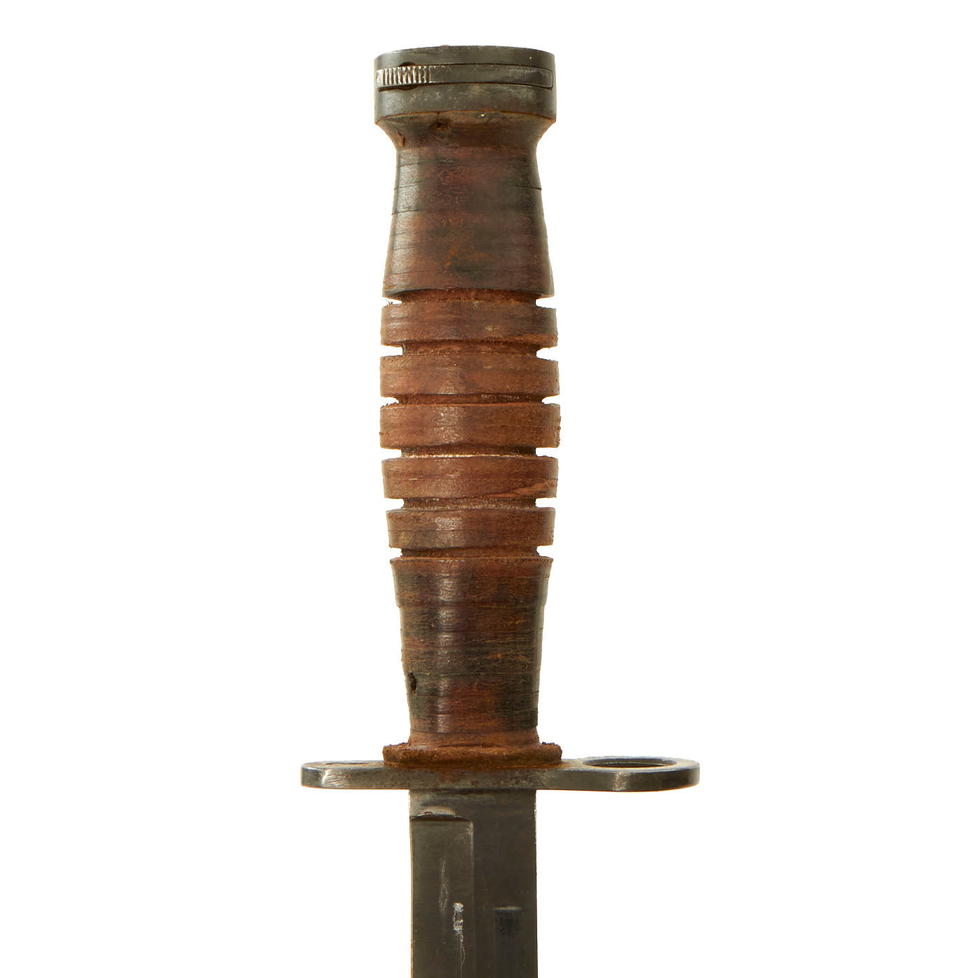 Original Item: Only One Available. This is a very good condition genuine WWII U.S. Army M4 Carbine bayonet fighting knife, with an original M8A1 scabbard. Nicely marked U.S. M4 / K.I. on the blade side of hand guard for Kinfolks, underneath on the blade side is the U.S. Ordnance "Flaming Bomb". This is an original WWII example and not a “Korean Industries” bayonet. When Kinfolks produced these bayonets during the war, the “Flaming Bomb” was located on the underside of the crossguard, the Korean made ones are usually located on the top of the guard next to the K.I. stamp. The guard is the narrow version and not the post war wide version. The blade is in excellent condition, showing barely any use, and no sharpening after arsenal. The crossguard, handle, and pommel are all tight to the blade.