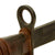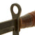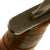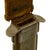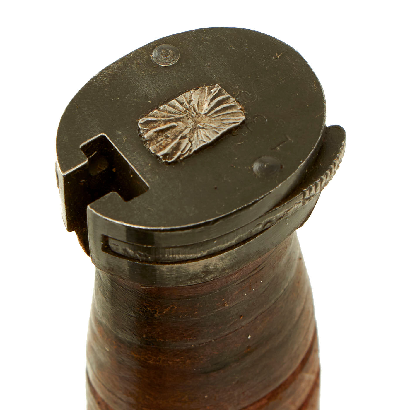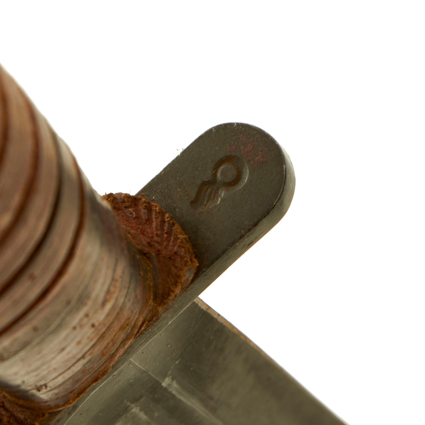 The bayonet still has the original WWII issue leather washer grip, with a bit of discoloration towards the pommel. These have not been changed out, and the leather in the grip shows some wear and light cracking. The pommel is held on by the correct "starburst" peened over tang, which with the flaming bomb proves this is definitely a WWII example, and not a later reissue.