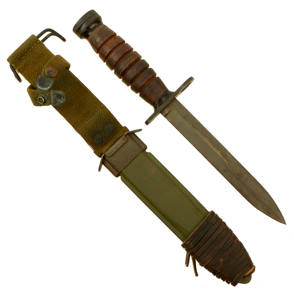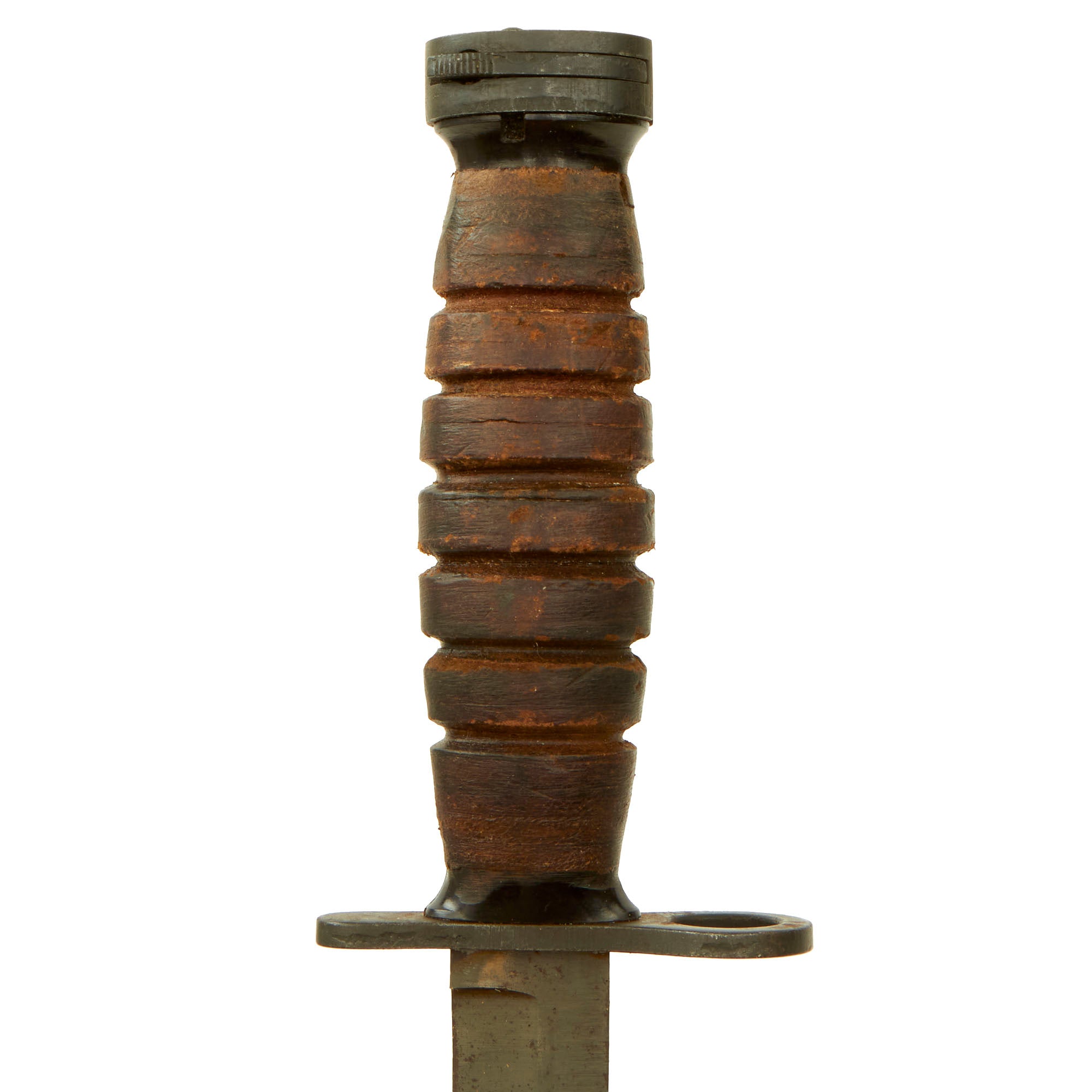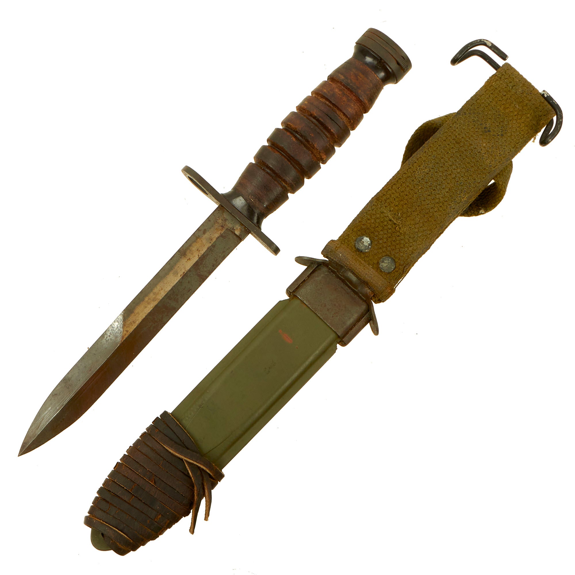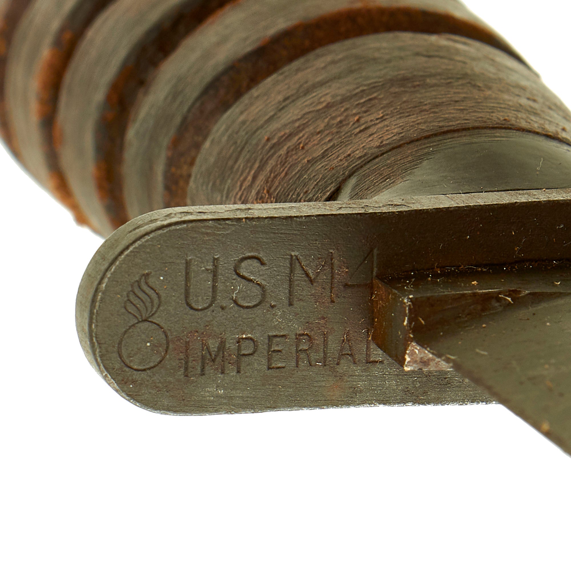 Original Item: Only One Available. This is a very nice genuine WWII U.S. Army M4 Carbine bayonet fighting knife, with an original M8 scabbard. Nicely marked U.S. M4 / IMPERIAL on the blade side of hand guard for the desirable maker, Imperial Knife Co. of Rhode Island. To the left of this is the U.S. Ordnance "Flaming Bomb". The blade is in good condition, showing light wear and sharpening, with much of the original finish still intact. There are no major dents or dings that we can see, and the crossguard, handle, and pommel are all tight to the blade.