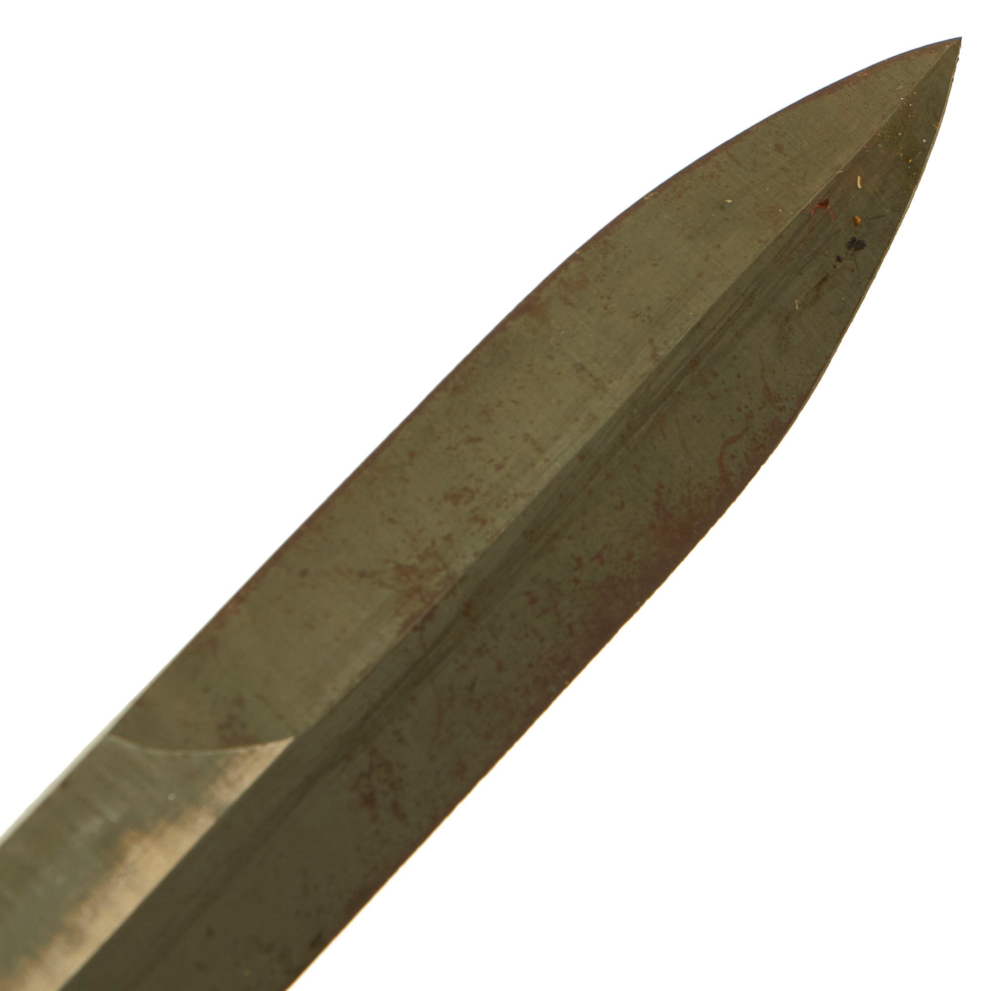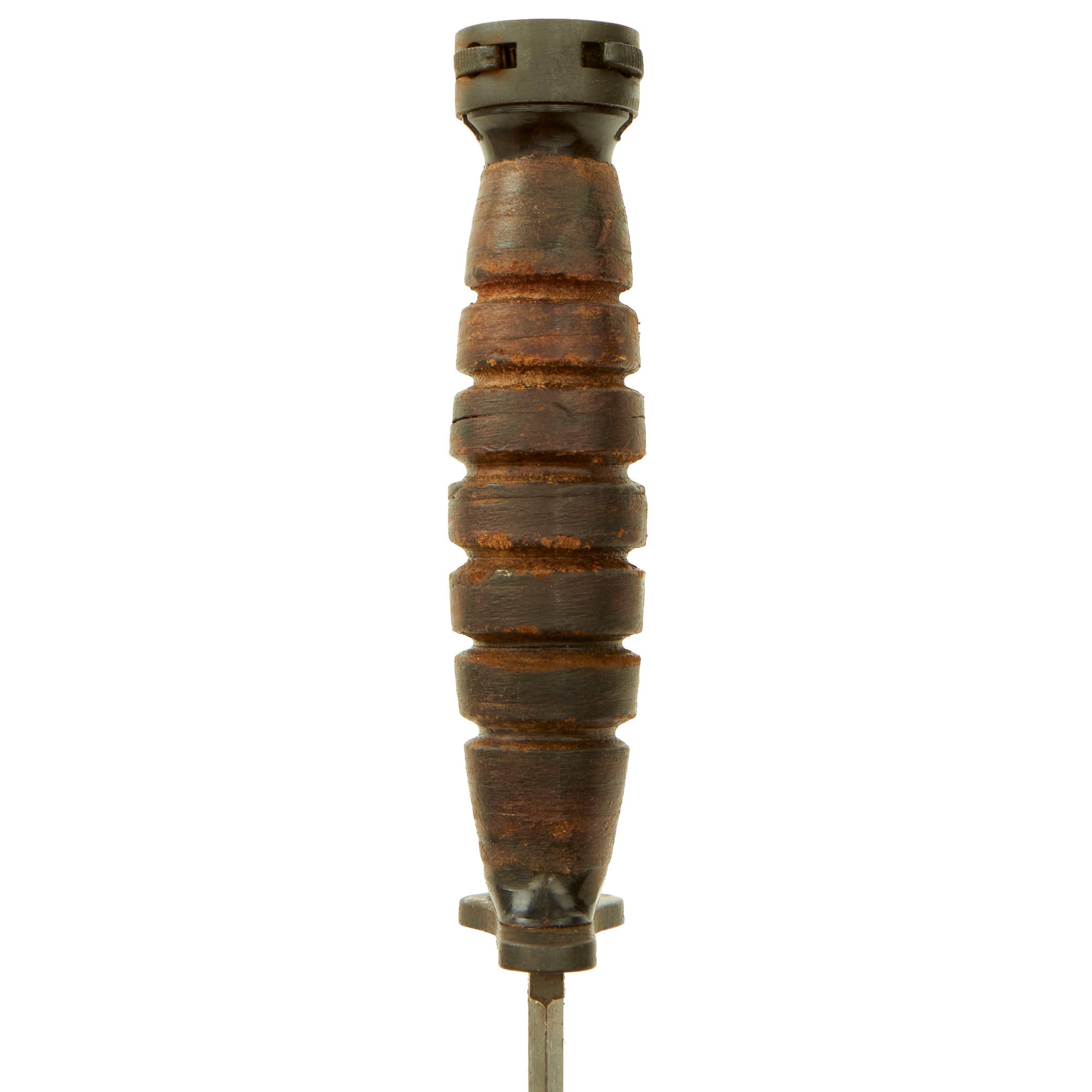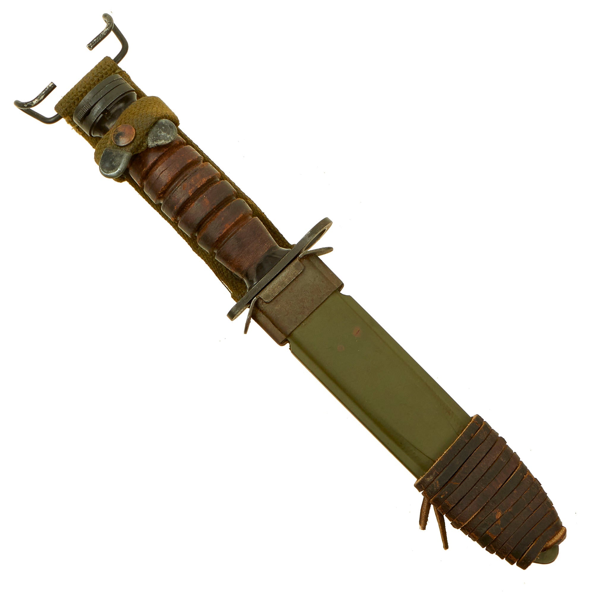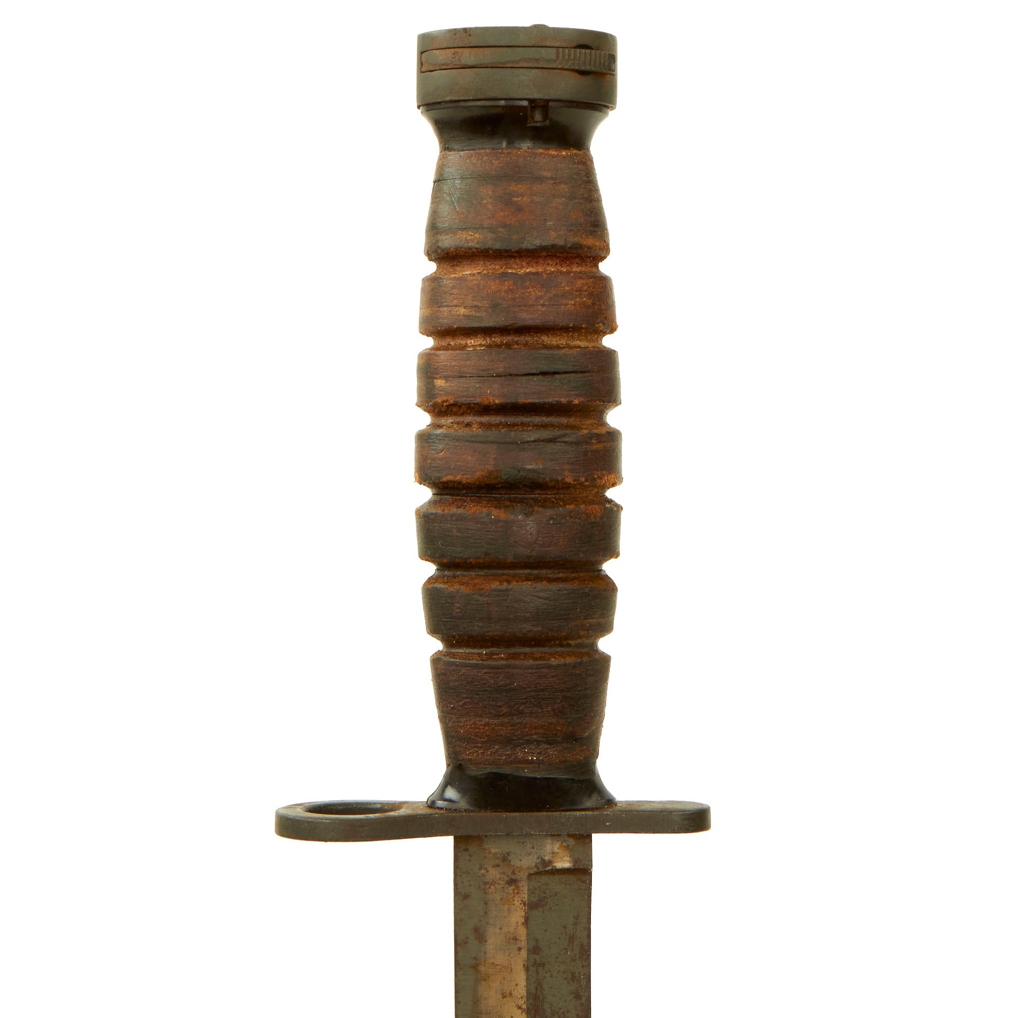 Original Item: Only One Available. This is a very nice genuine WWII U.S. Army M4 Carbine bayonet fighting knife, with an original M8 scabbard. Nicely marked U.S. M4 / IMPERIAL on the blade side of hand guard for the desirable maker, Imperial Knife Co. of Rhode Island. To the left of this is the U.S. Ordnance "Flaming Bomb". The blade is in good condition, showing light wear and sharpening, with much of the original finish still intact. There are no major dents or dings that we can see, and the crossguard, handle, and pommel are all tight to the blade.