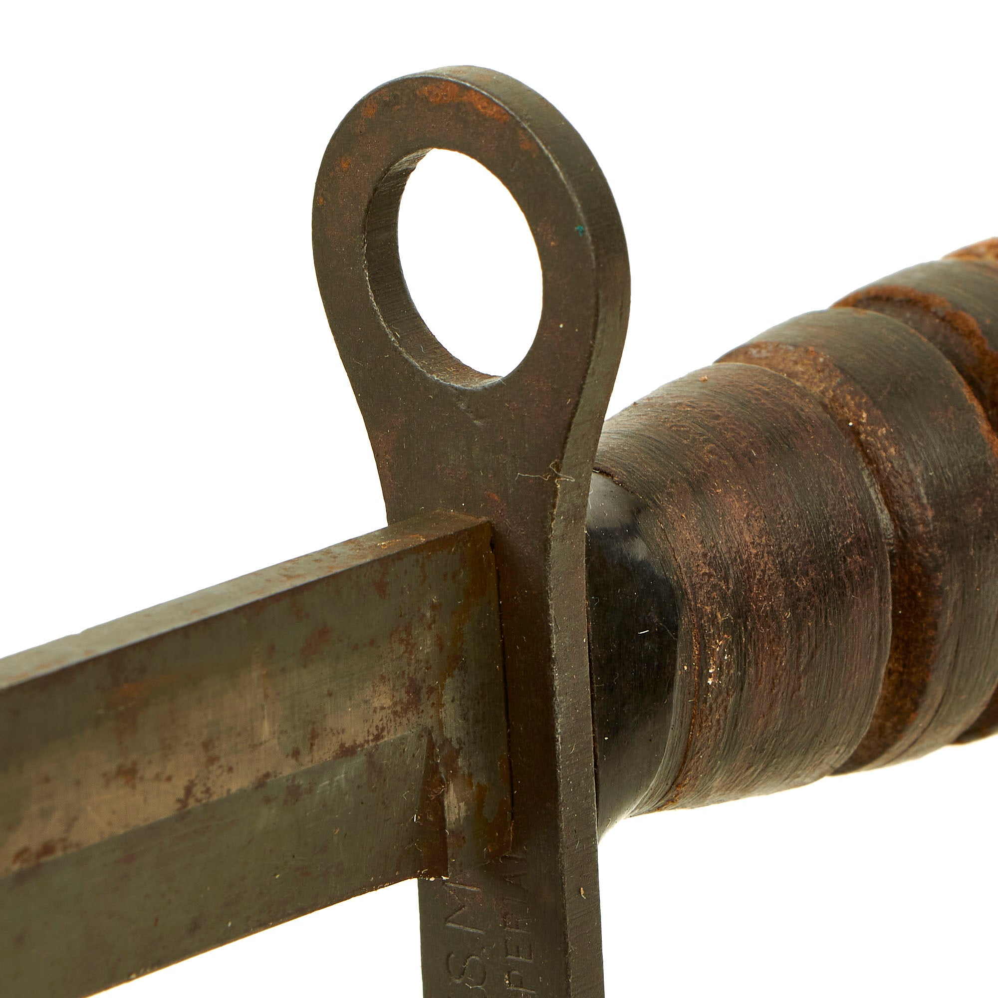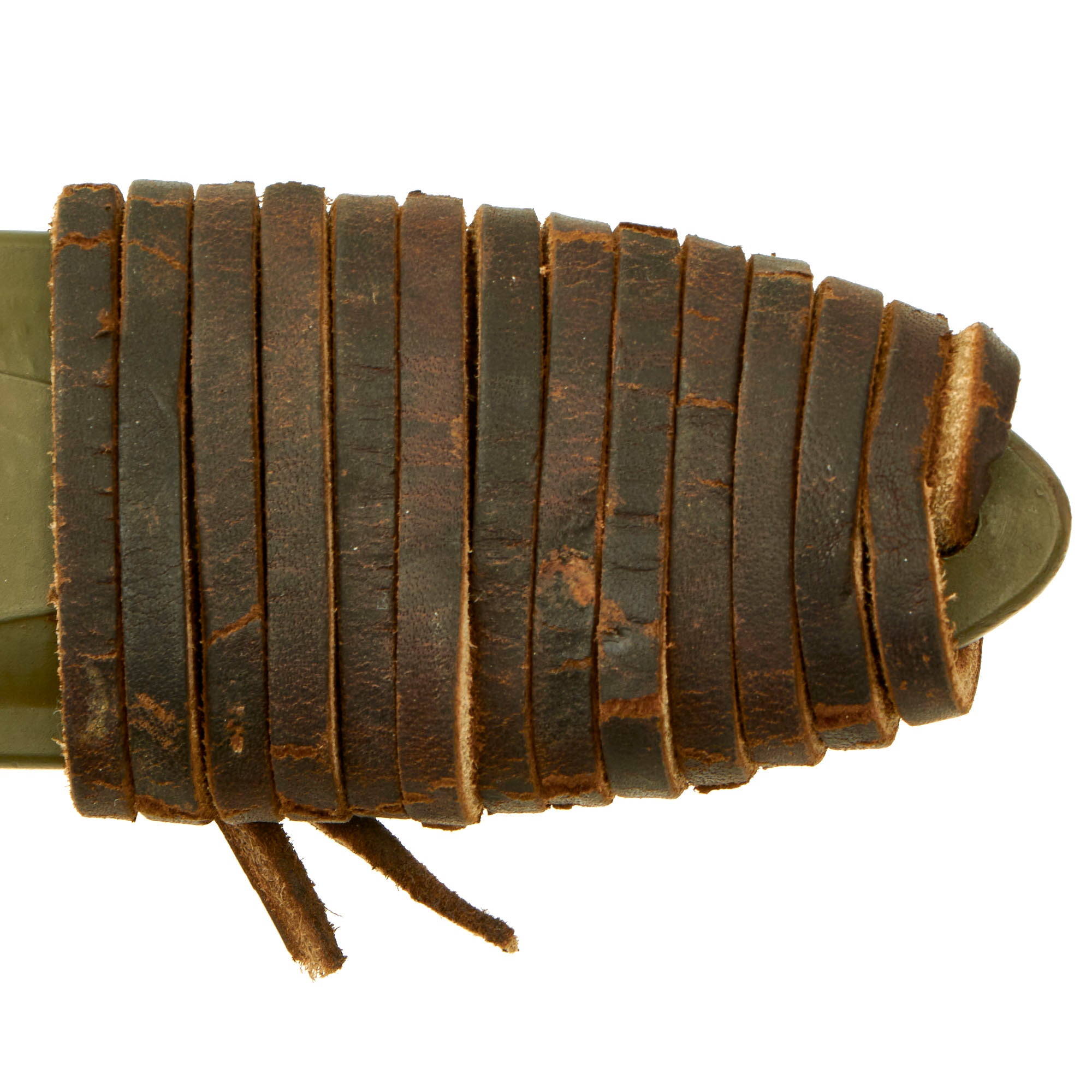 The bayonet still has the original WWII issue leather washer grip, which is in very good condition. These have not been changed out, and the leather in the grip shows only light wear, and just a bit of rounding and scuffing. The pommel is held on by the correct "Starburst" peening pattern used by many makers during WWII. The flaming bomb proves this is definitely a WWII example, and not a later reissue.